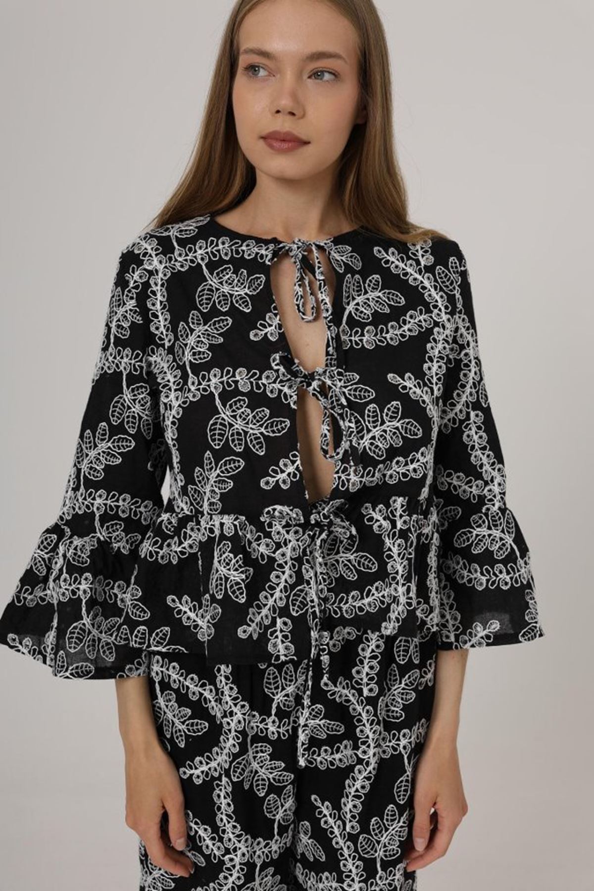Fiyonk Bağlamalı Brode Bluz - Siyah