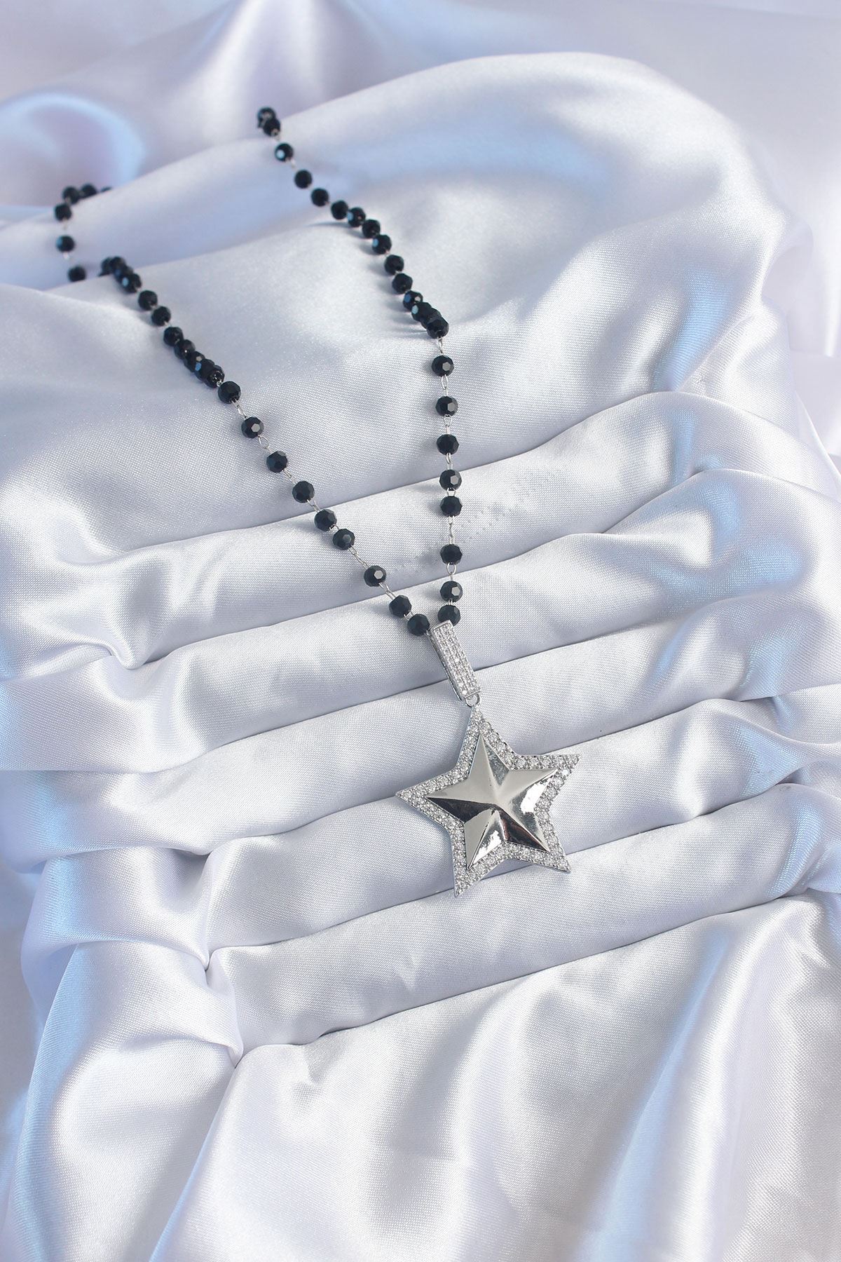 Gümüş Renk Siyah Boncuk Zirkon Taşlı Pirinç Yıldız Model VİP Seri Kadın Kolye - TJ-BKO8016