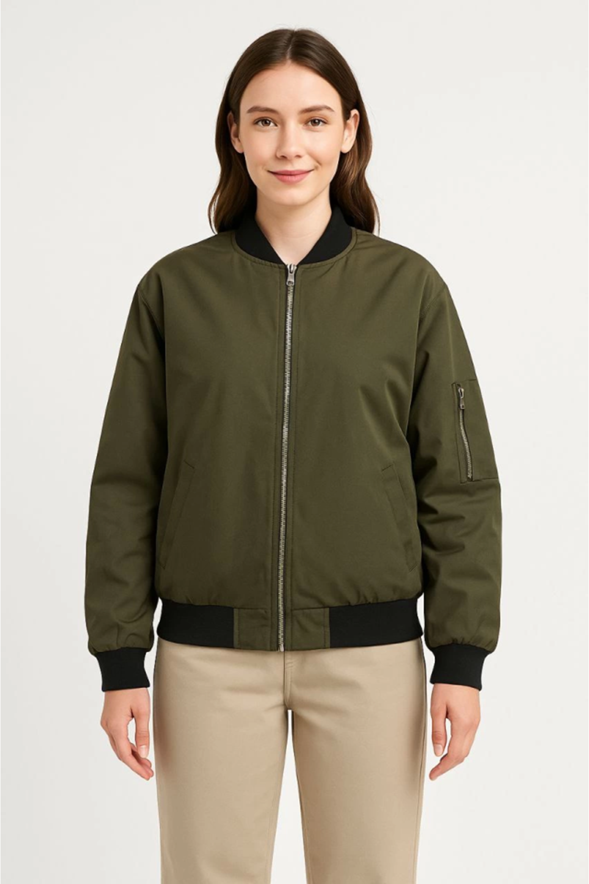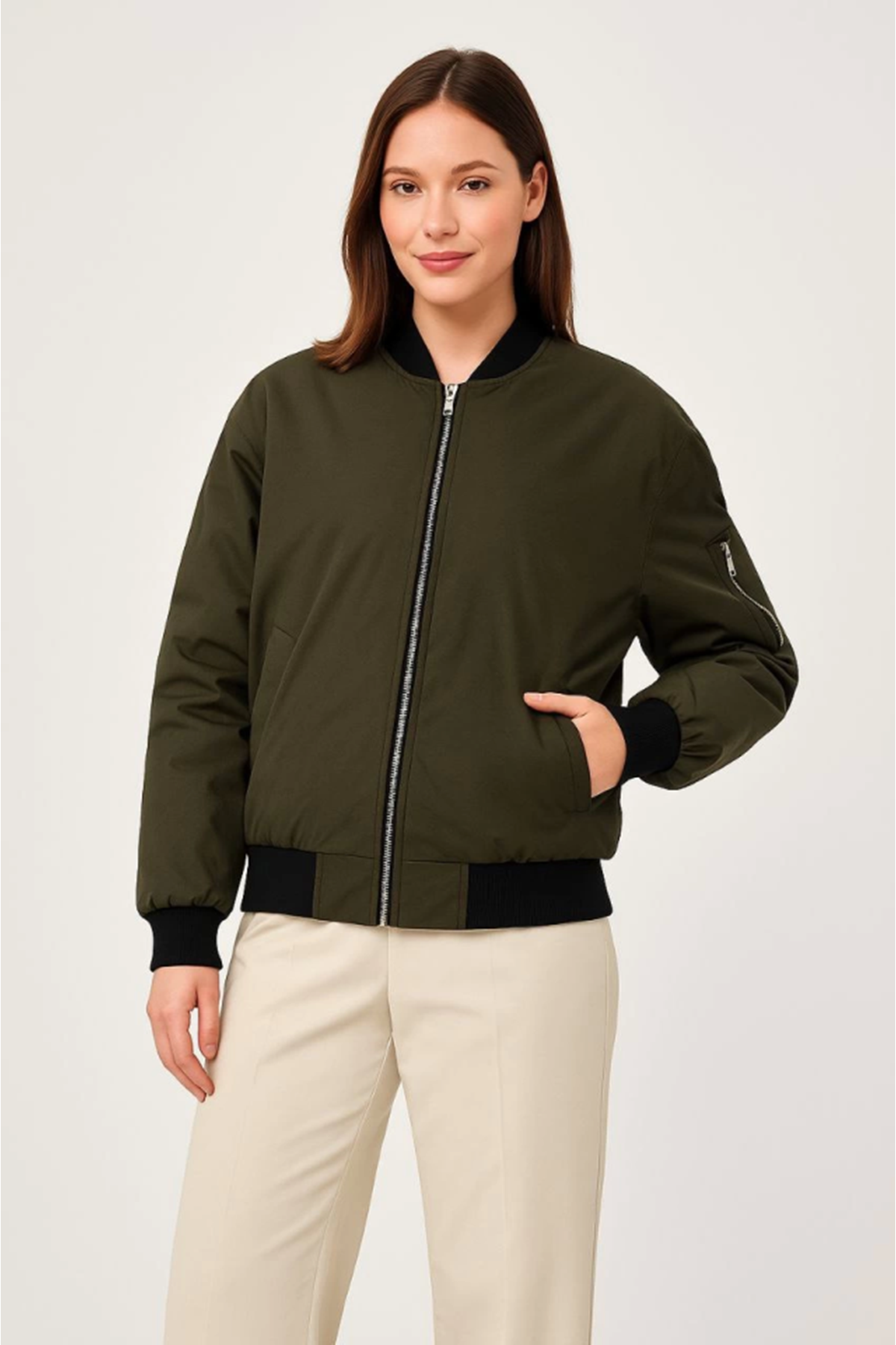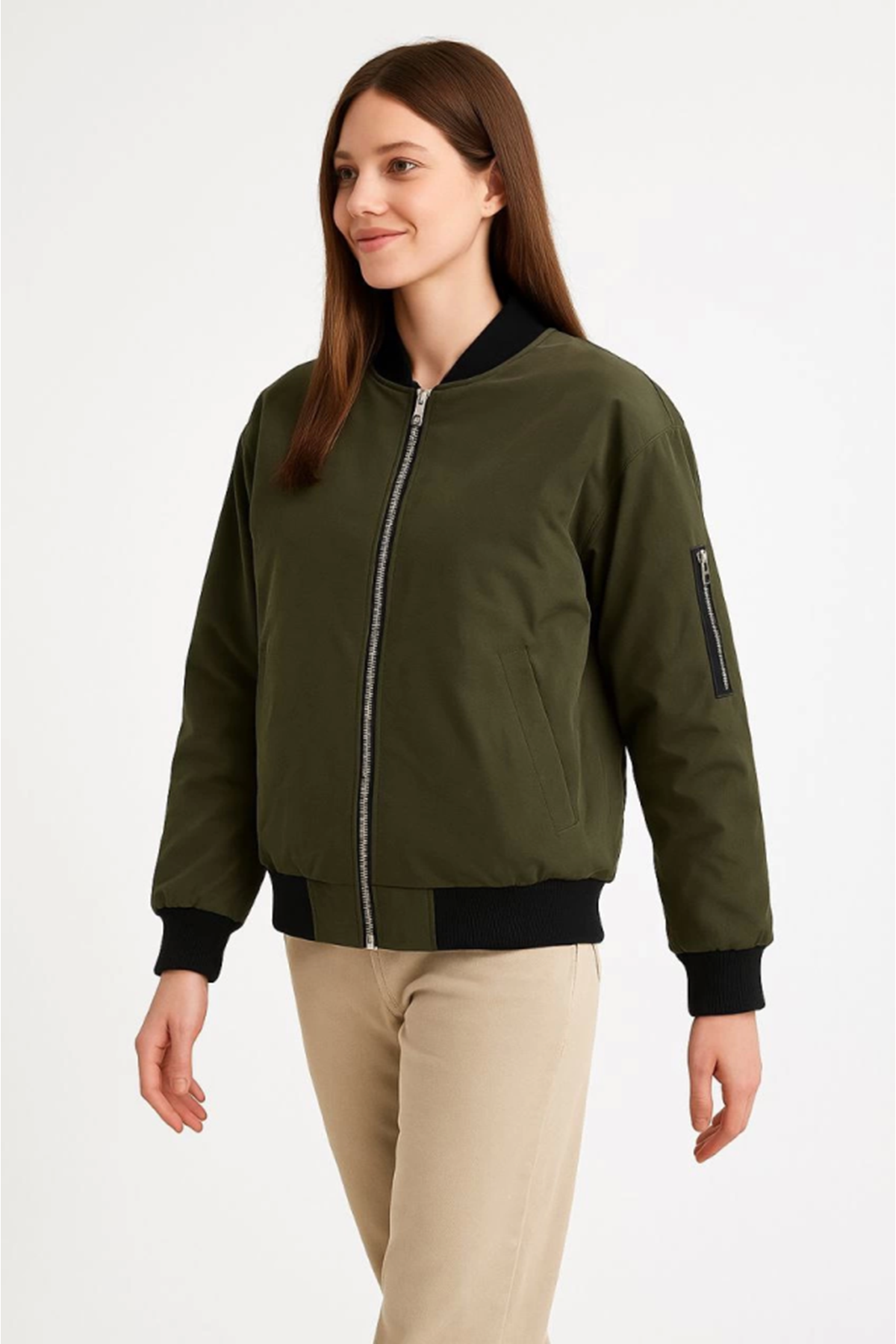 Içi Astarlı Fermuarlı Bomber Mont Ceket - Haki