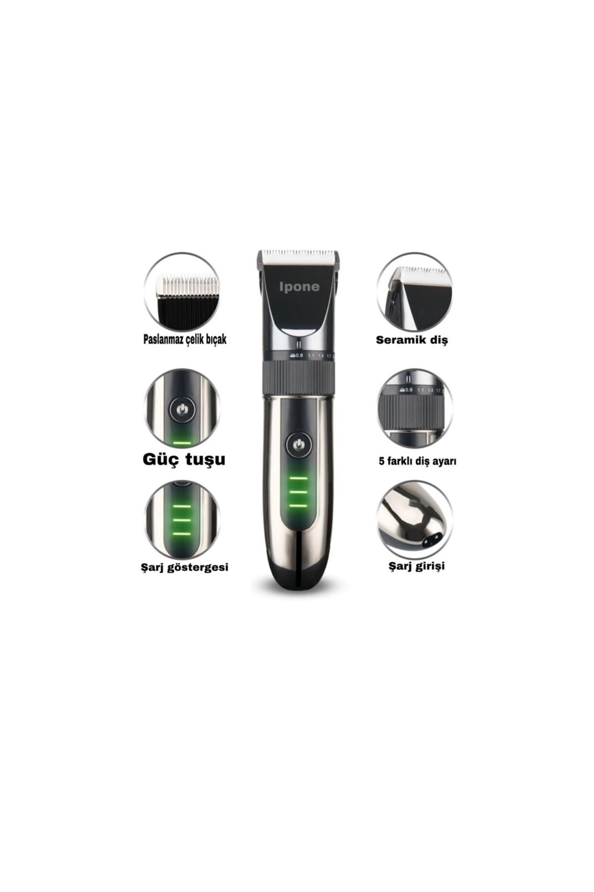 Kutu içeriğiIpone Ip1012 Traş Makinesi4 Adet Saç Kesim Taraği1 Adet Yağdanlik1 Adet Temizleme Firçasi1 Adet Tarak1 Adet Usb Sarj Kabosu* 1200 Mah Pil