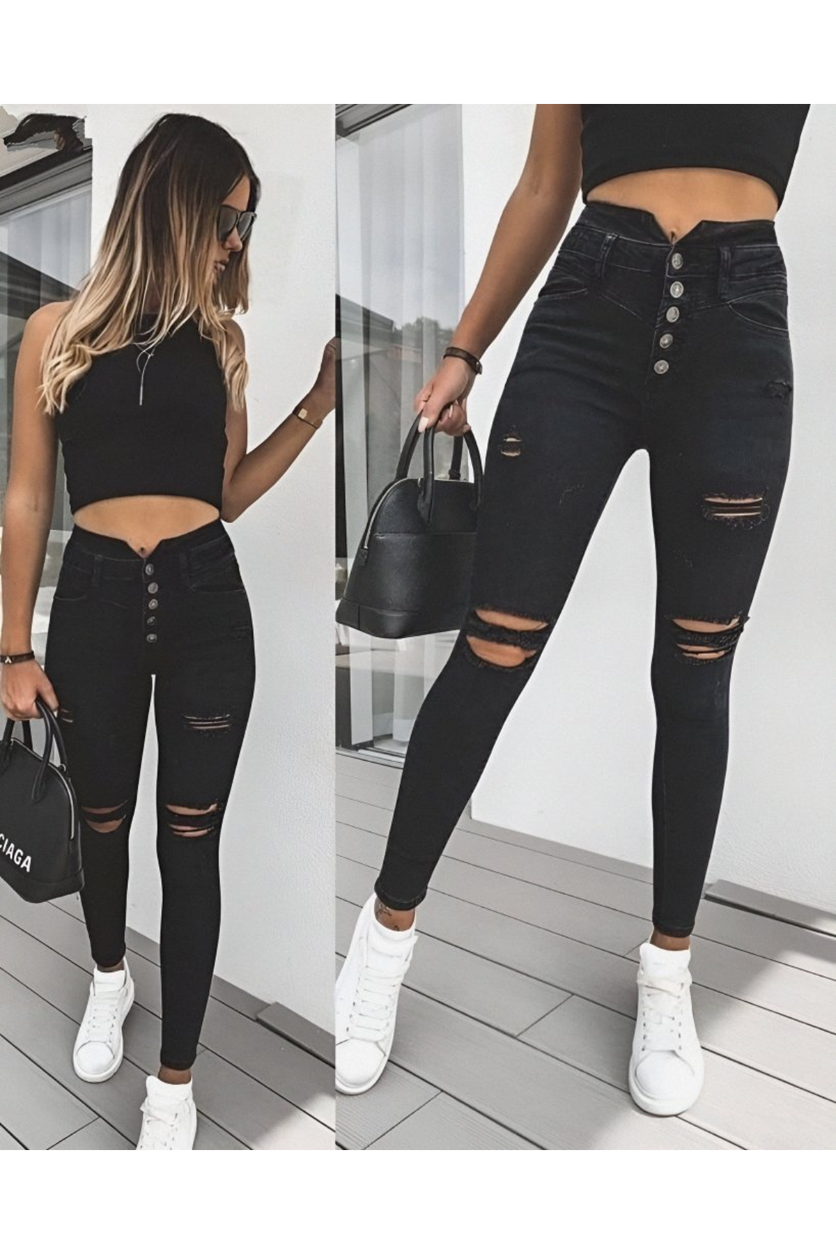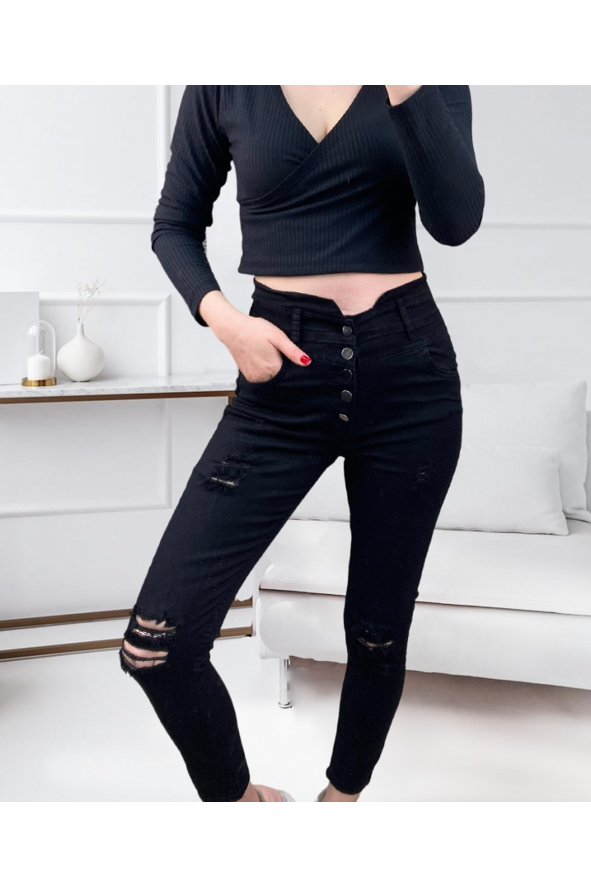 Kadın 5 Düğmeli V Detay Bel Yırtık Kot
