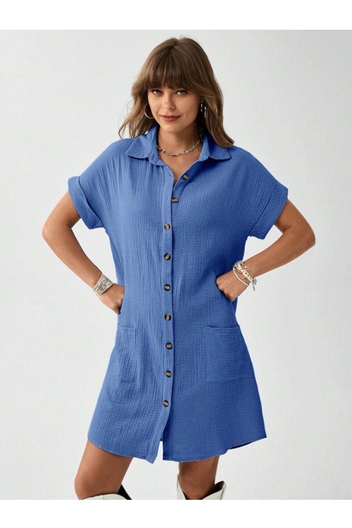 Kadın Cep Detay Müslin Kumaş Mini Gömlek Elbise