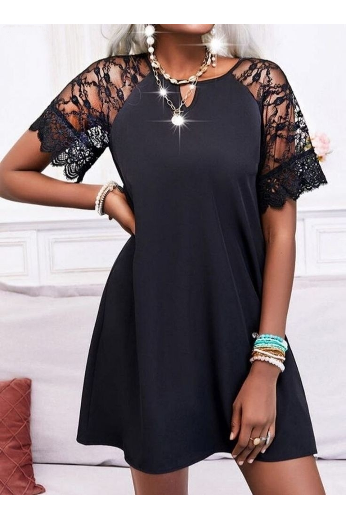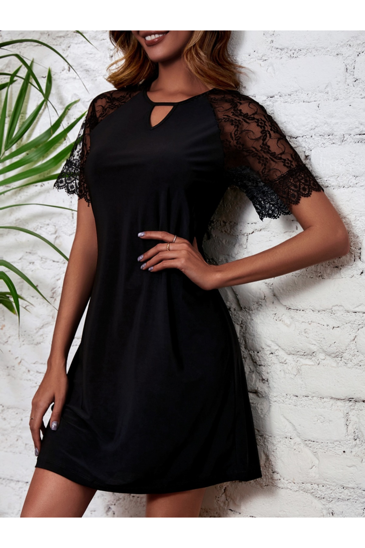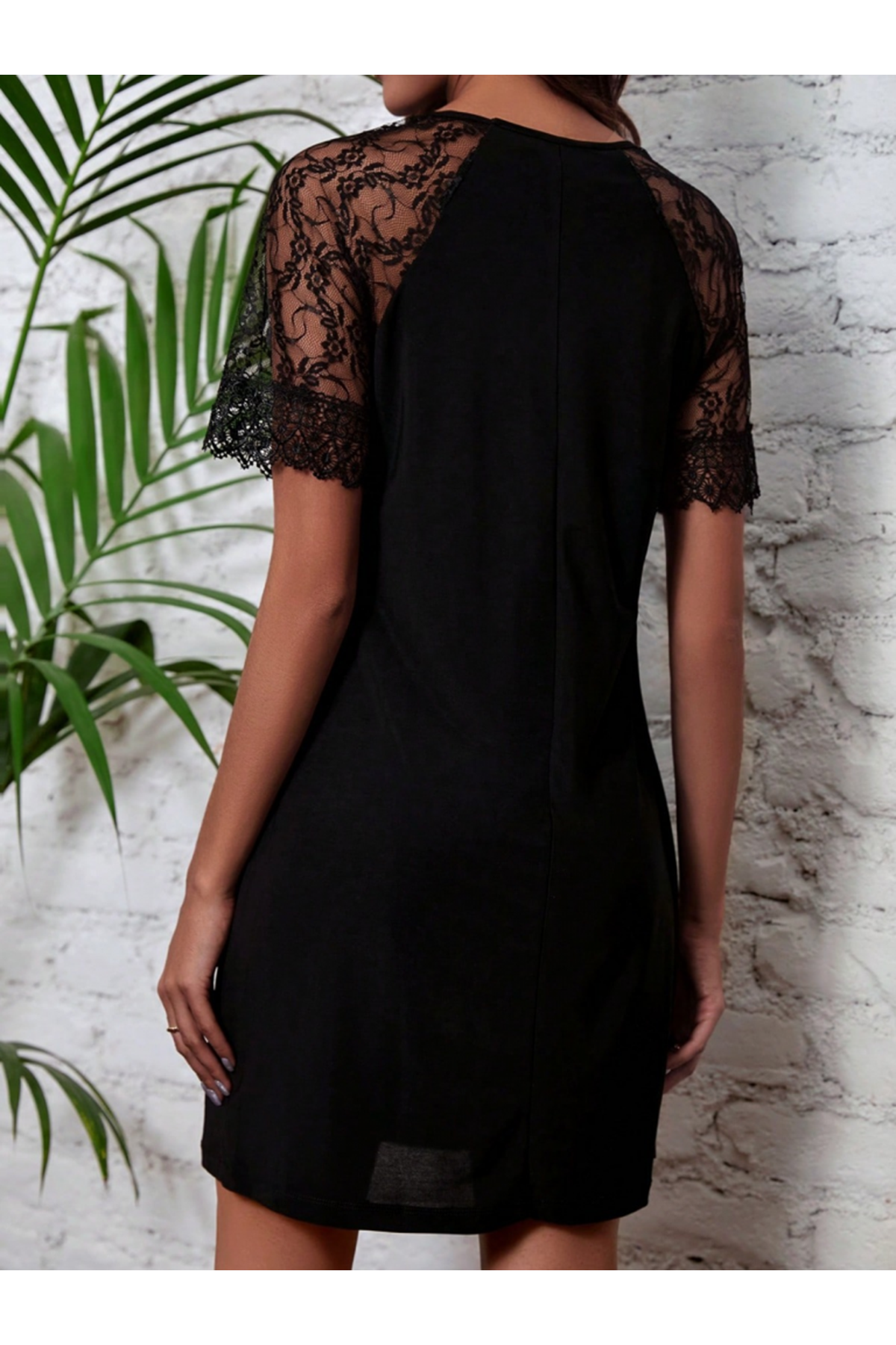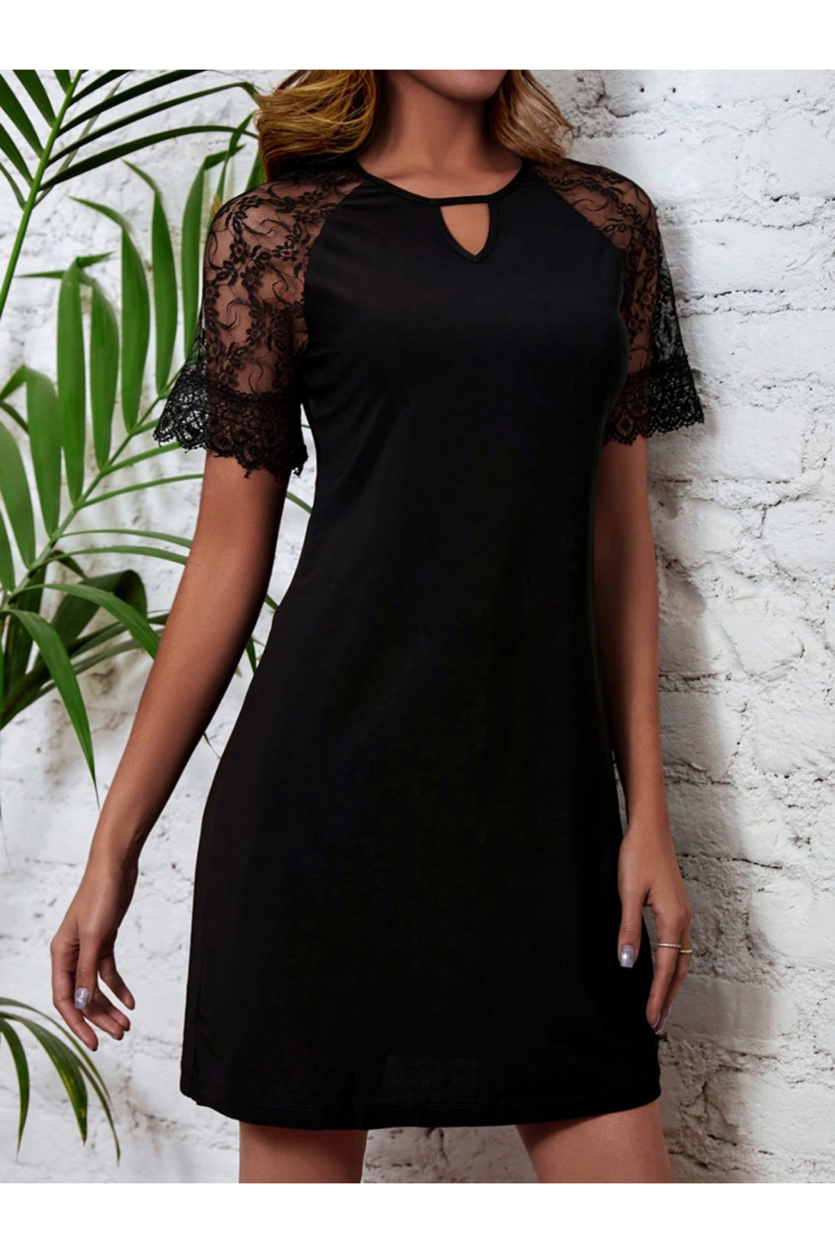 Kadın Dantelli Kısa Kollu Damla Yaka Krep Elbise