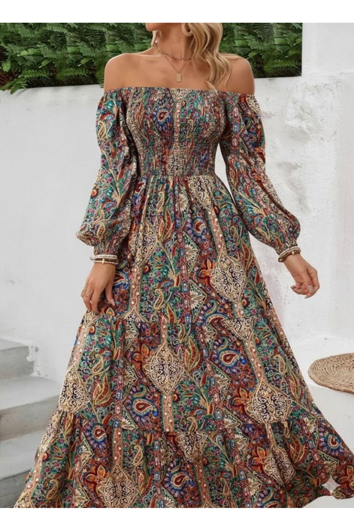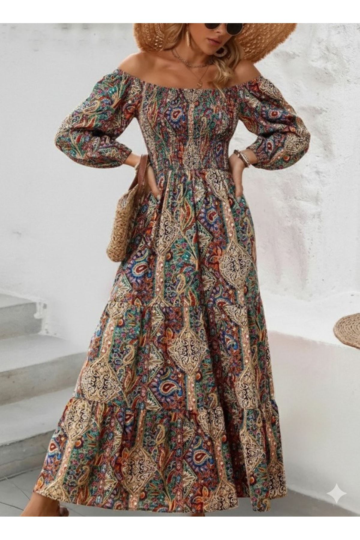 Kadın Düşük Omuzlu Beli Büzgülü Dijital Desenli Kesik Elyaf Süprem Uzun Elbise