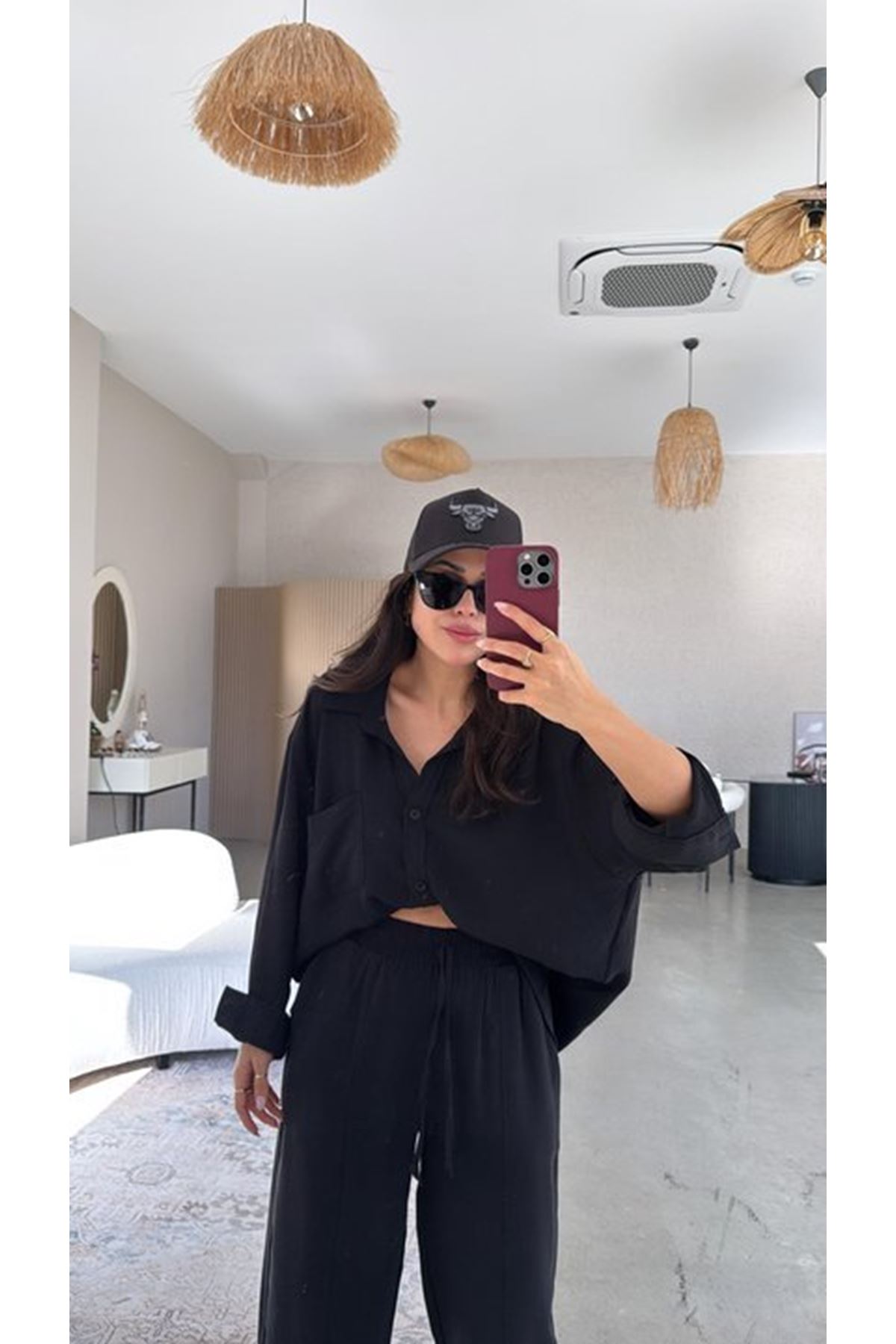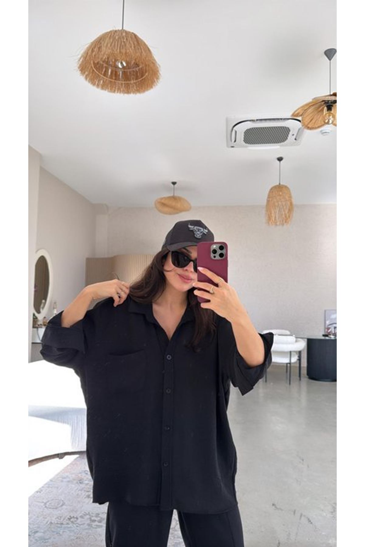 Kadın Flamlı Keten Tek Cep Oversızed Gömlek