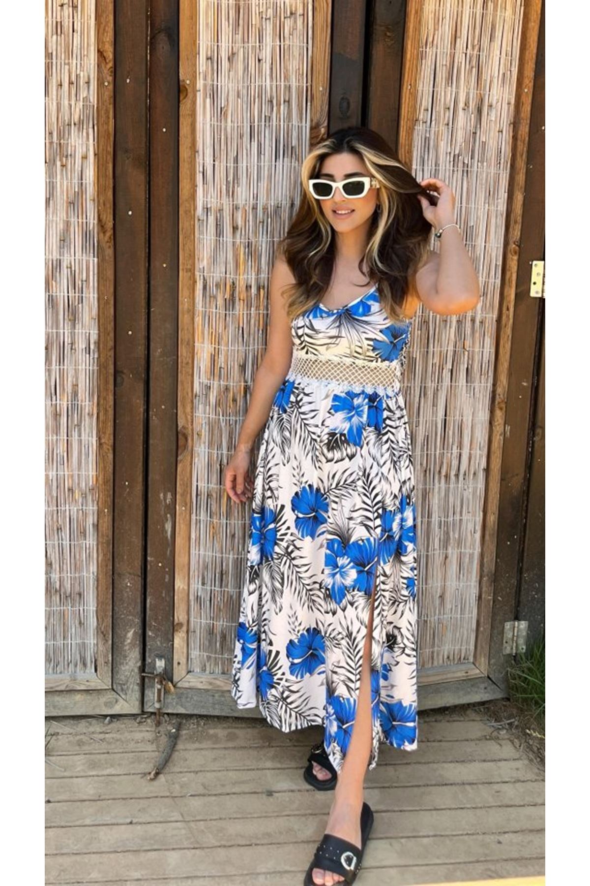 Kadın Ip Askılı V Yakalı Bel Güpür çiçek Desenli Yandan Yırtmaçlı Maksi Süprem Elbise