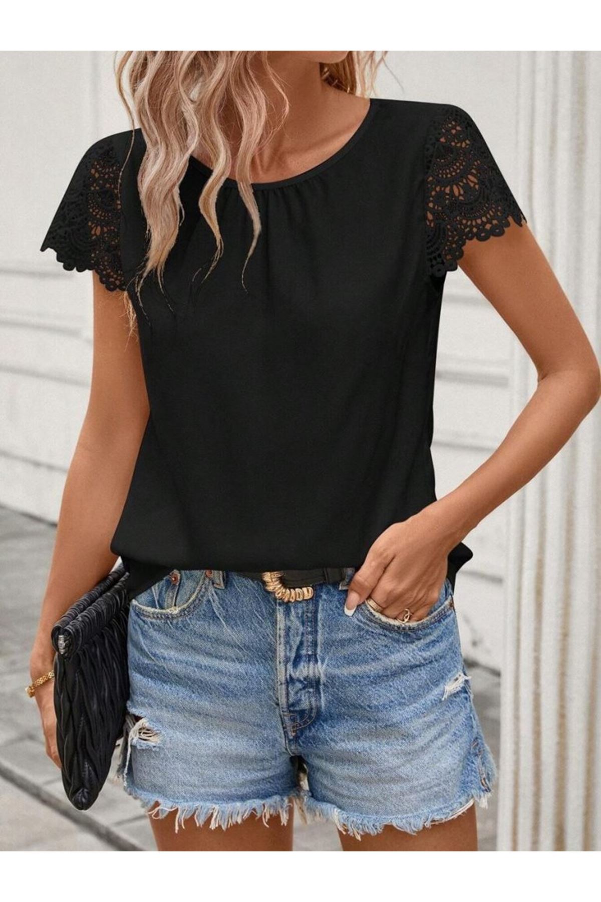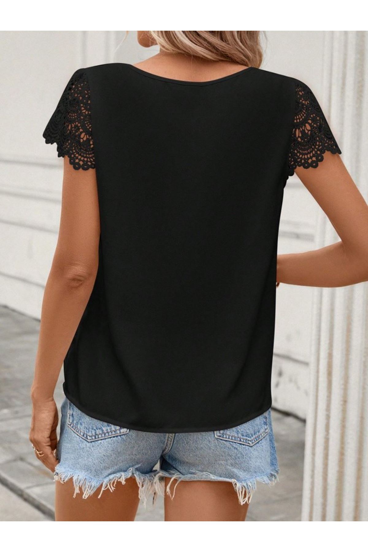Kadın Kısa Dantel Kollu Bisiklet Yaka Sandy Bluz