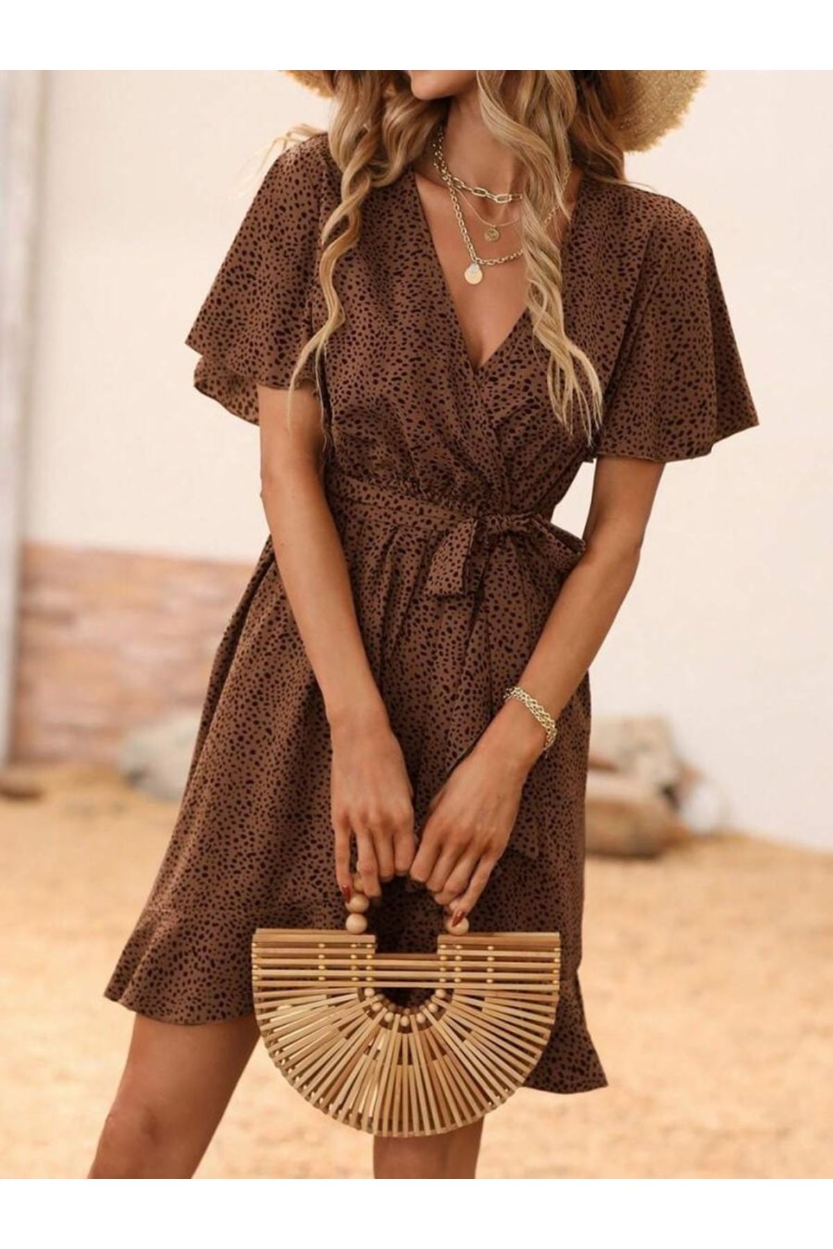 Kadın Kısa Kelebek Kollu Kruvaze Yakalı Belden Kuşaklı Kısa Desenli Süprem Elbise