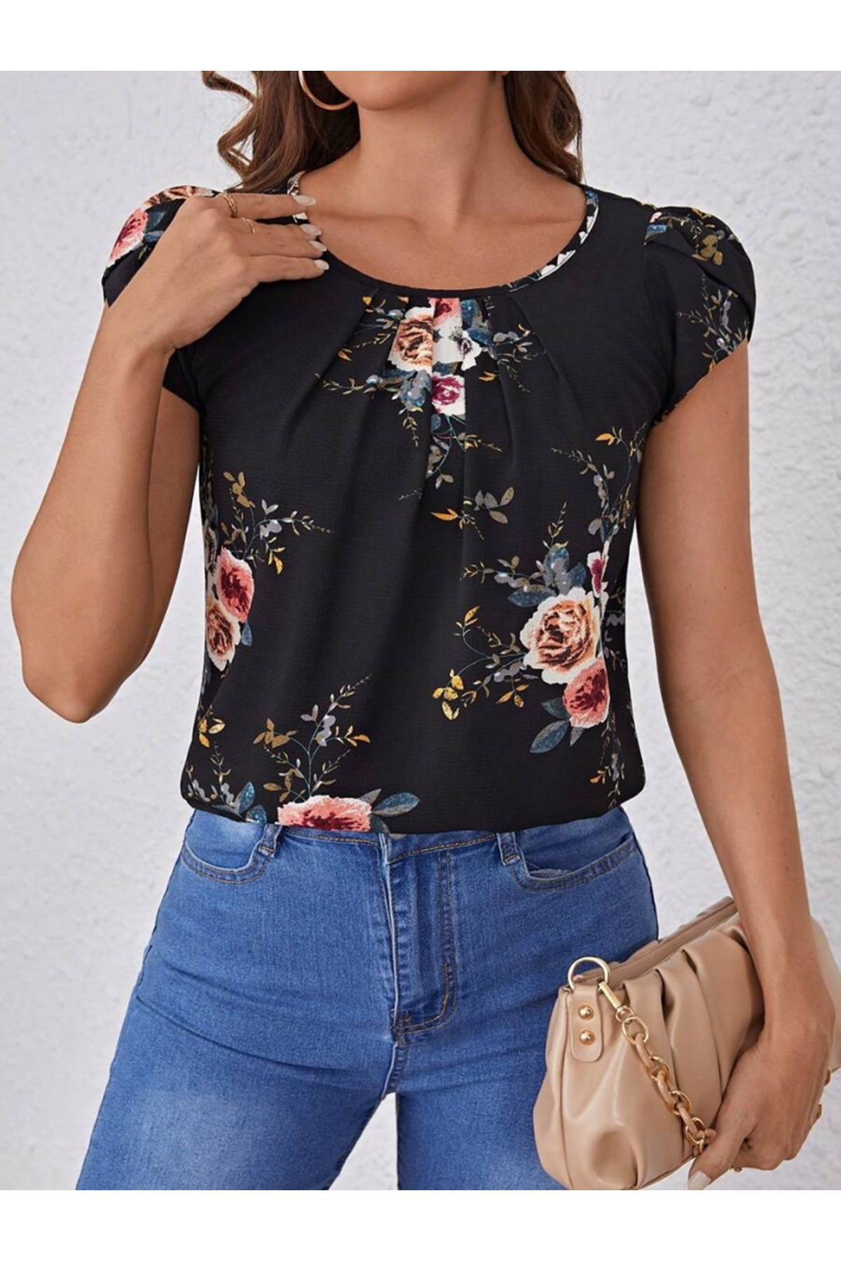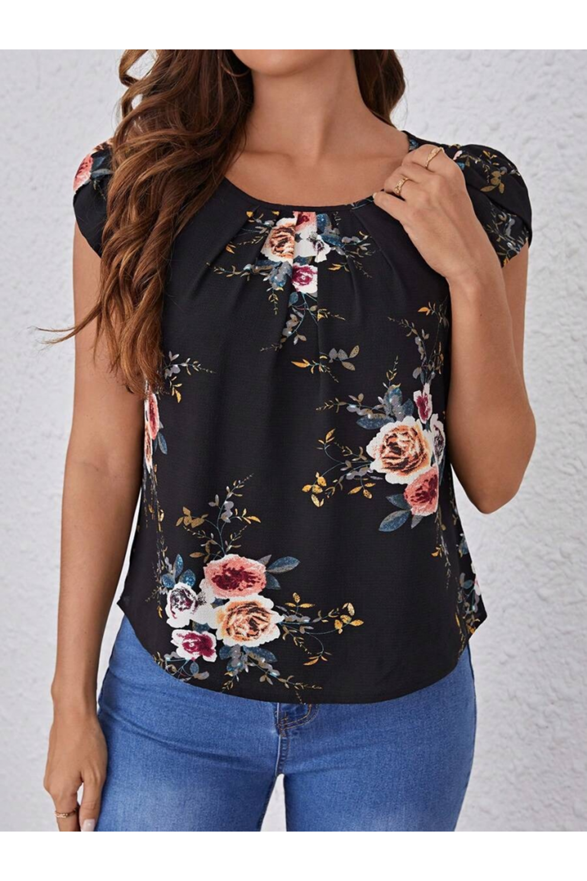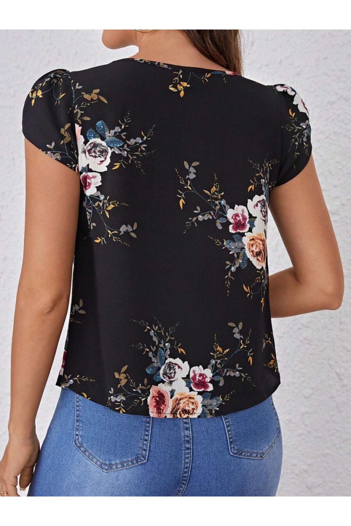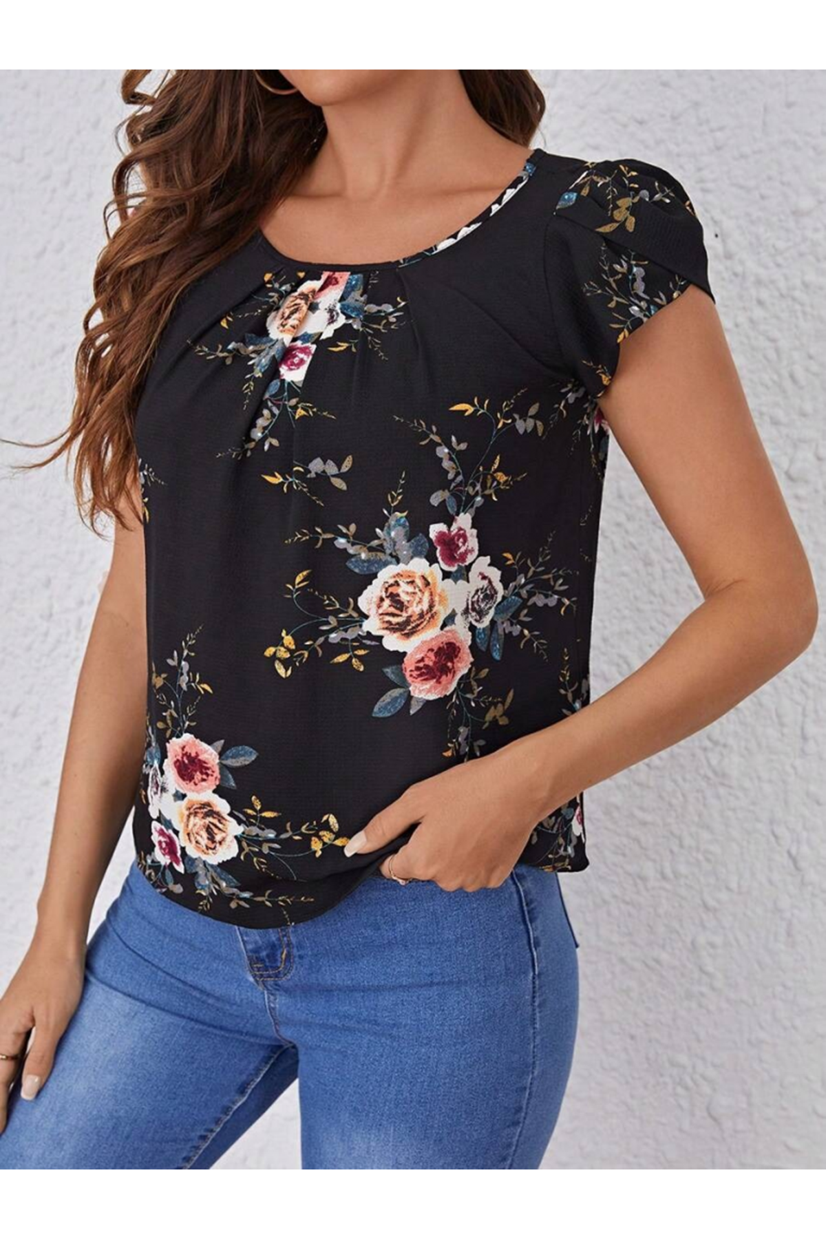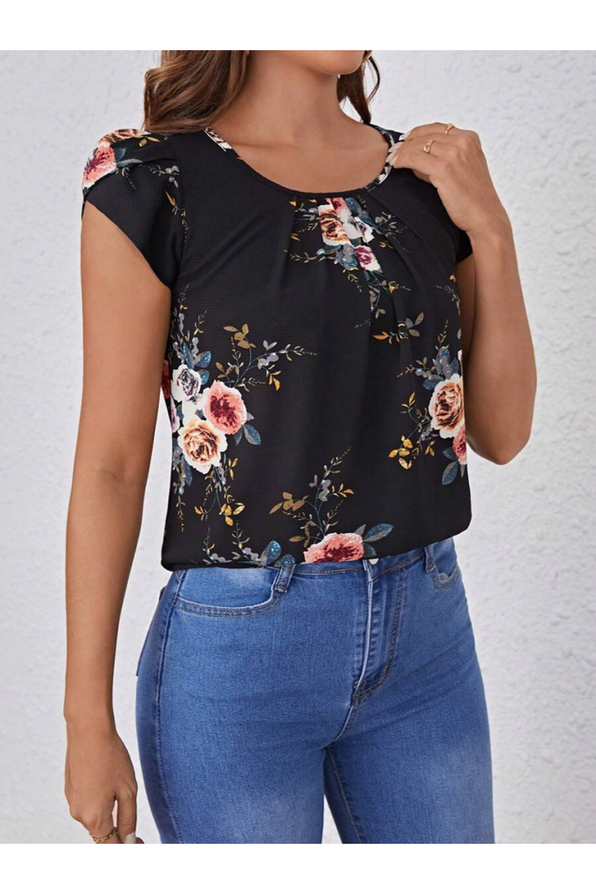 Kadın Kısa Kollu Bisiklet Yaka çiçek Baskılı Süprem Bluz