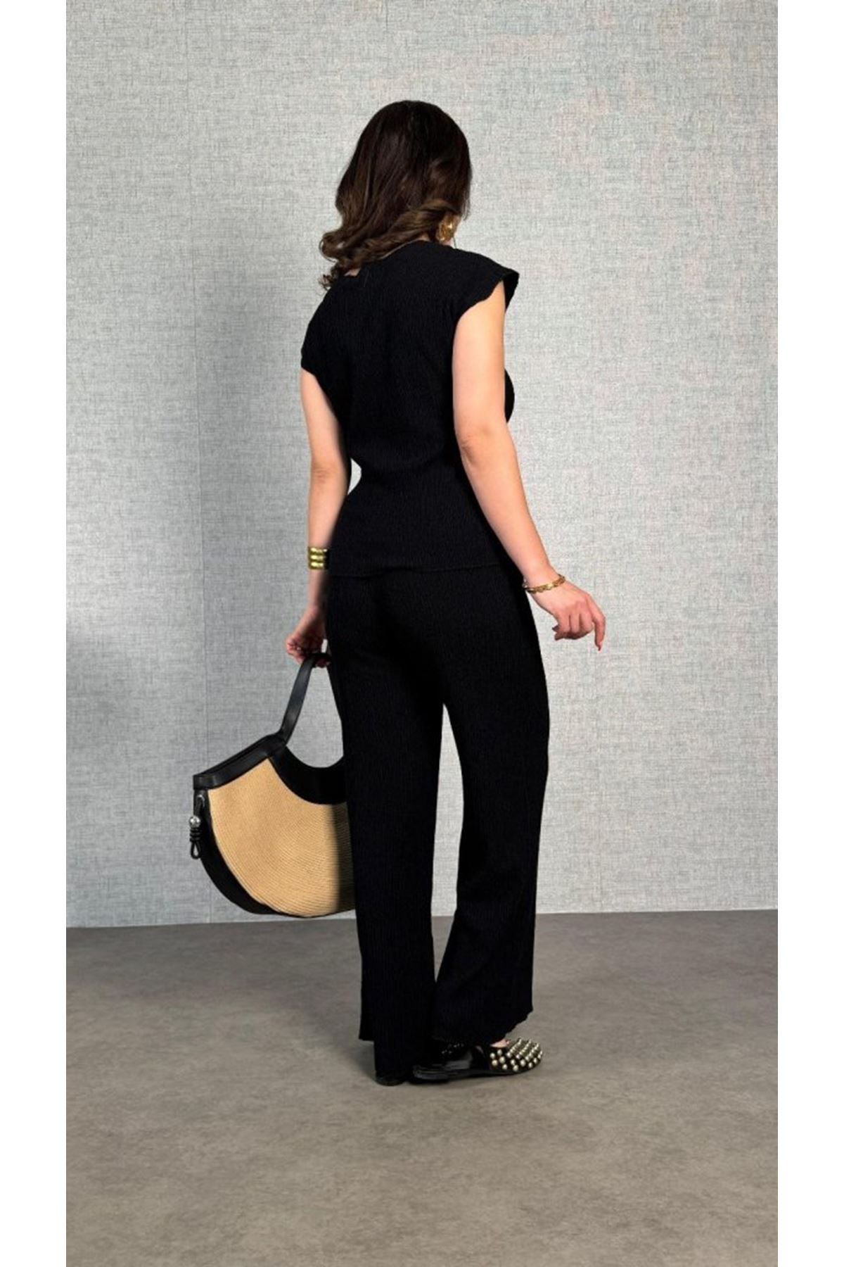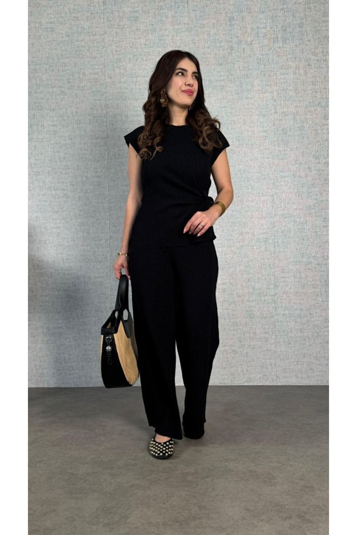 Kadın Kısa Kollu Bisiklet Yaka Yandan Bağlamalı Bürümcük Bluz Ve Pantolon Ikili Takım
