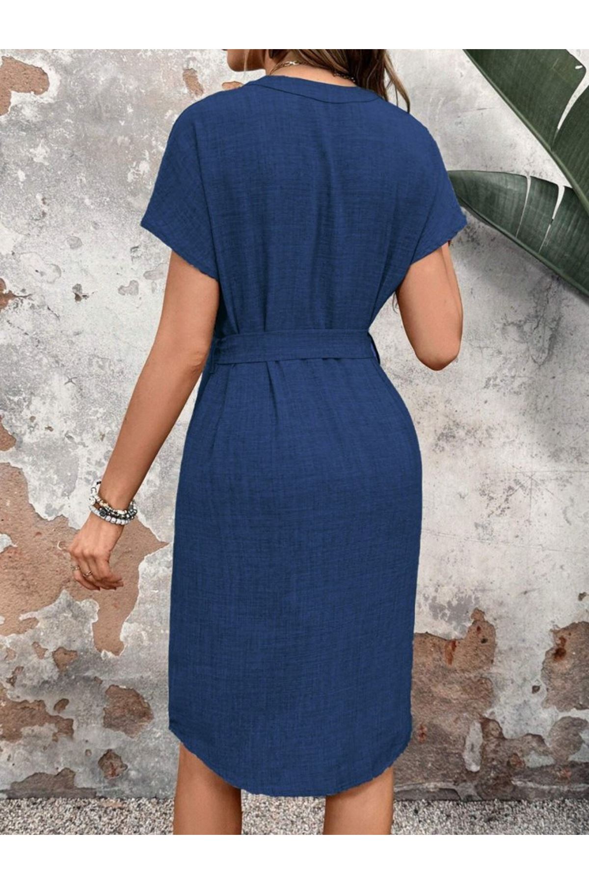 Kadın Kısa Kollu V Hakim Yaka Belden Kuşaklı Valencia Elbise