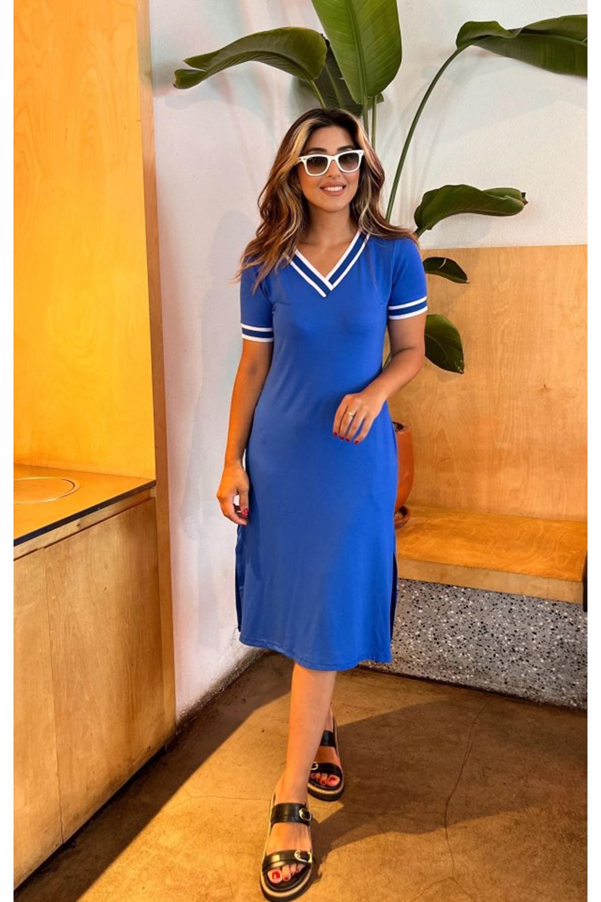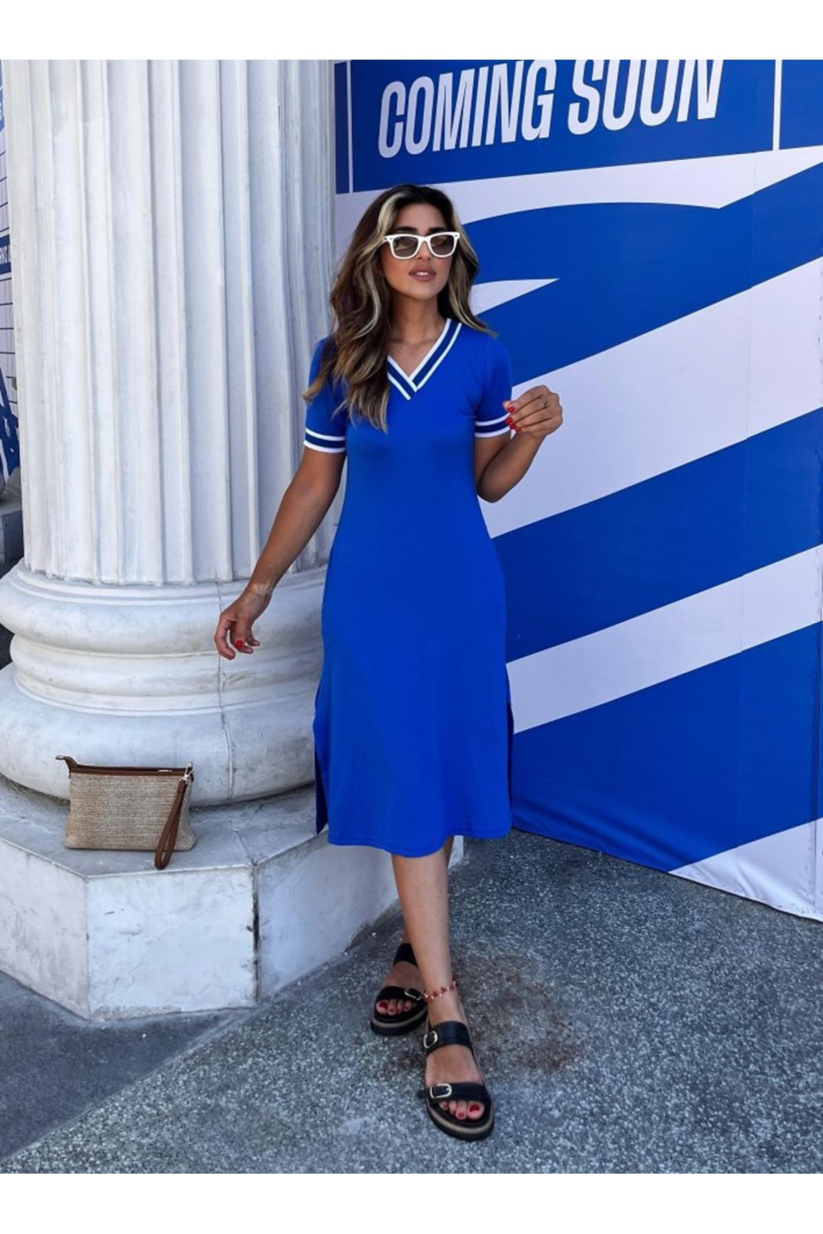 Kadın Kısa Kollu V Yaka Ve Yaka Ribana Detay Midiboy Viskon Elbise