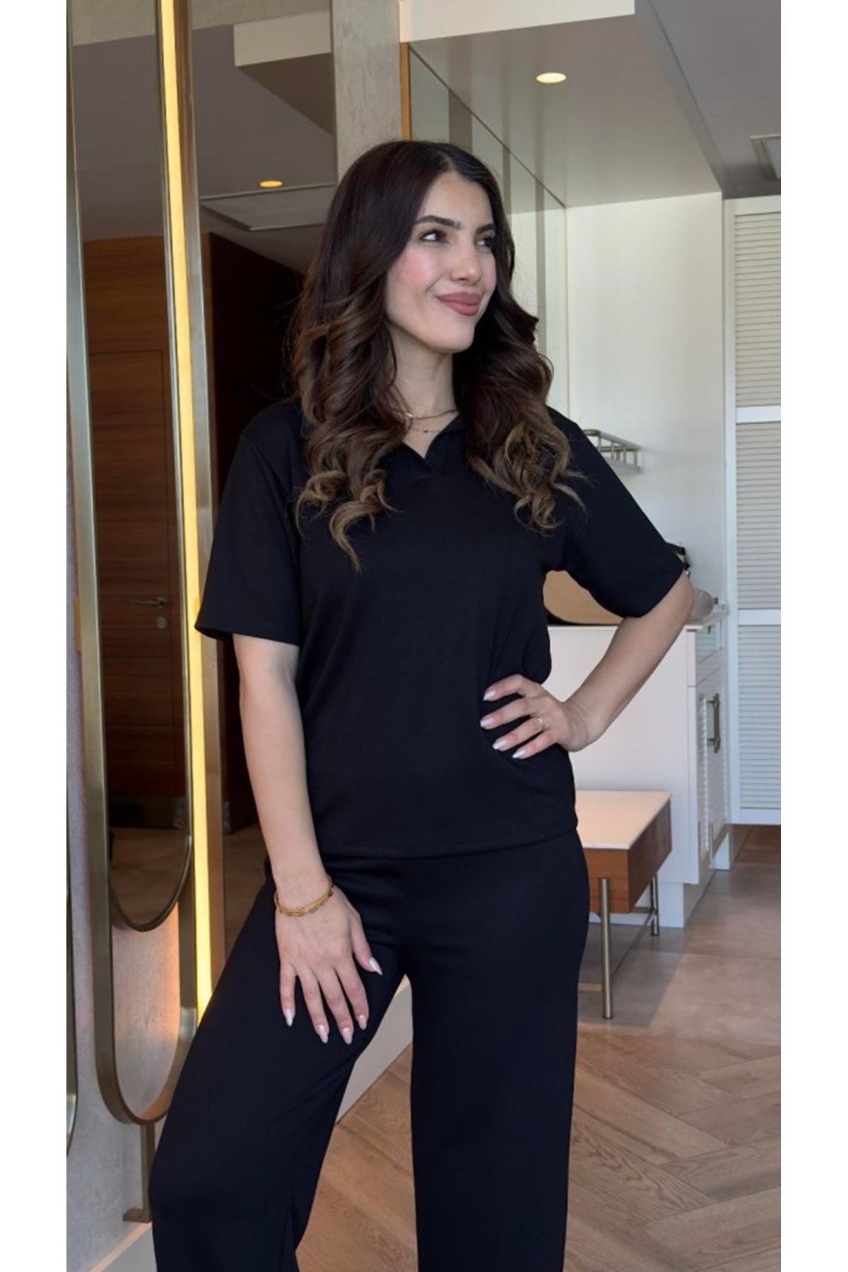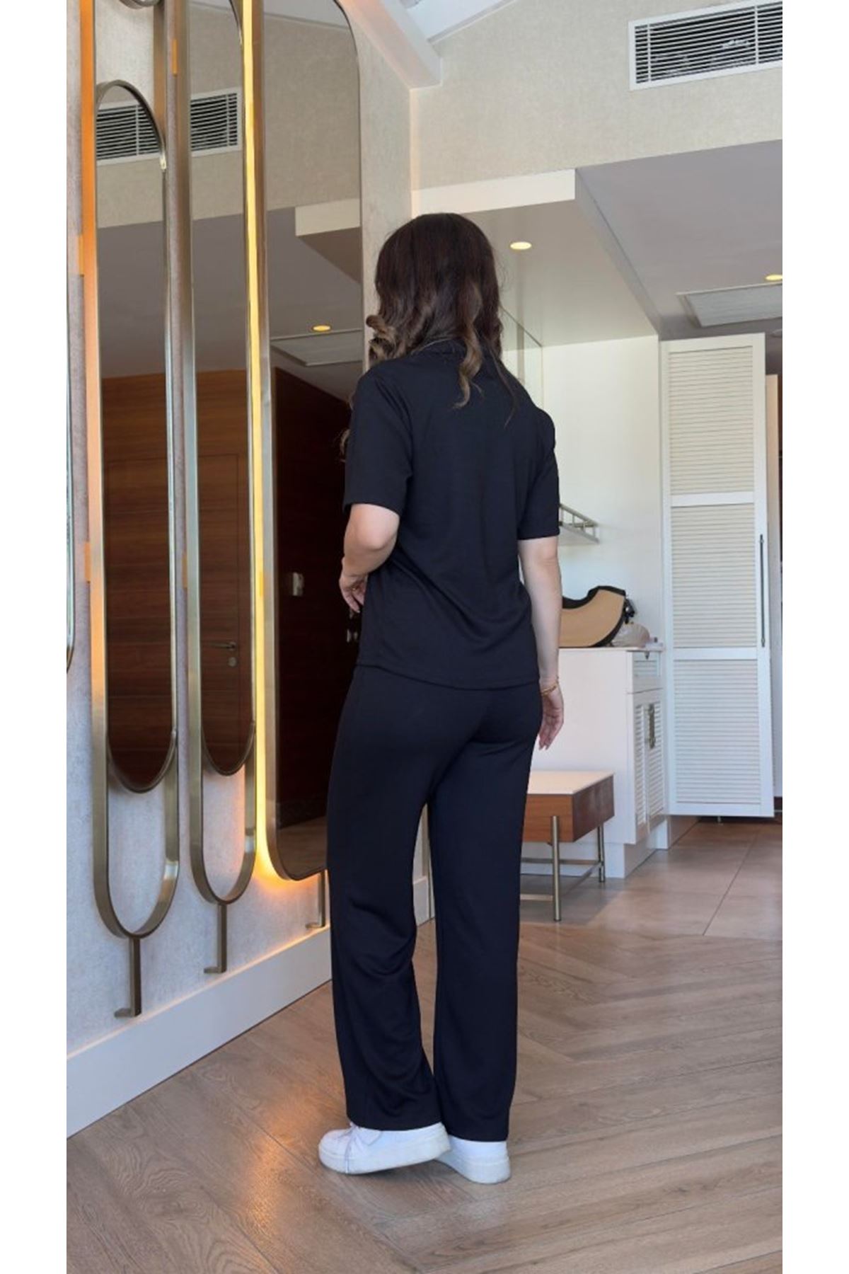 Kadın Kısa Kollu Yakalı Viskon Iki Iplik Bluz Ve Pantolon Ikili Takım