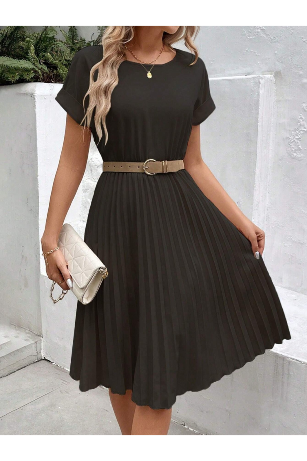 Kadın Kısa Kollu Yakası Açık Belden Lastikli Pileli Kısa Ithal Krep Elbise