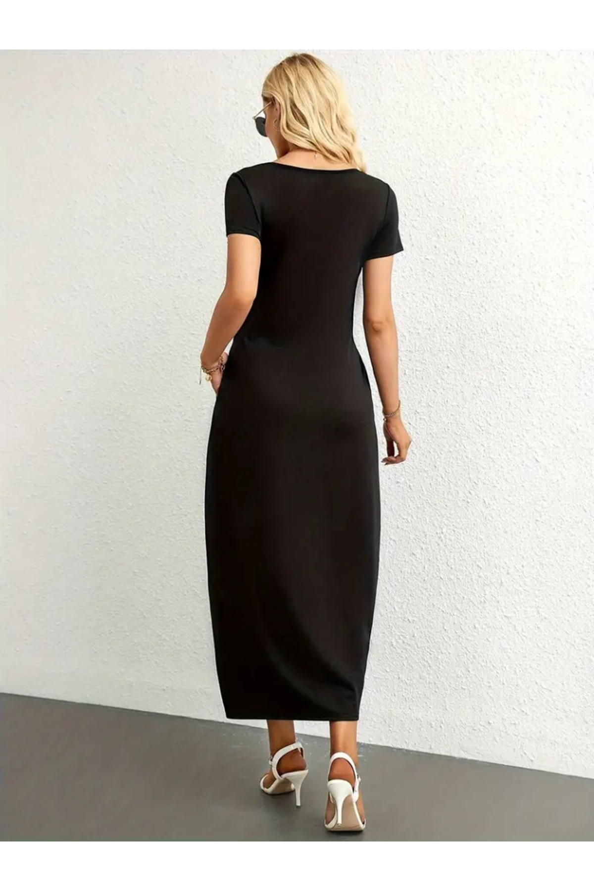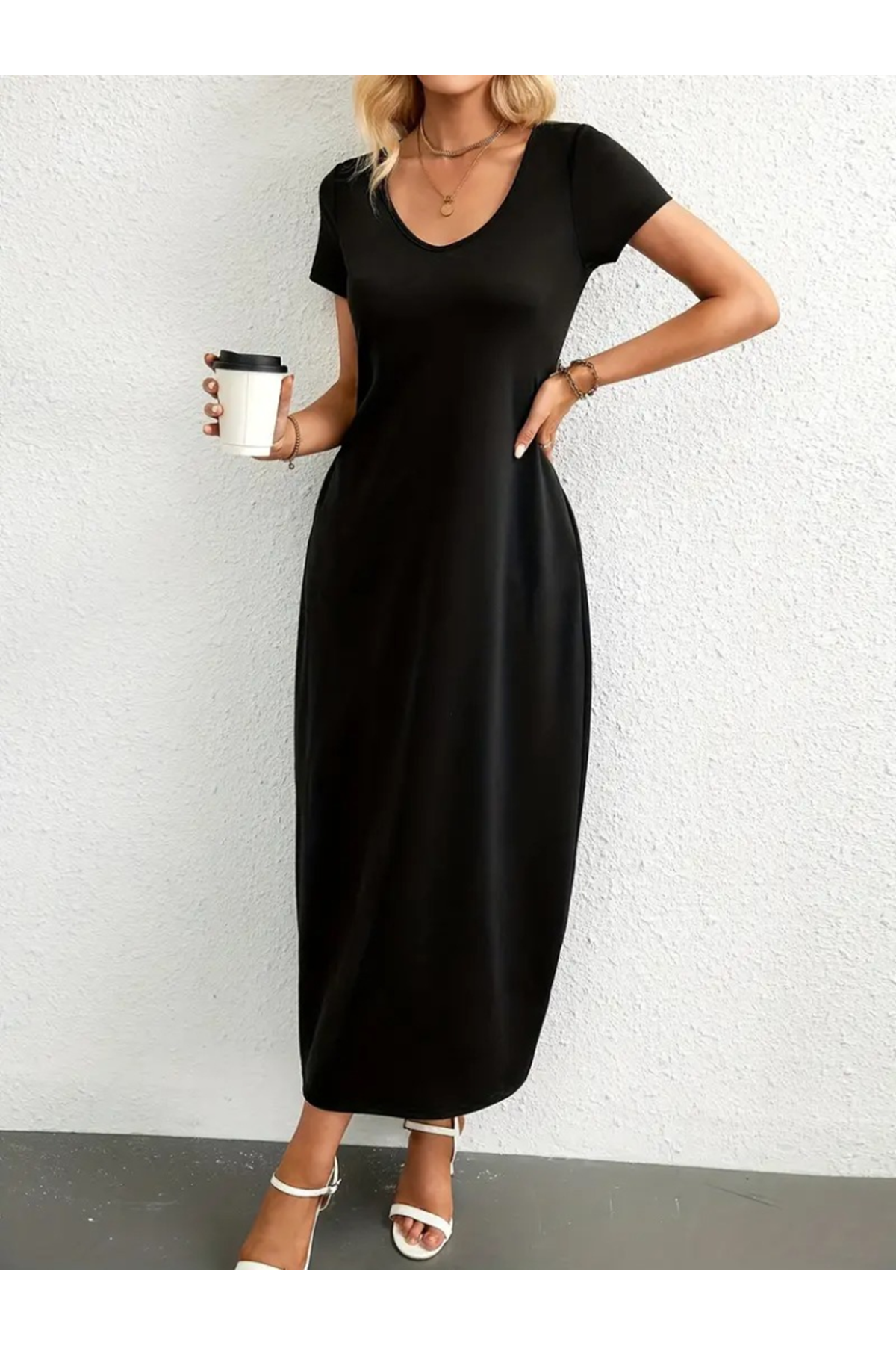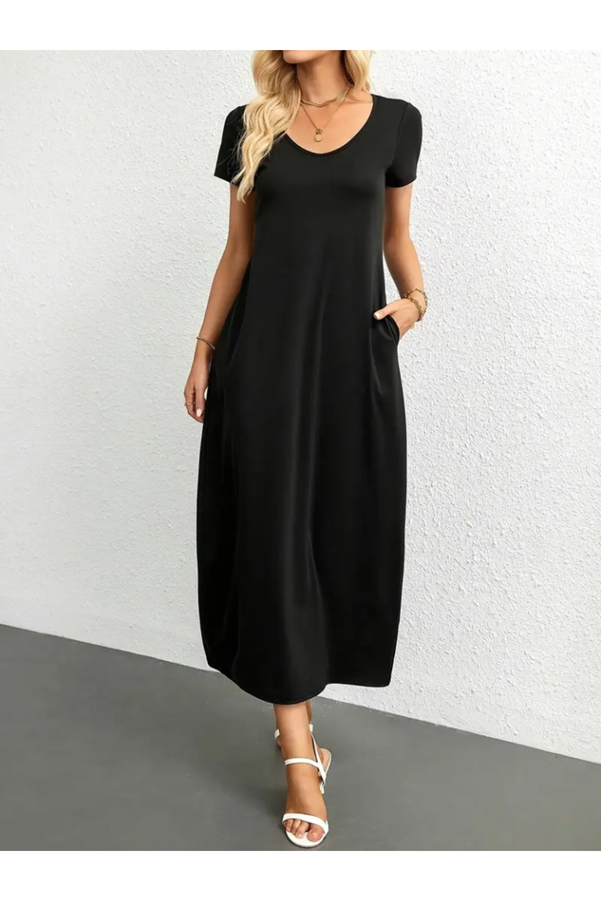 Kadın Kısa Kollu Yakası Yuvarlak Cepli Viskon Elbise