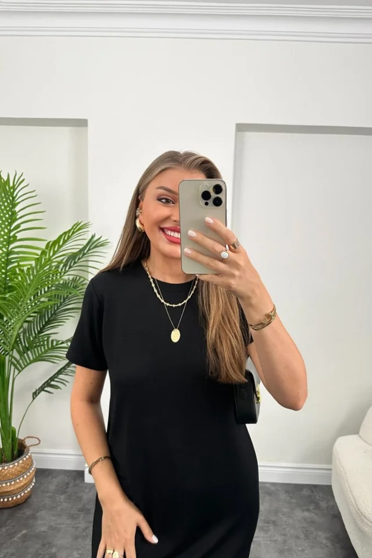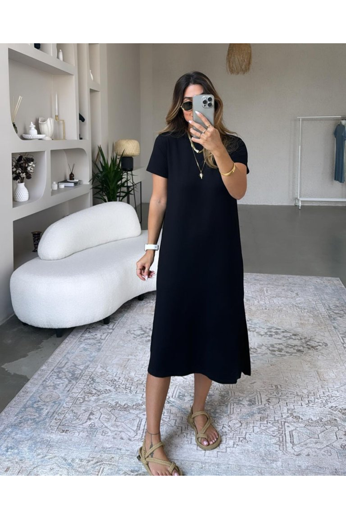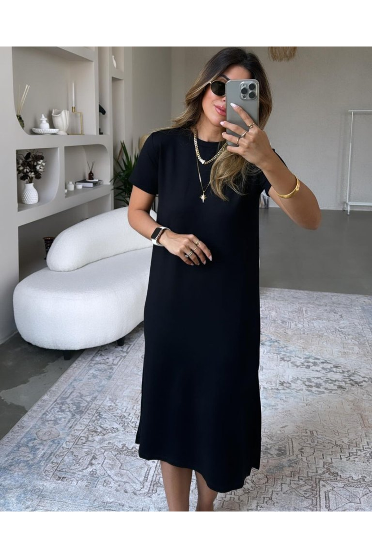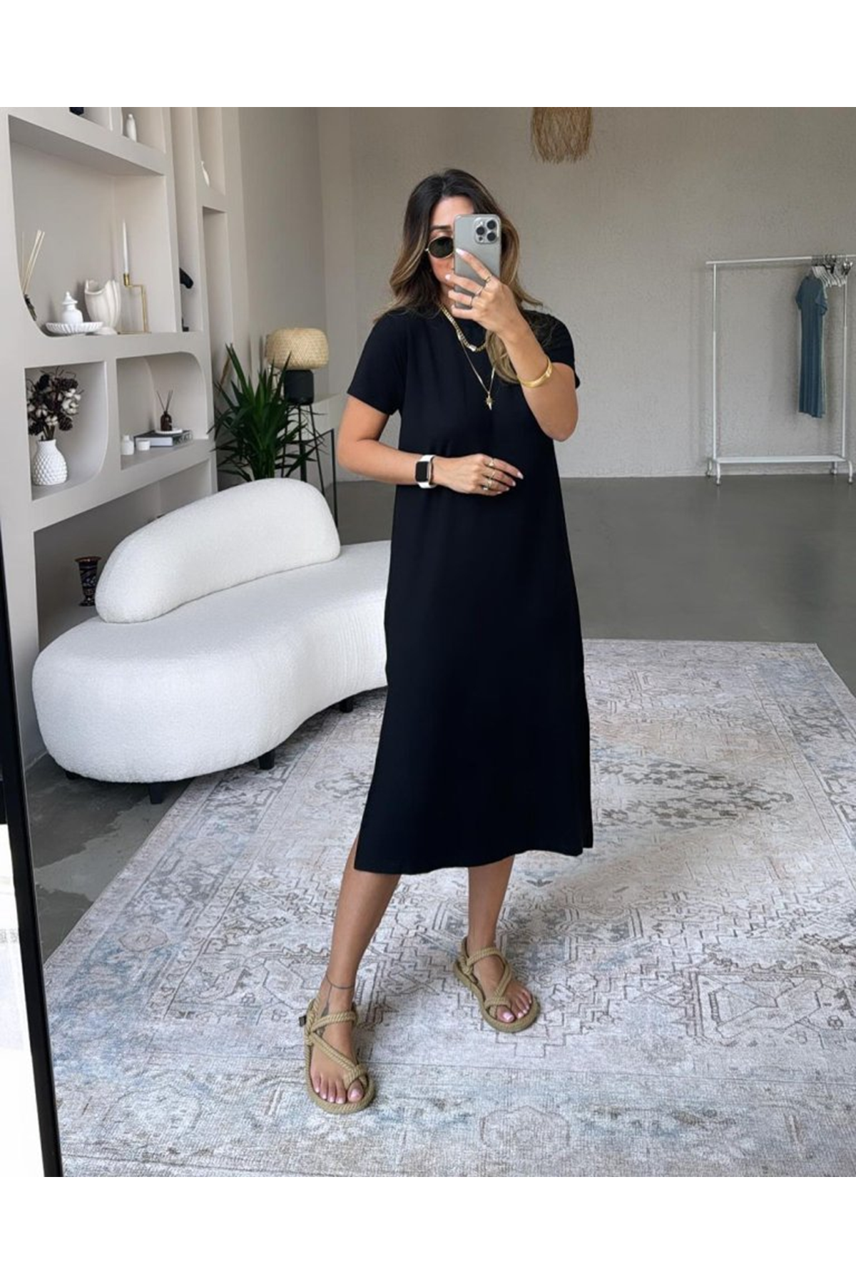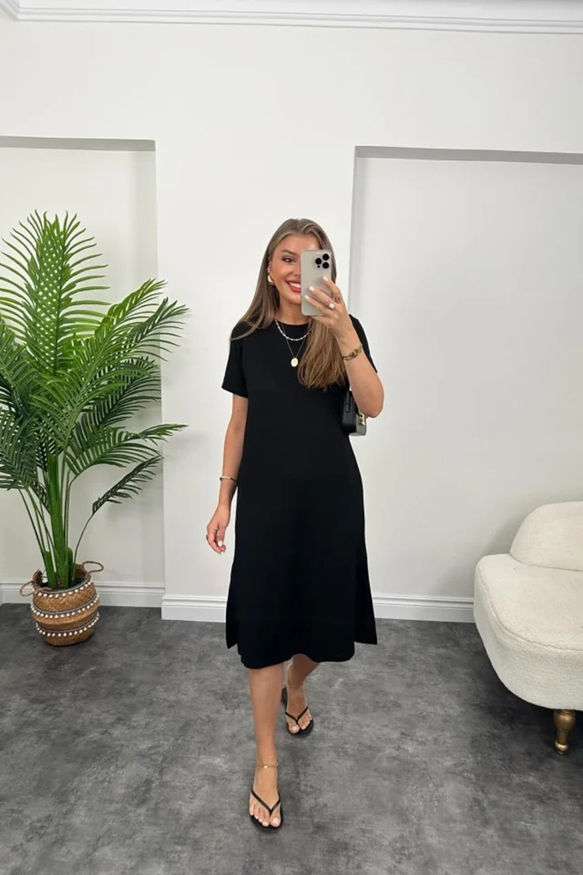 Kadın Kısa Kollu Yırtmaç Detaylı Salaş Viskon Elbise