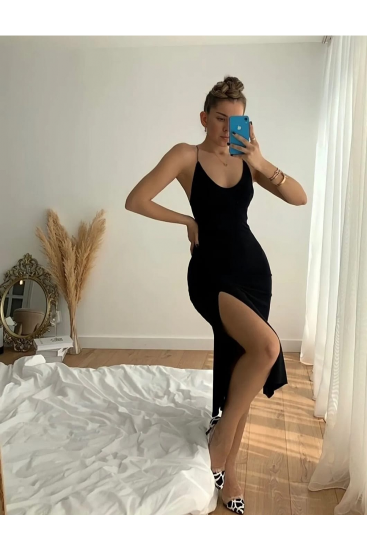 Kadın Kolsuz V Yaka Boyundan Ve Sırttan Bağlamalı Yırtmaçlı Janjan Krep Midi Elbise