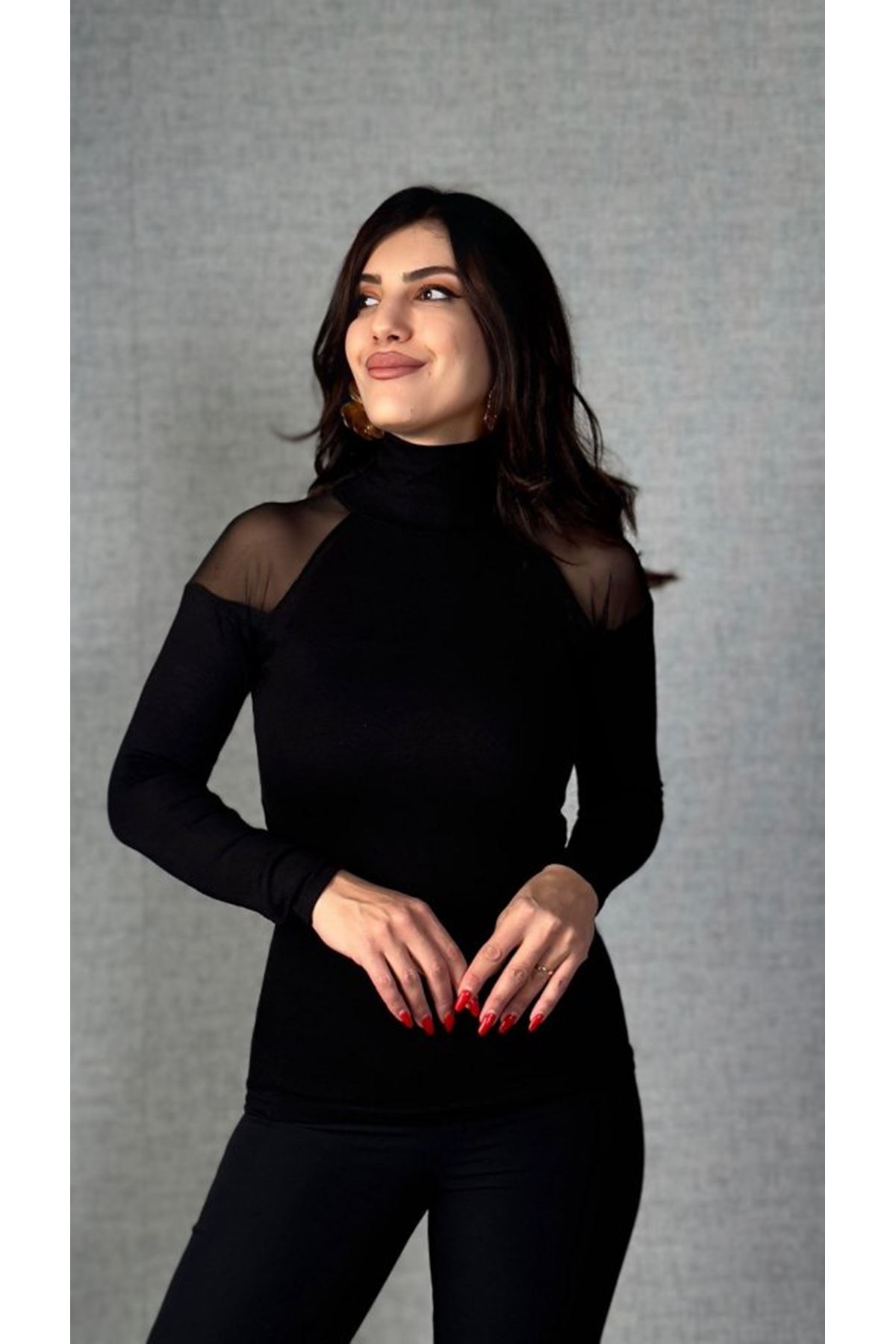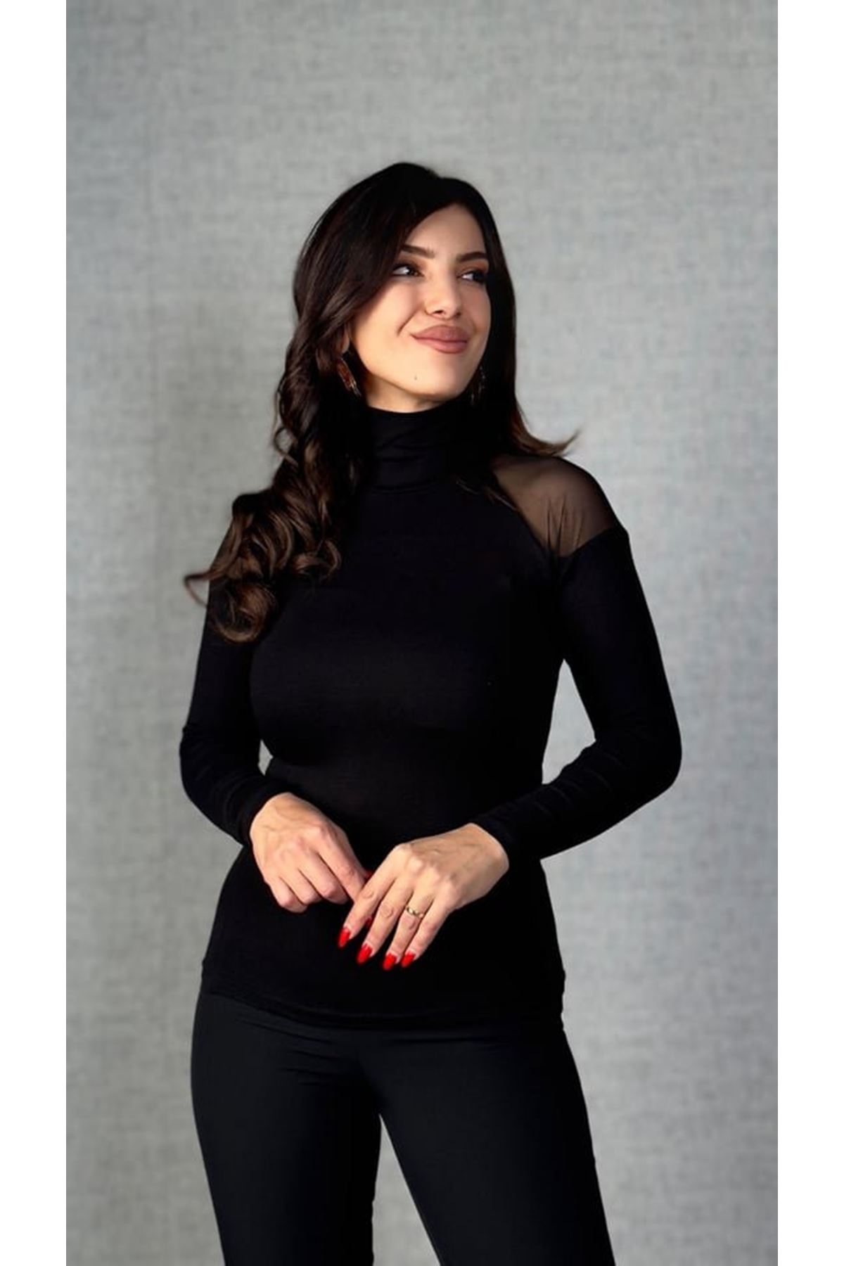 Kadın Omuzları Tül Balıkçı Yaka Viskon Kumaş Bluz