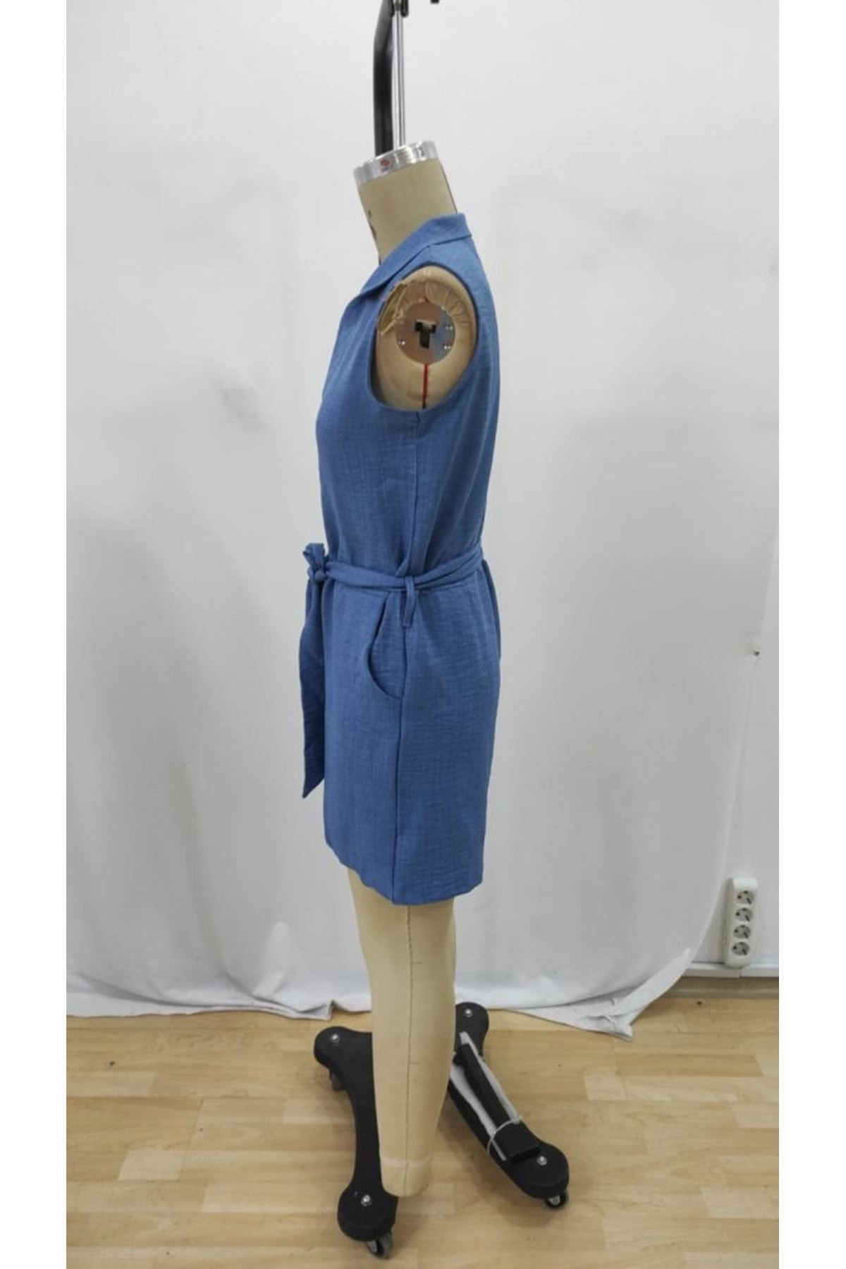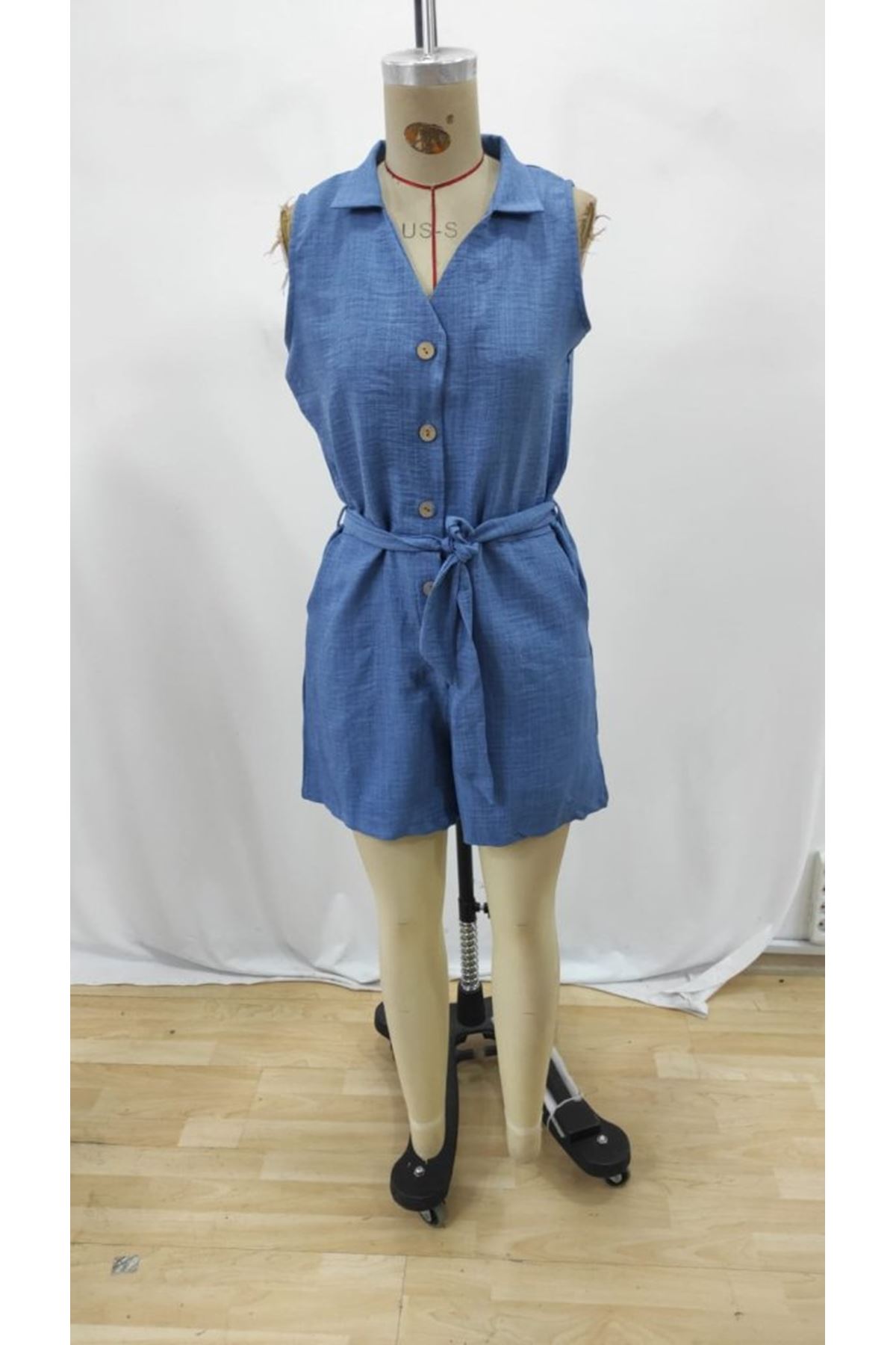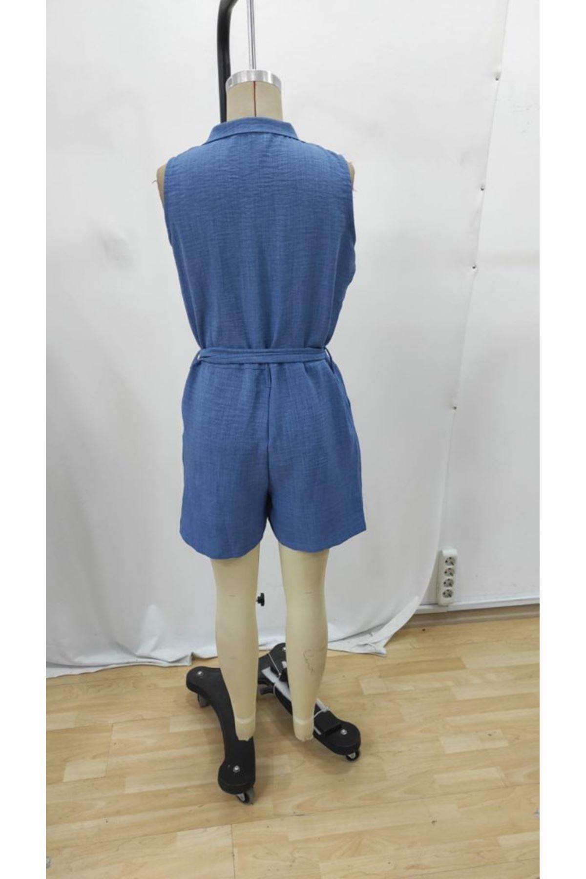 Kadın Sıfır Kollu Yakalı Düğmeli Belden Kuşaklı Kısa Keten Tulum