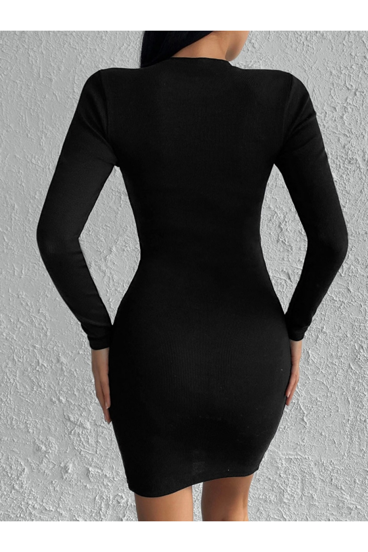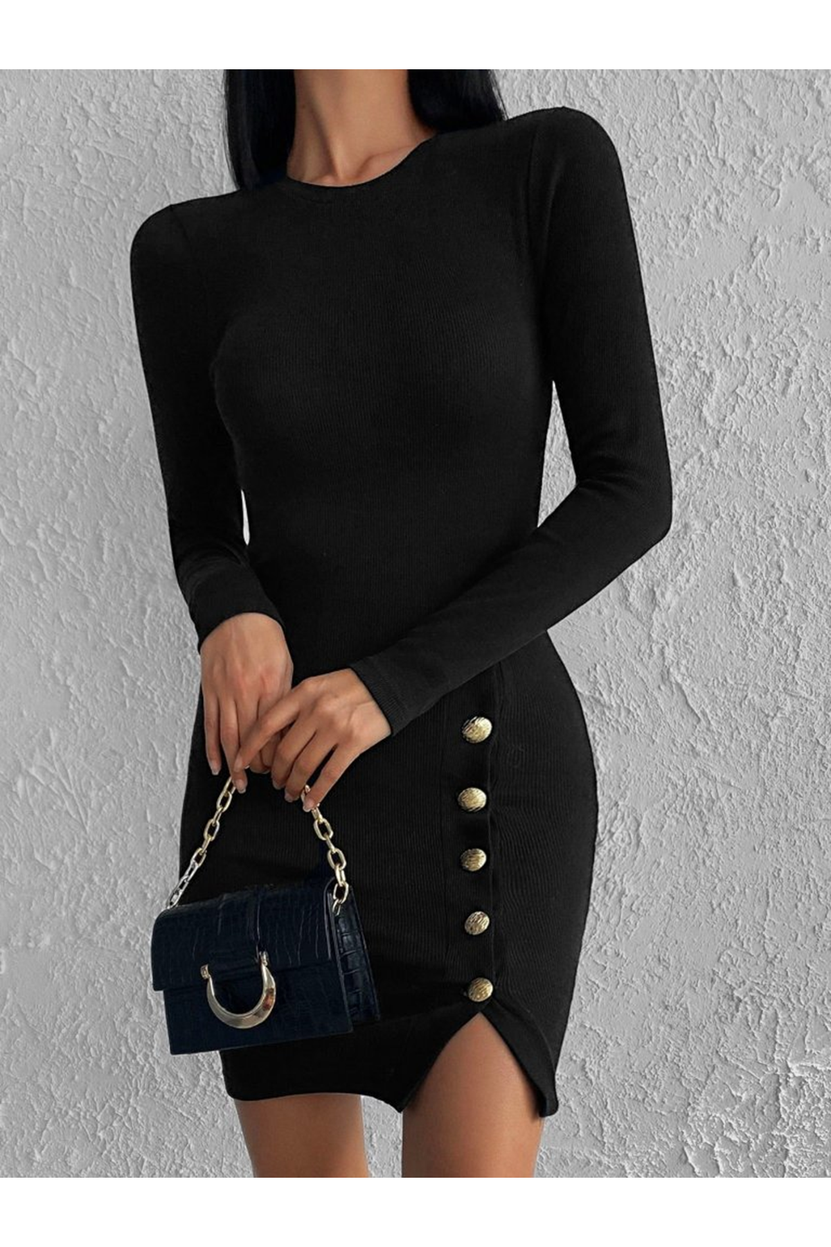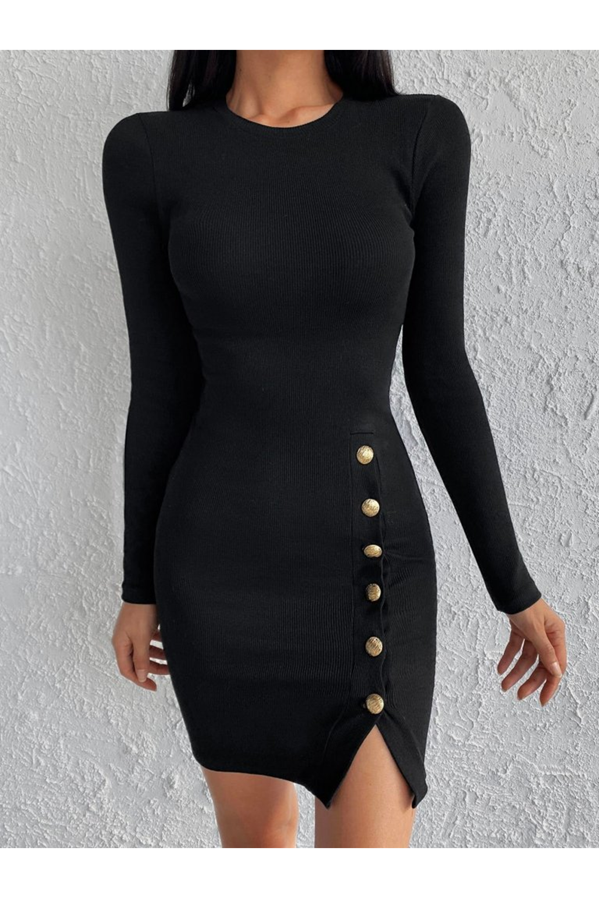 Kadın Siyah Uzun Kollu Bisiklet Yaka Yan Yırtmaç Düğme Detay Kısa Kaşkorse Elbise