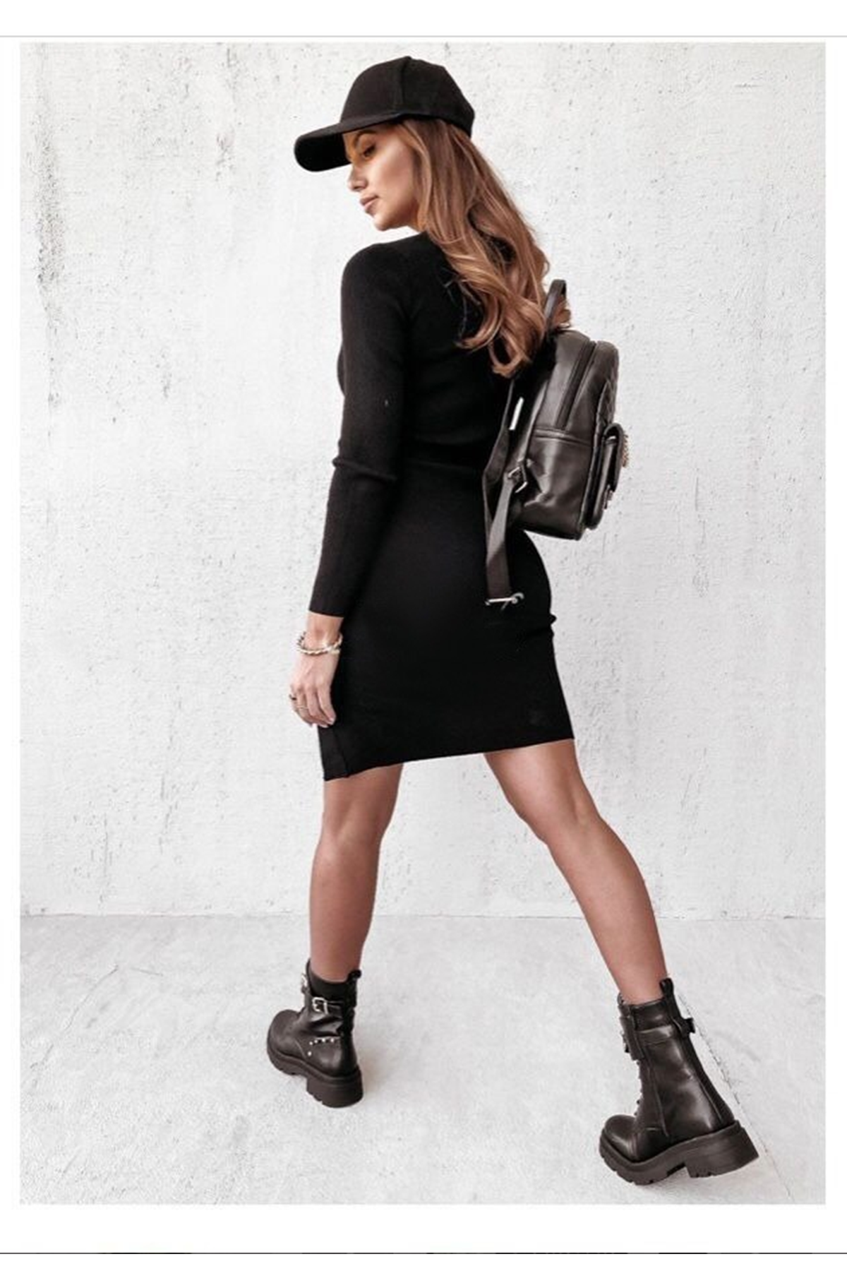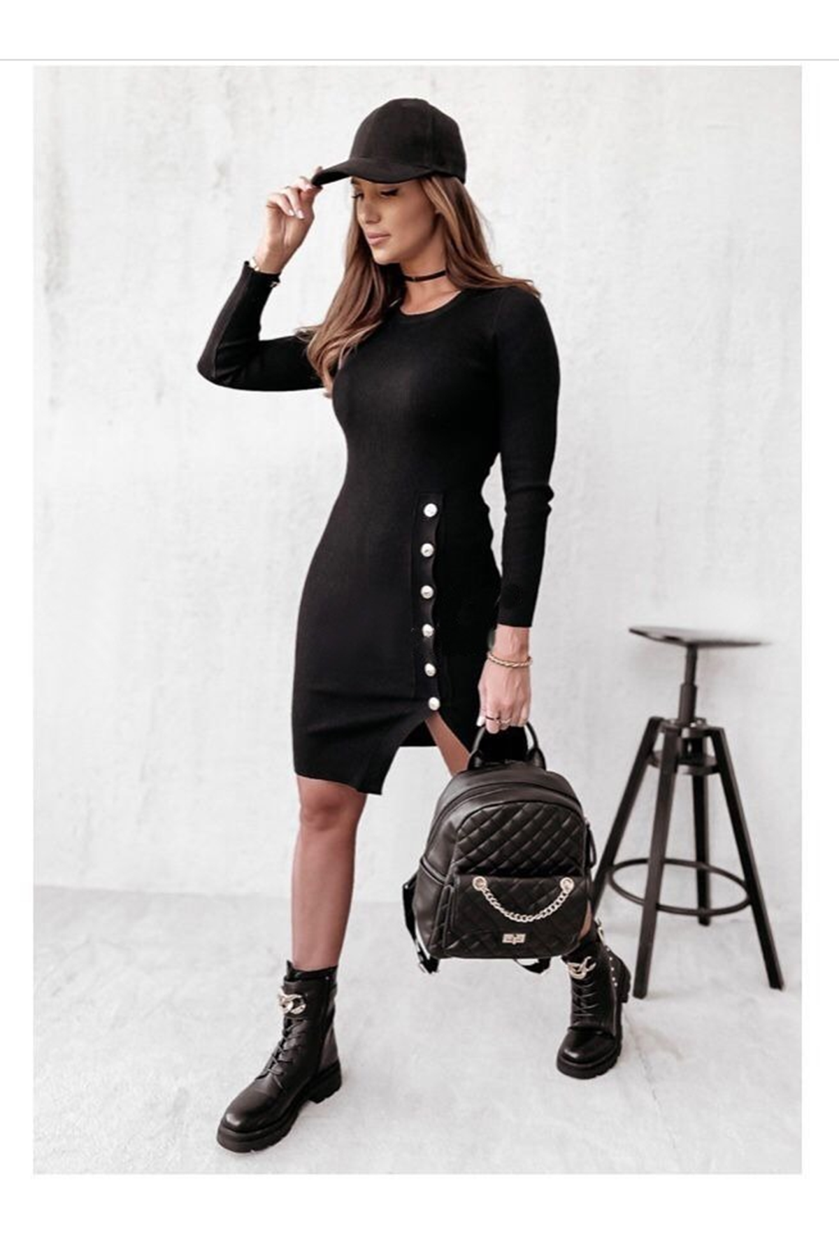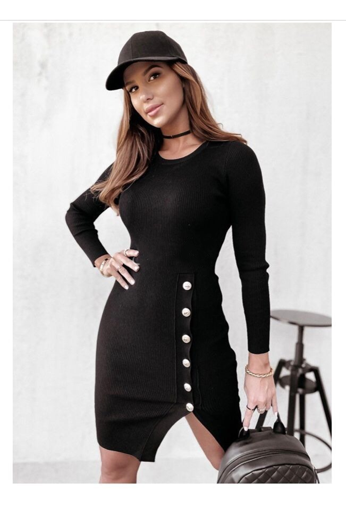Kadın Siyah Uzun Kollu Bisiklet Yaka Yan Yırtmaç Düğme Detay Kısa Kaşkorse Elbise