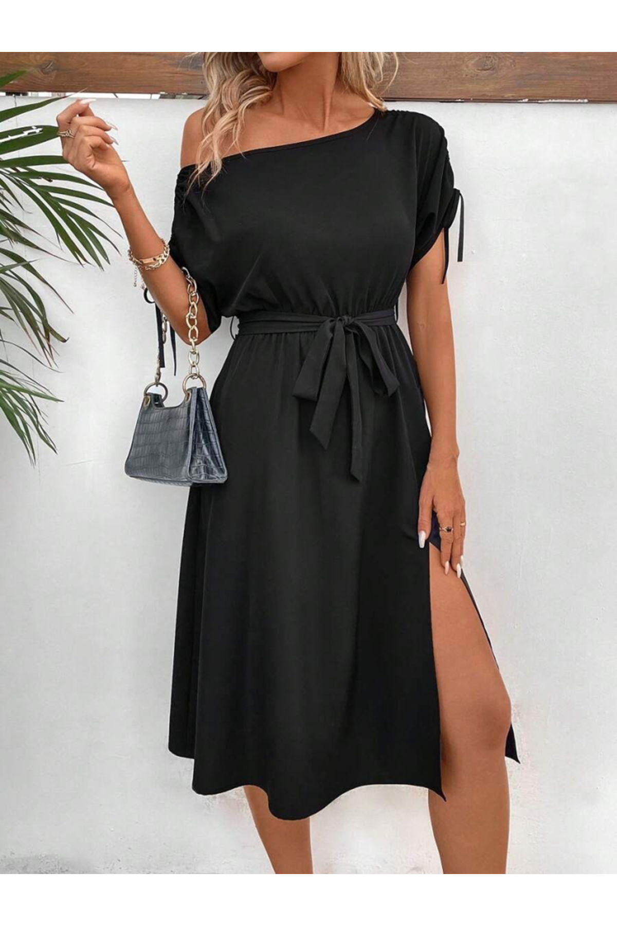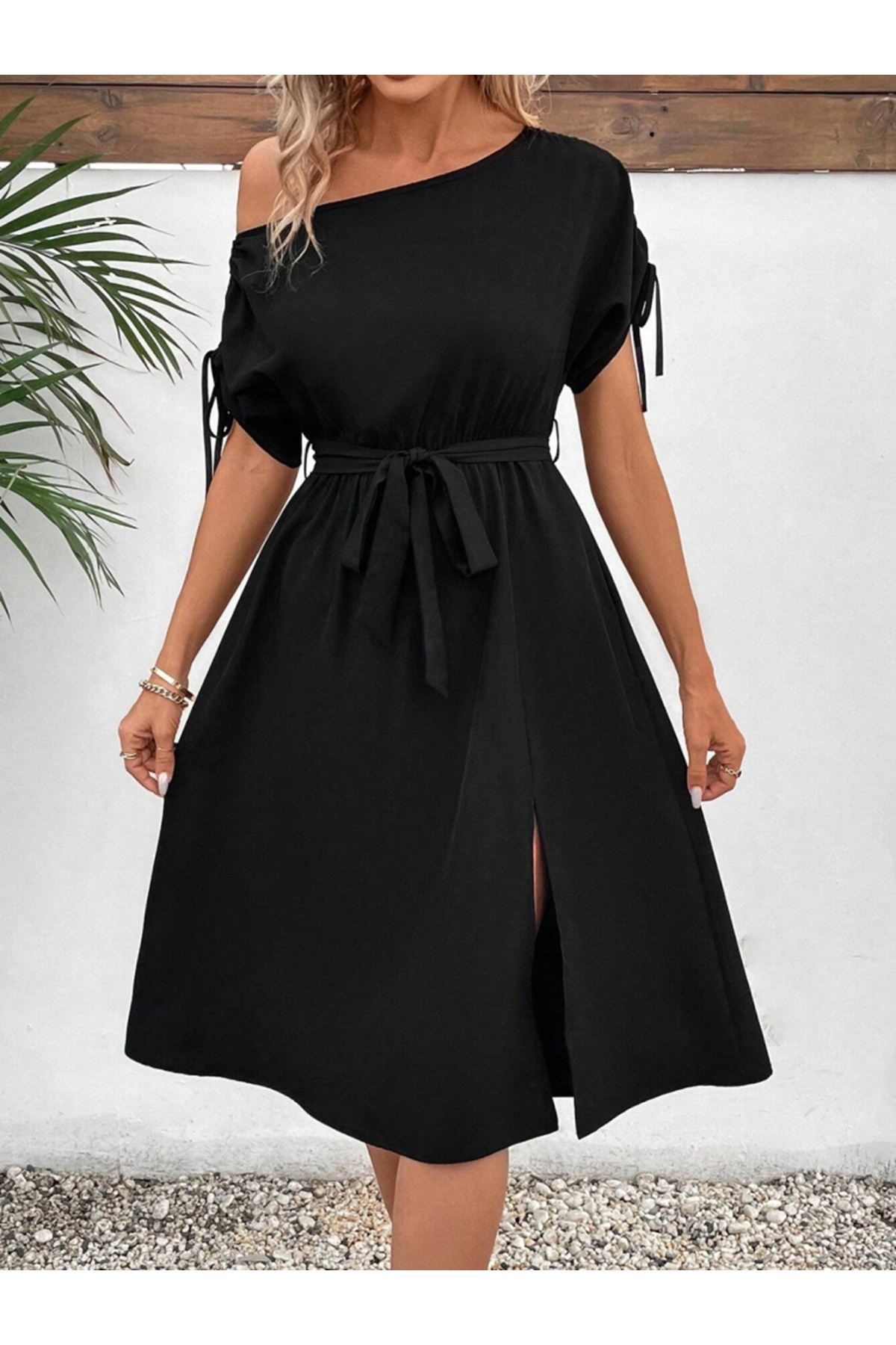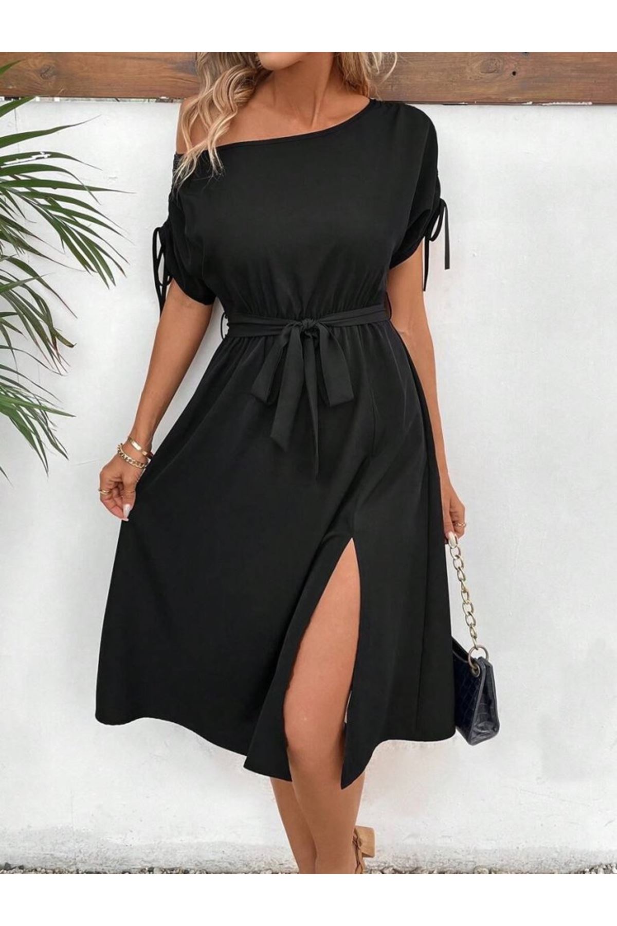 Kadın Tek Omuzu Açık Kol Ucu Fiyonklu Belden Kuşaklı Yırtmaç Detaylı Viskon Elbise