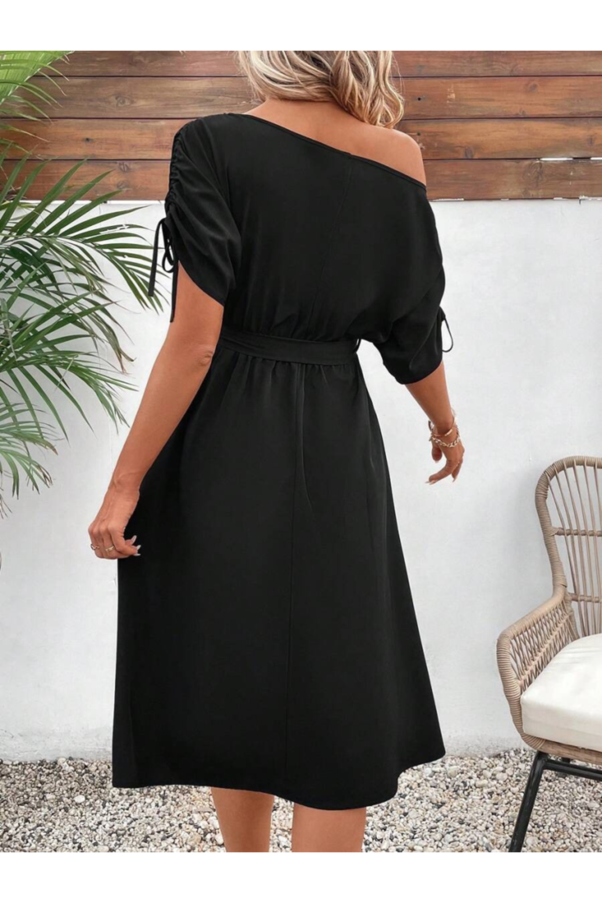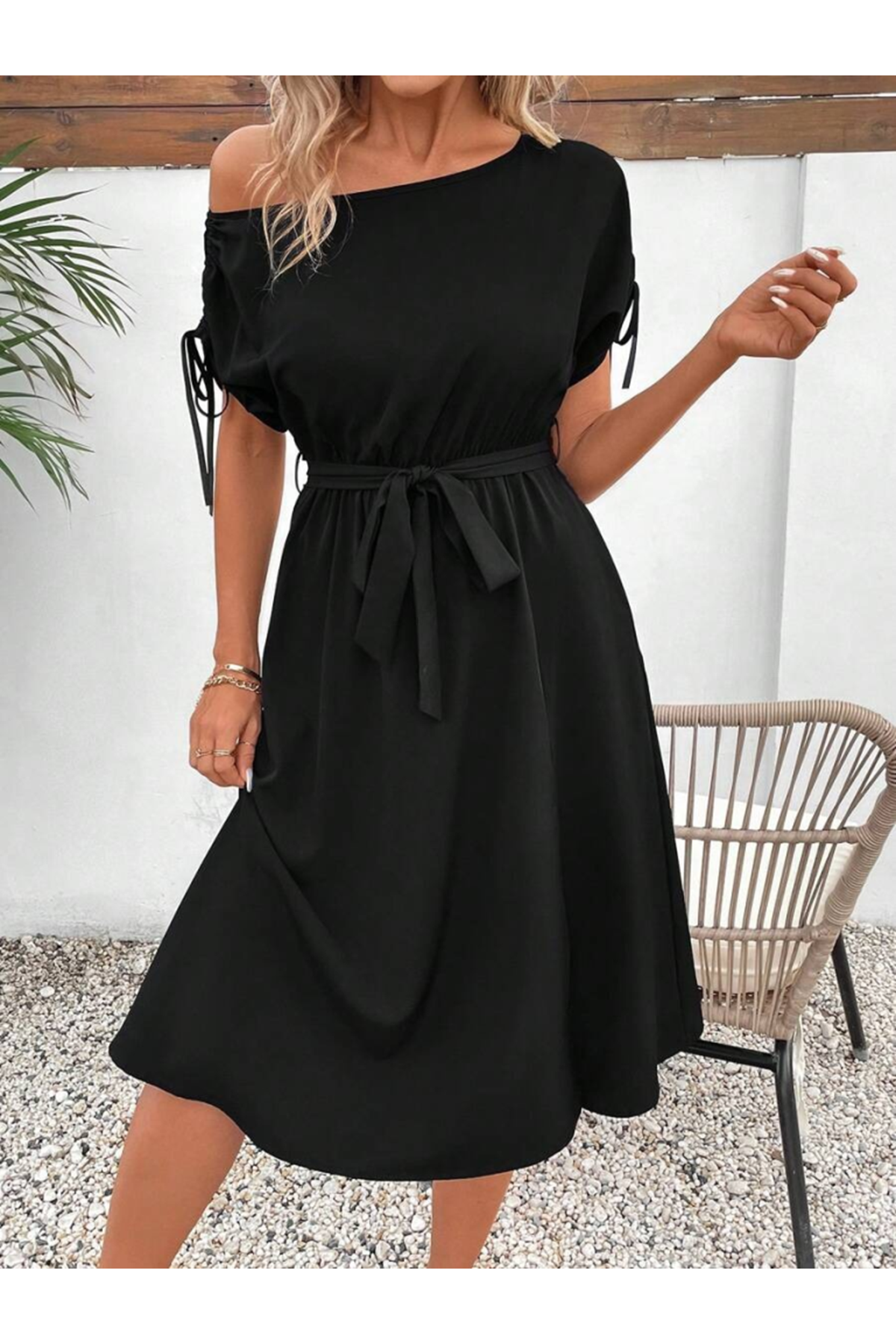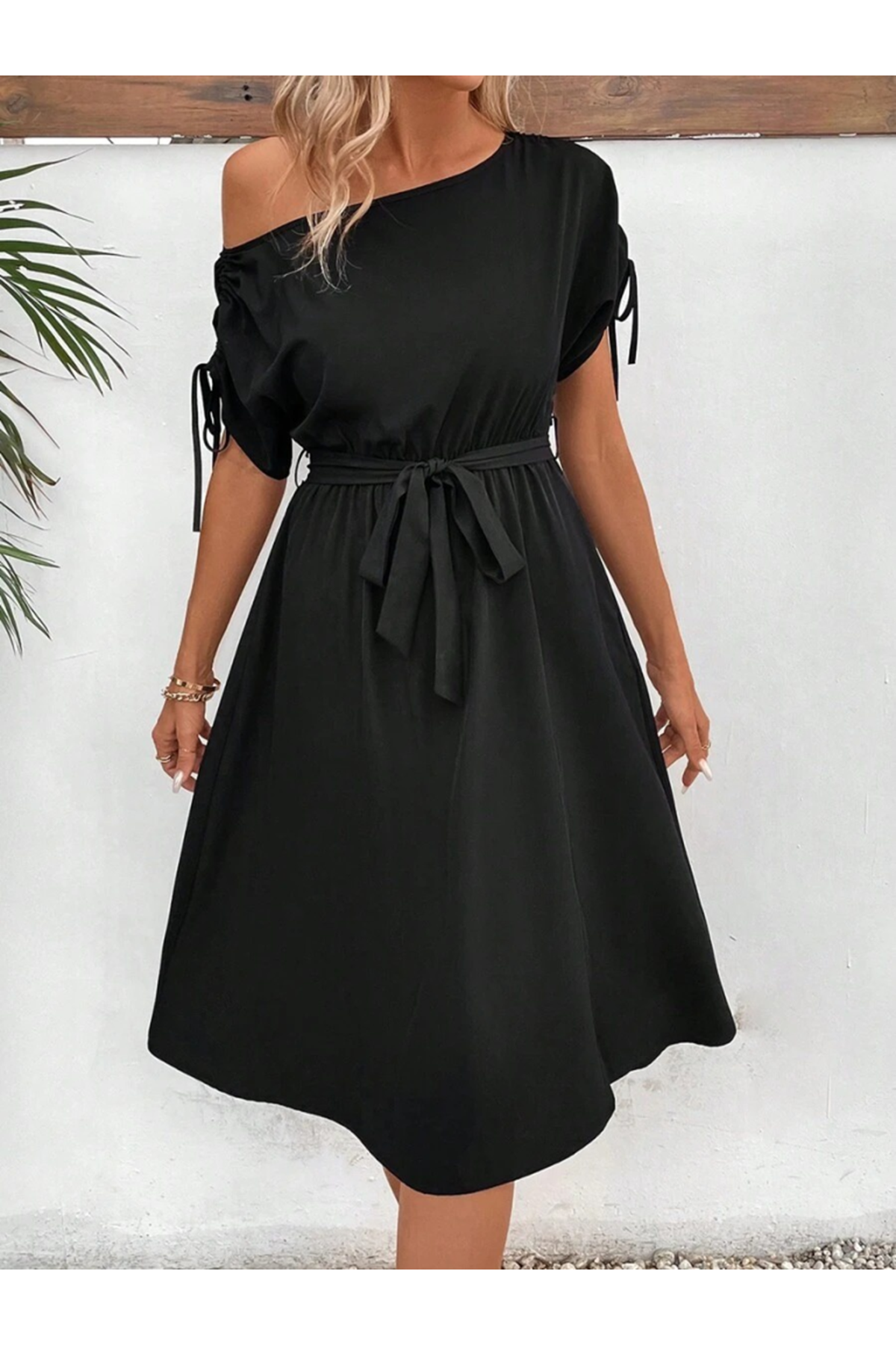 Kadın Tek Omuzu Açık Kol Ucu Fiyonklu Belden Kuşaklı Yırtmaç Detaylı Viskon Elbise