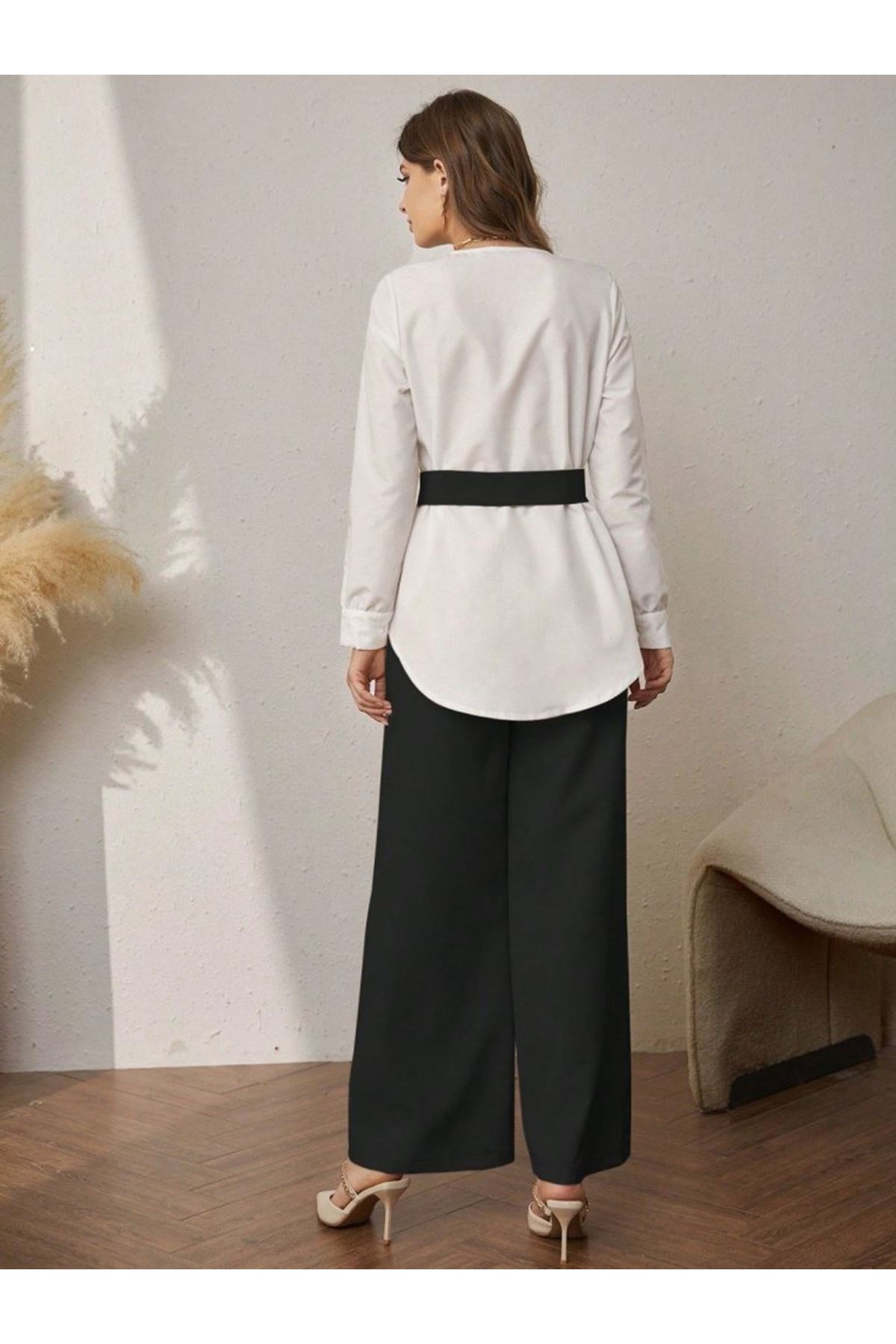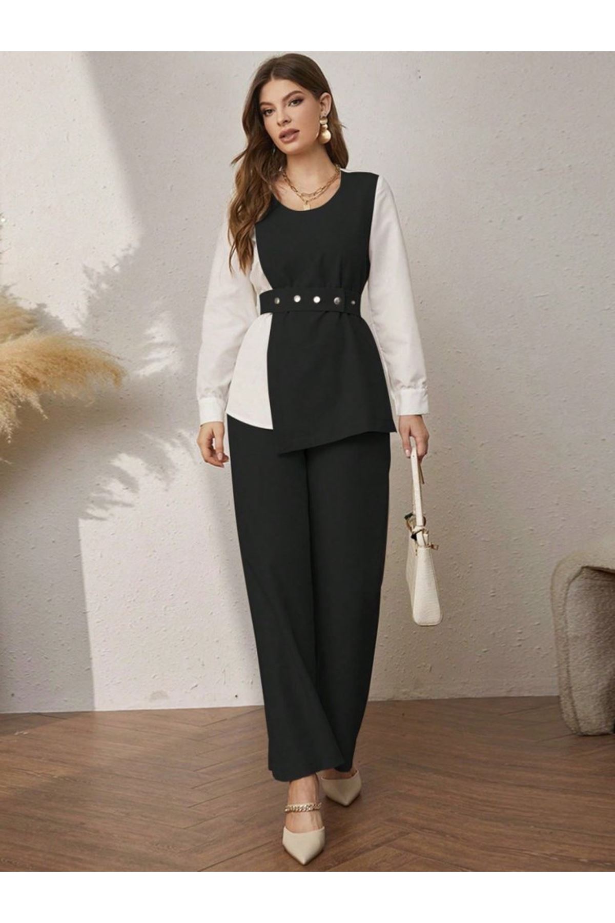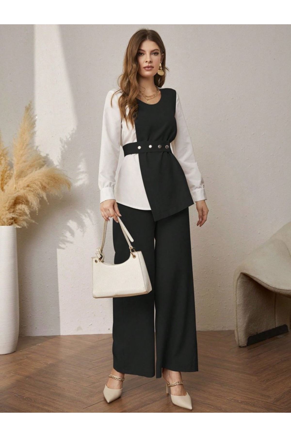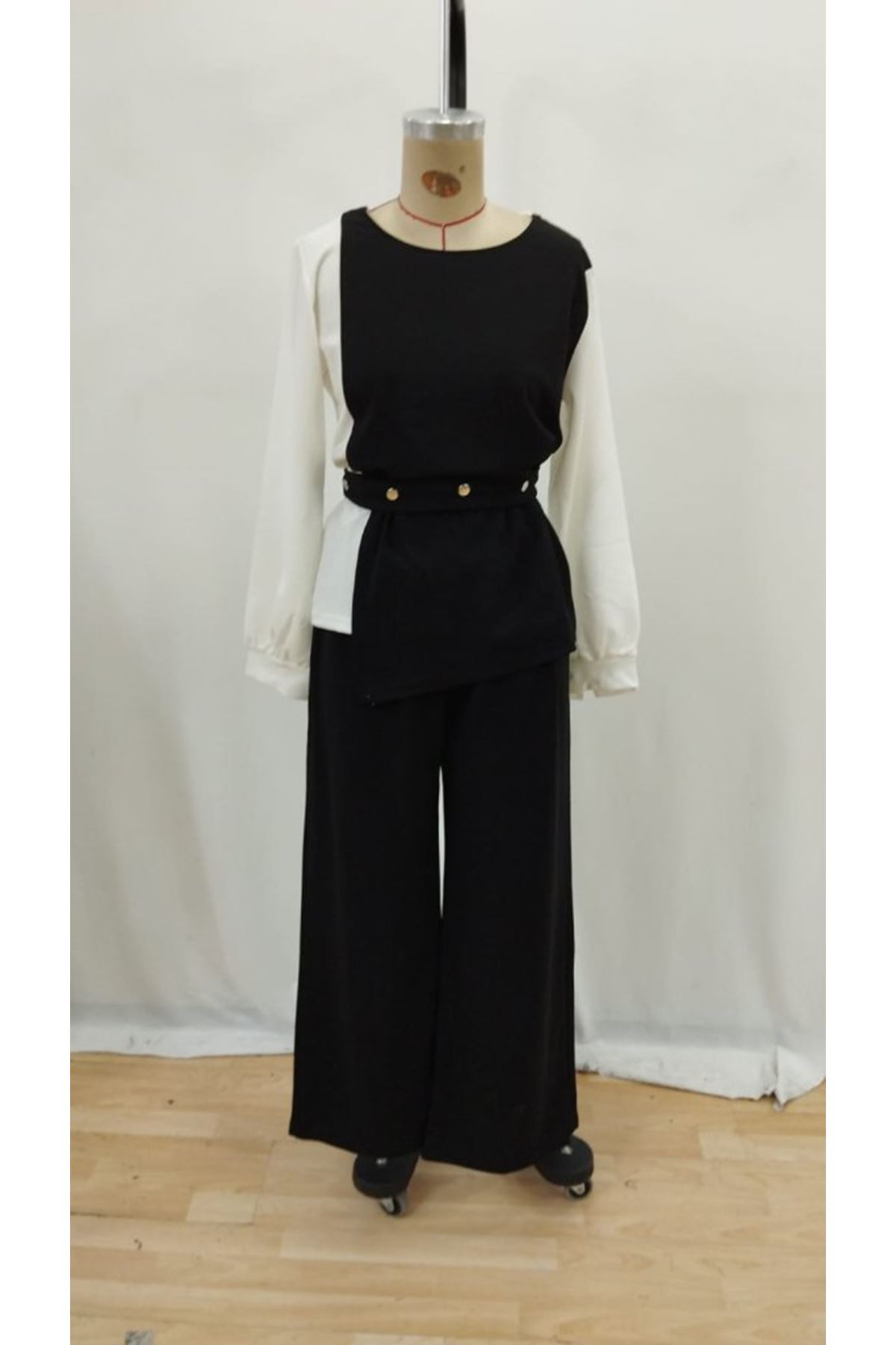 Kadın Uzun Kollu Açık Yakalı çift Renkli Kemerli Ithal Krep Ikili Takım