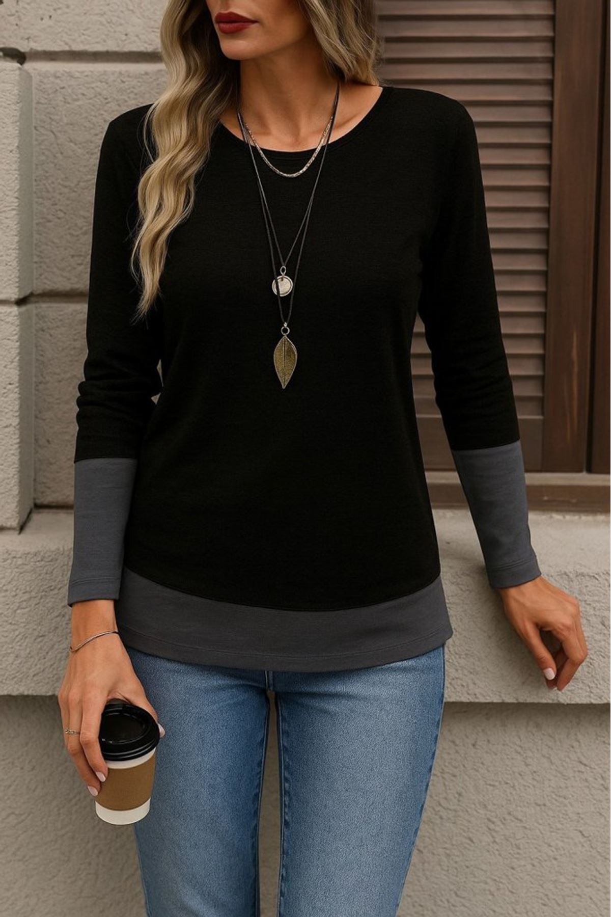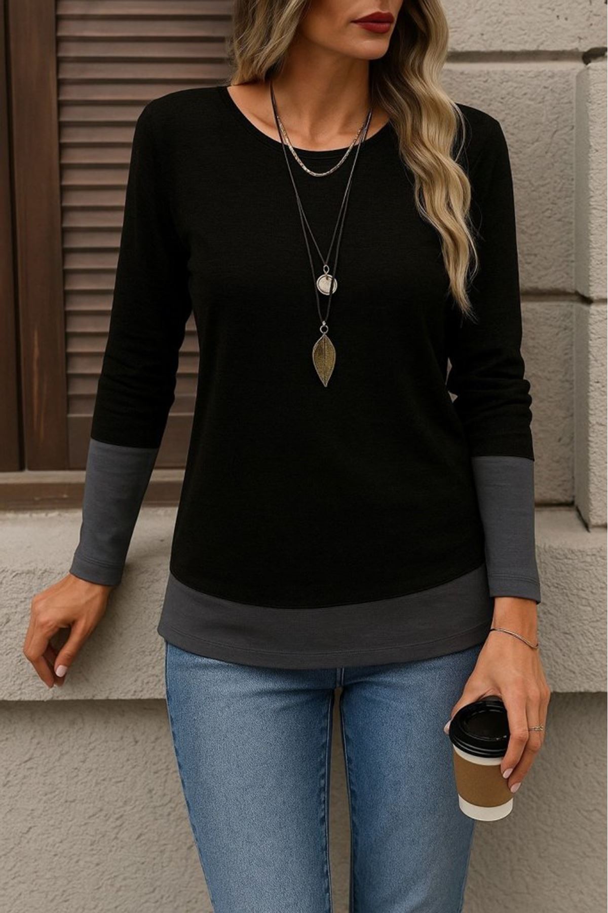 Kadın Uzun Kollu Açık Yuvarlak Yaka Blok Renkli Viskon Bluz