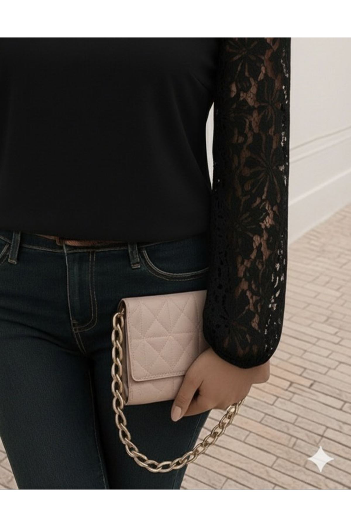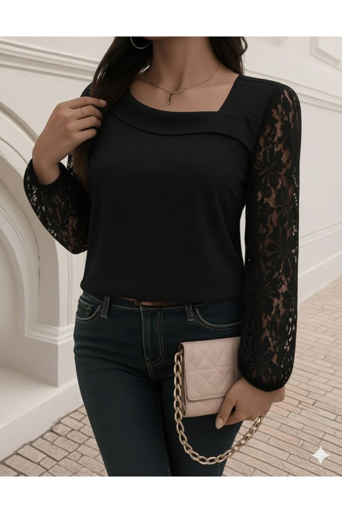 Kadın Uzun Kollu Asimetrik Yakalı Dantelli Ithal Krep Bluz