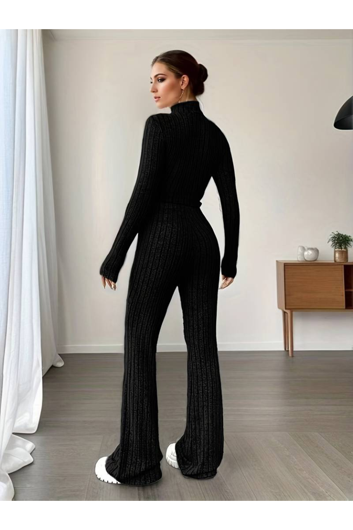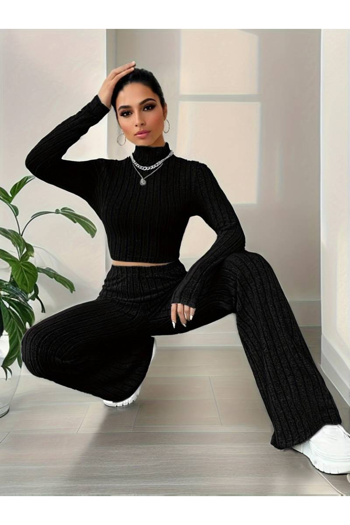 Kadın Uzun Kollu Balıkçı Yaka Krop Ve Pantolon şardonlu Kaşkorse Ikili Takım