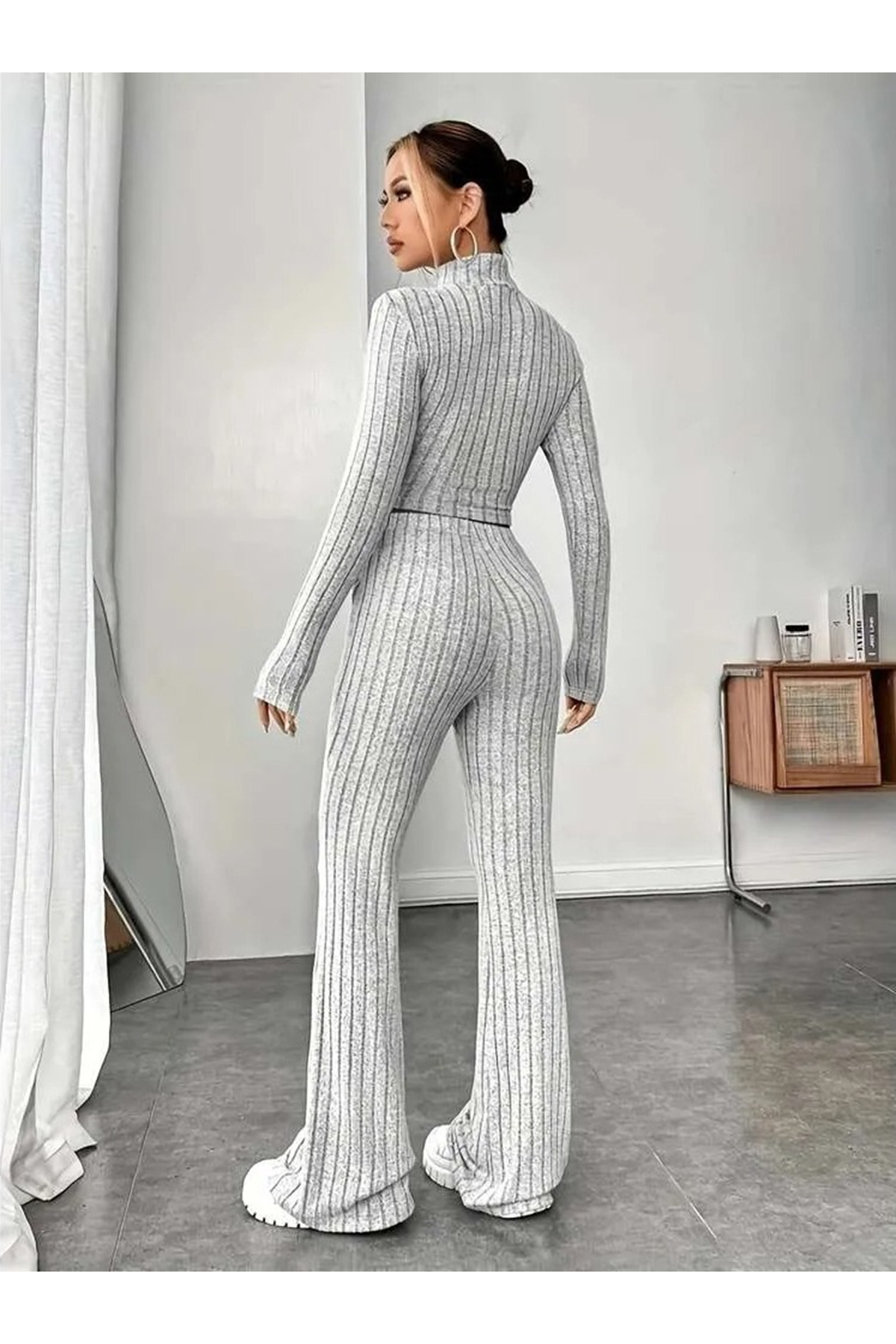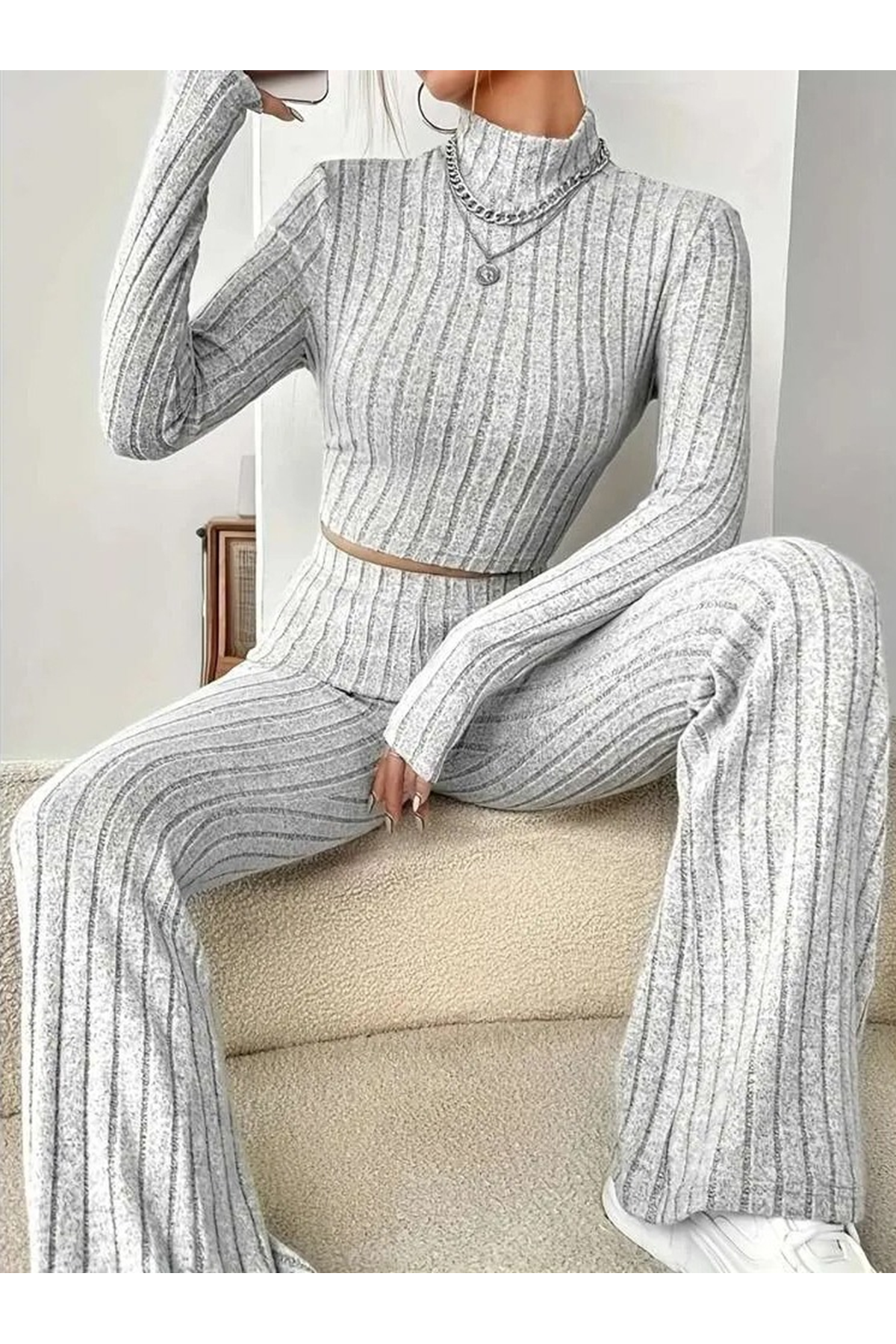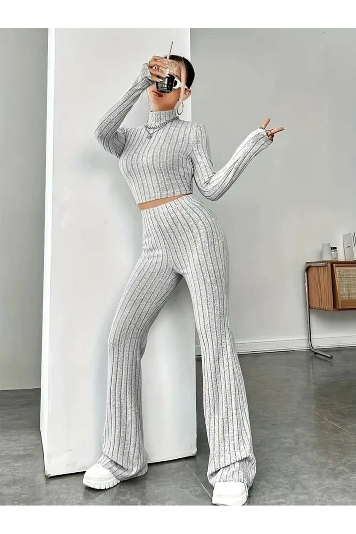 Kadın Uzun Kollu Balıkçı Yaka Krop Ve Pantolon şardonlu Kaşkorse Ikili Takım