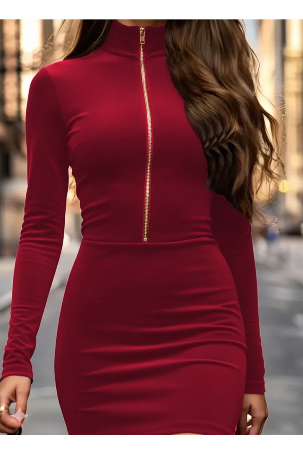 Kadın Uzun Kollu Balıkçı Yaka Yakadan Göğüse Kadar Fermuar Detaylı Mini Kadife Elbise