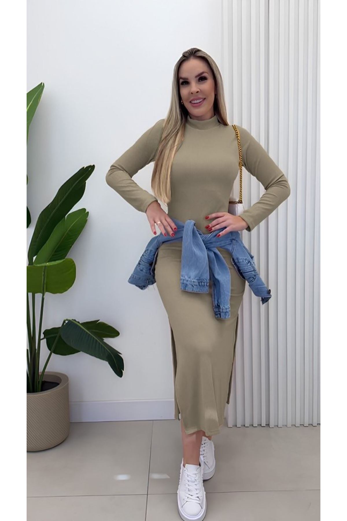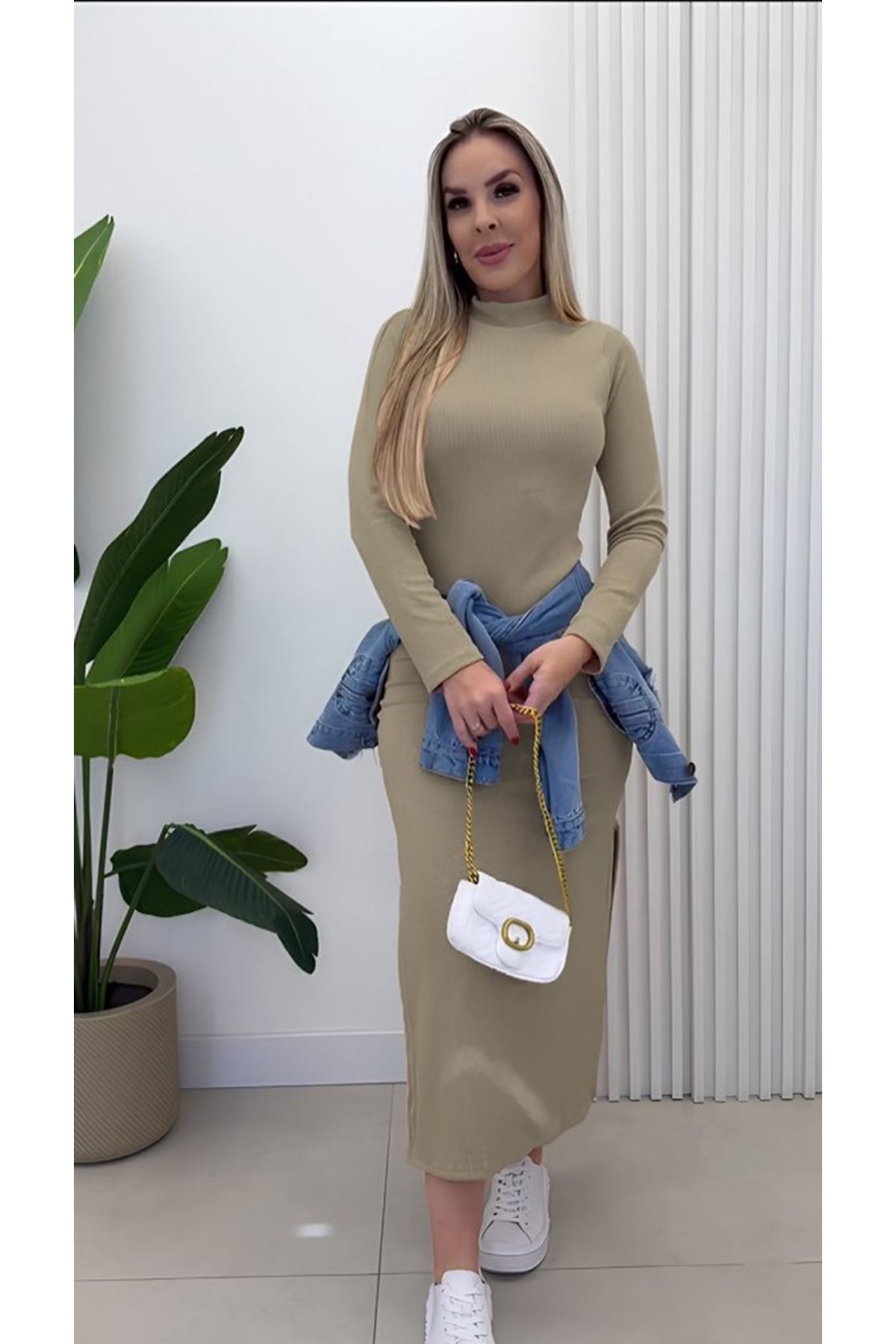 Kadın Uzun Kollu Balıkçı Yakalı Yanlardan Yırtmaçlı Kaşkorse Maxi Elbise