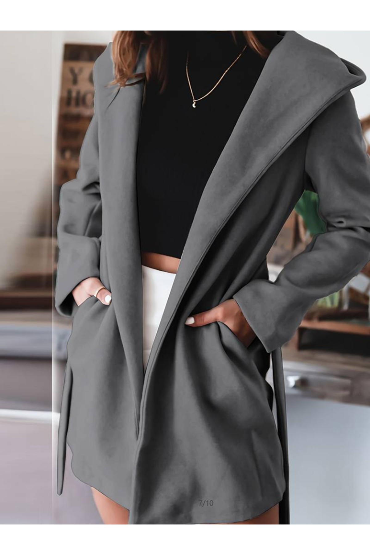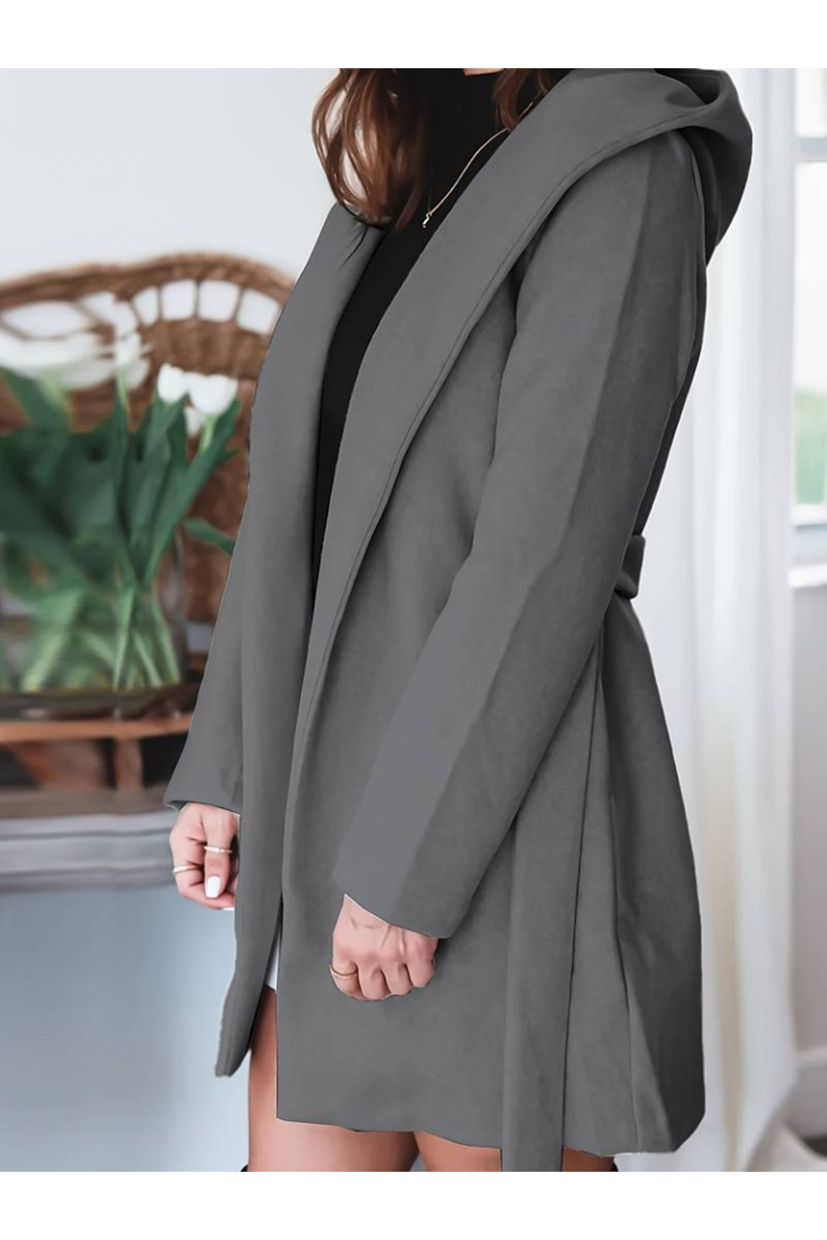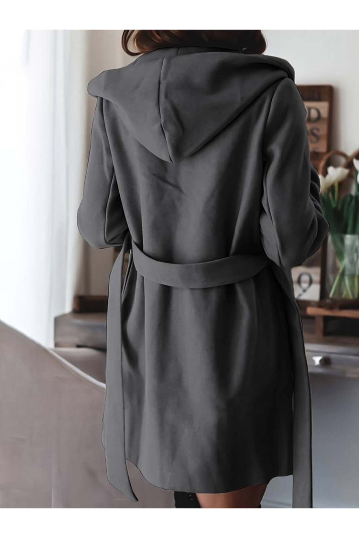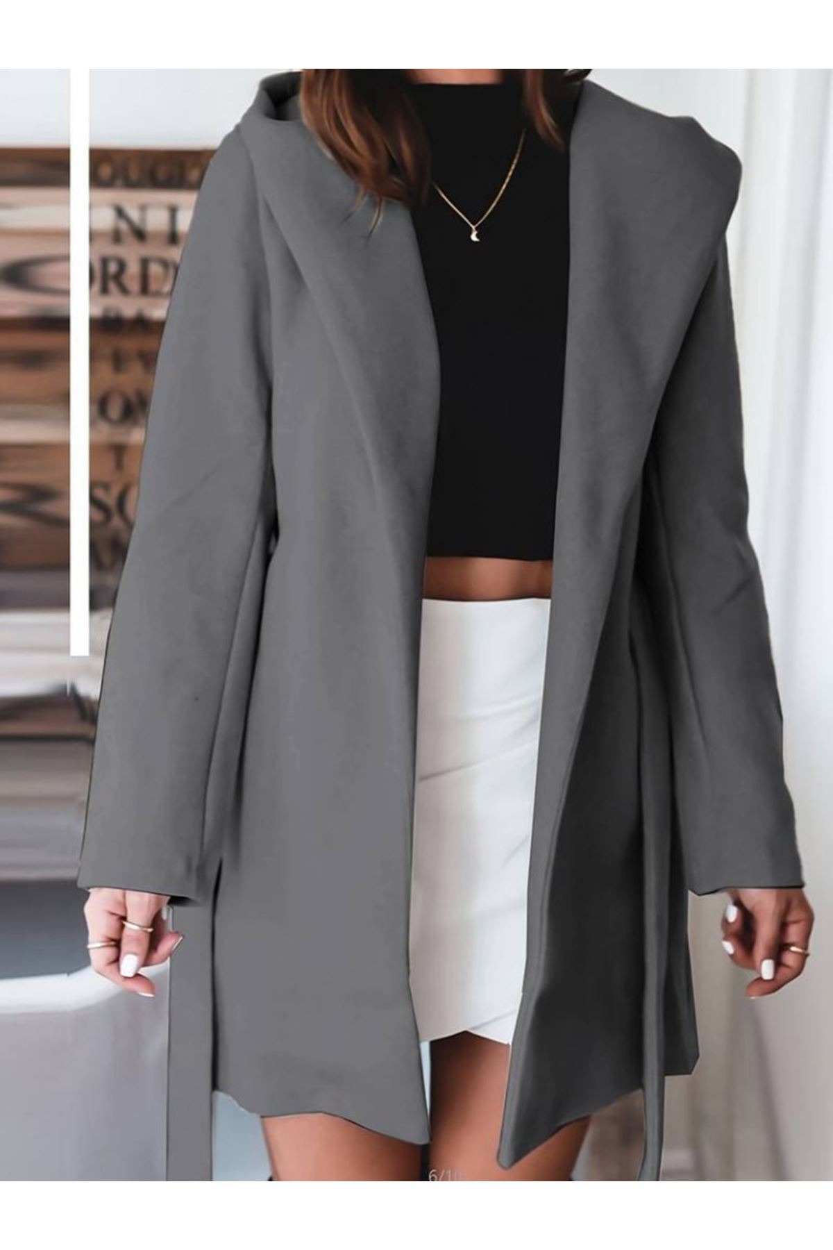 Kadın Uzun Kollu Belden Kuşaklı Kapşonlu Kısa Kaşe Kaban