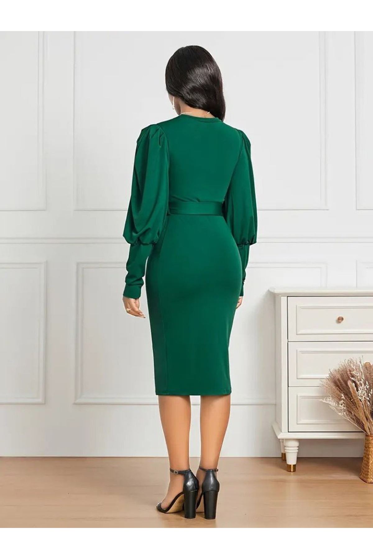 Kadın Uzun Kollu Bisiklet Yaka Beli Kuşaklı Ithal Krep Midi Elbise