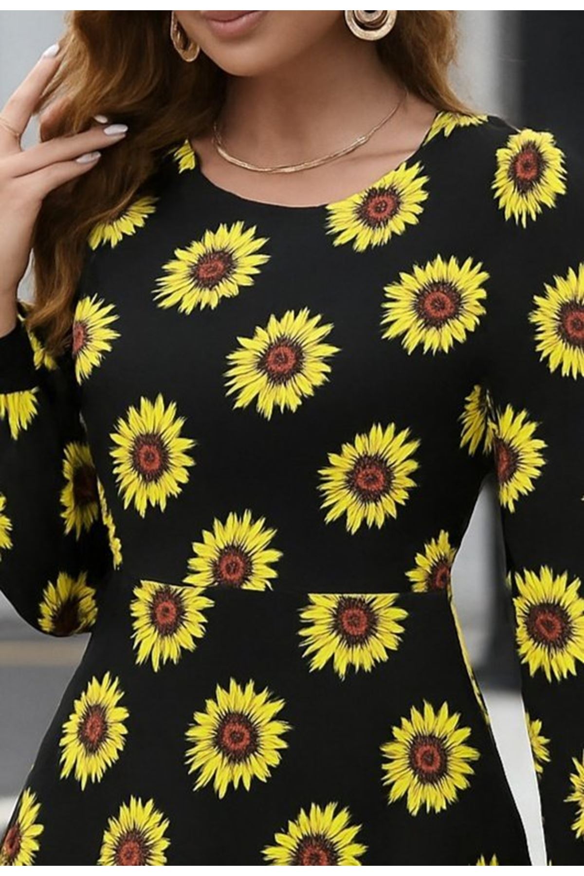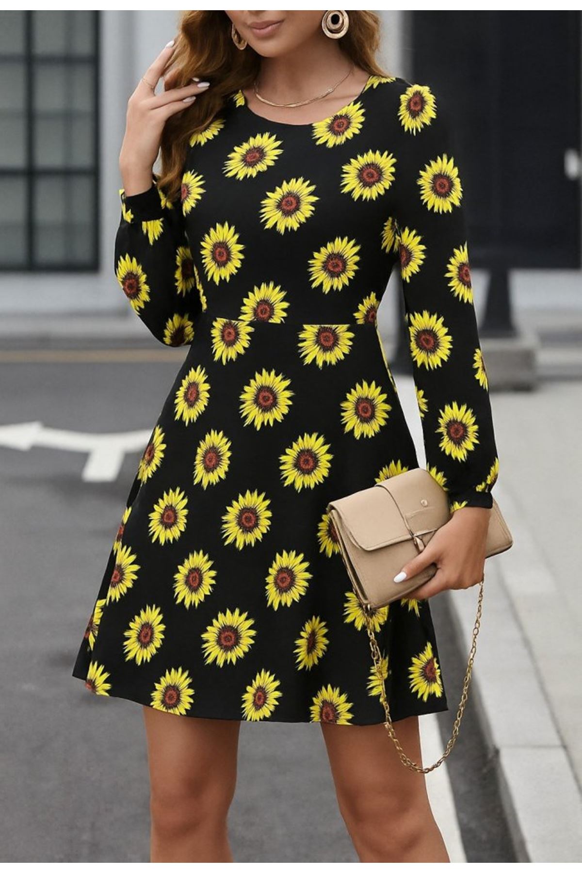 Kadın Uzun Kollu Bisiklet Yaka Desenli Kısa Krep Elbise