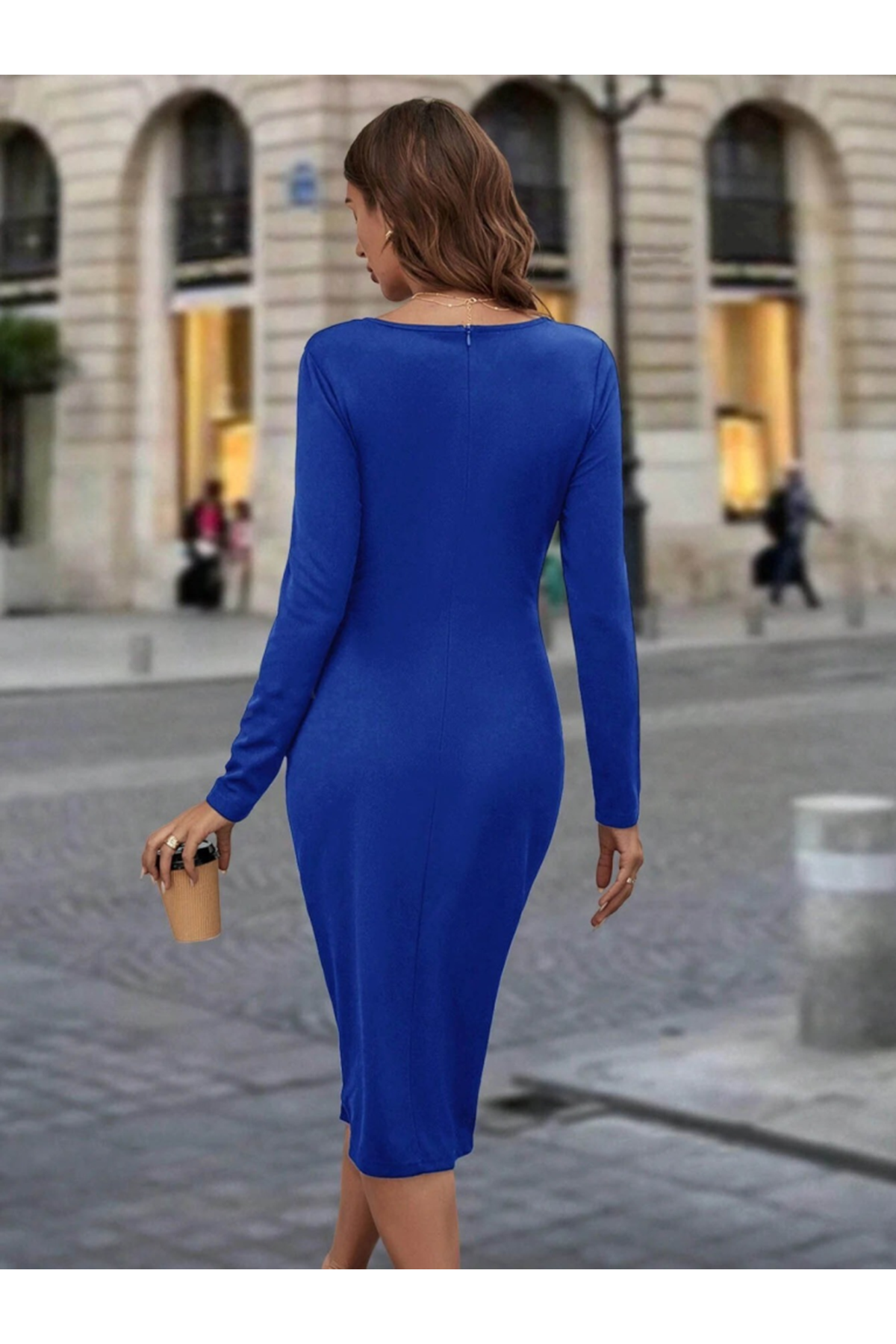 Kadın Uzun Kollu Bisiklet Yaka Fermuar Detaylı Yırtmaçlı Midi Krep Elbise
