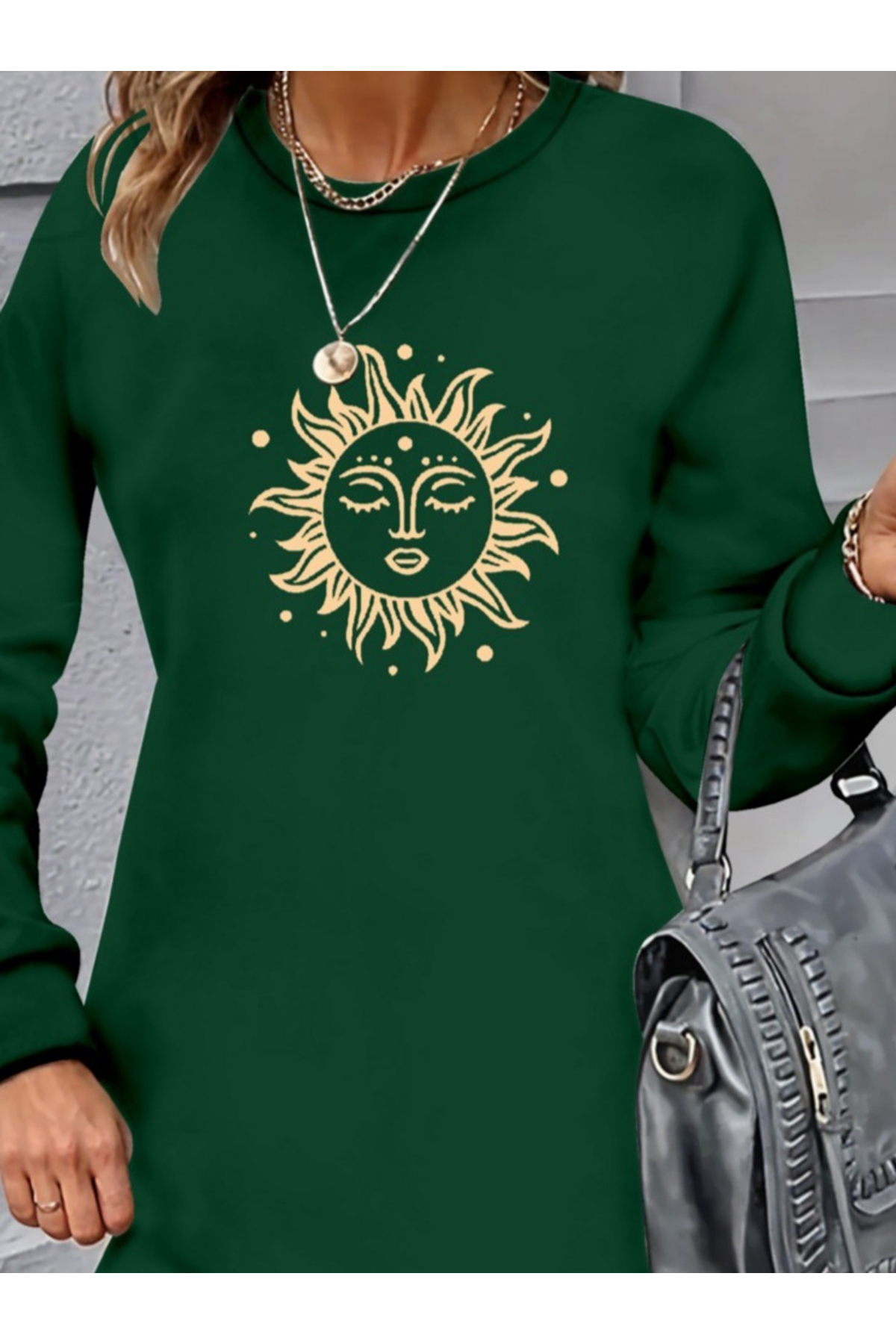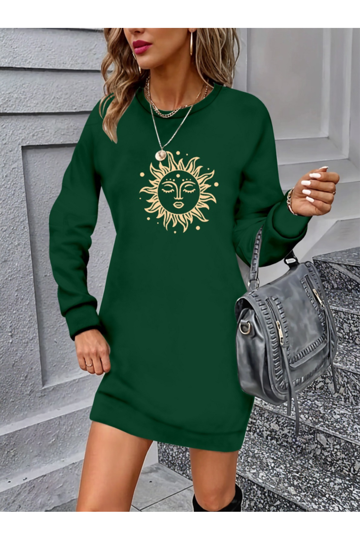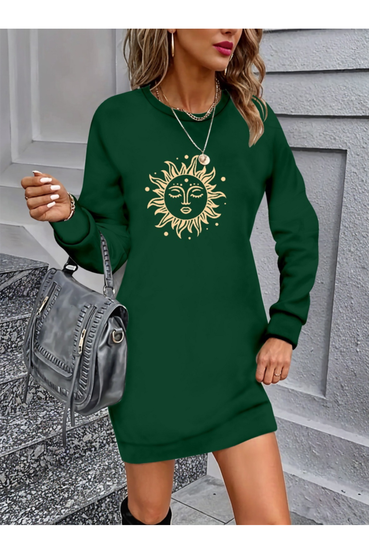 Kadın Uzun Kollu Bisiklet Yaka Güneş Desenli Viskon Iki Iplik Elbise