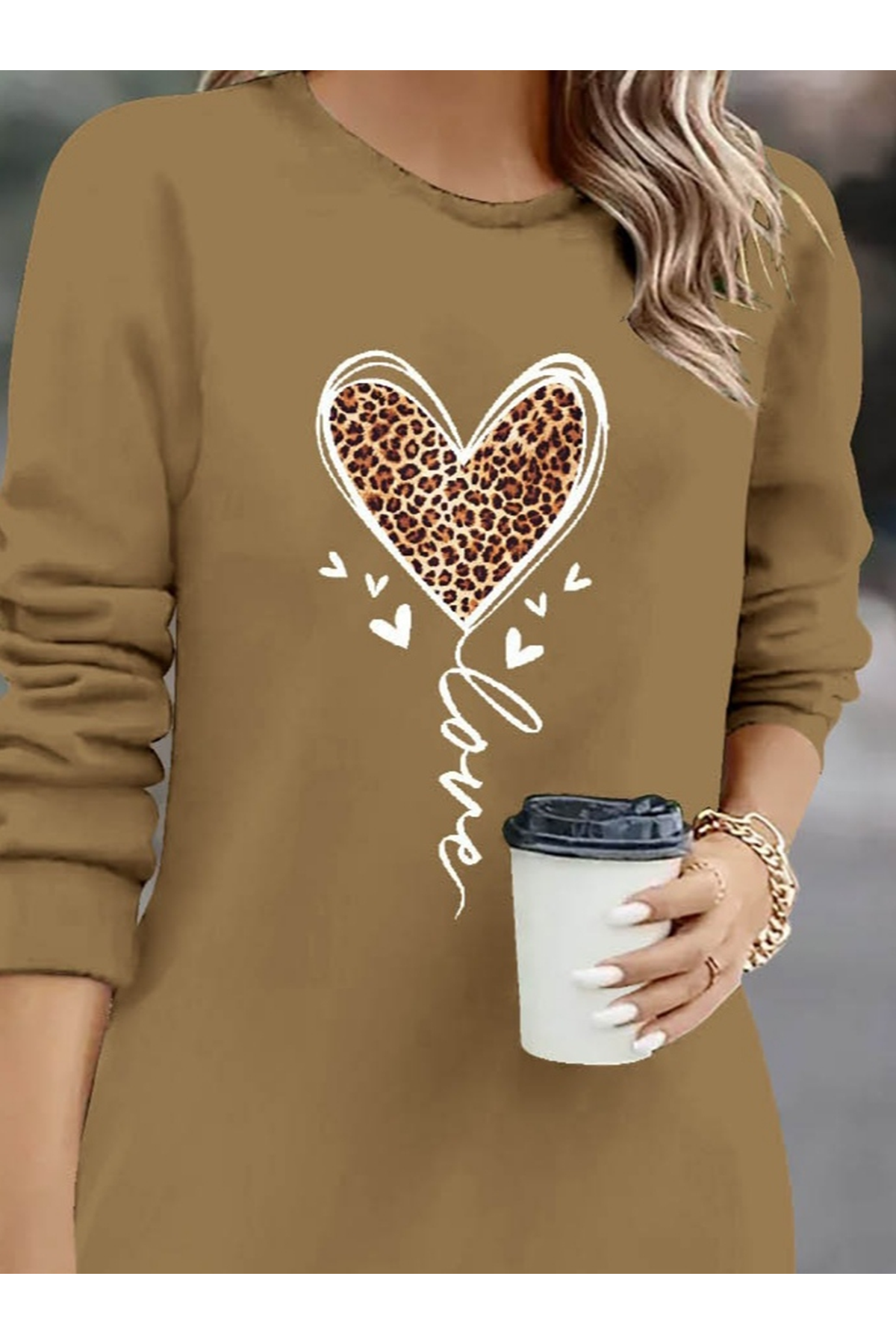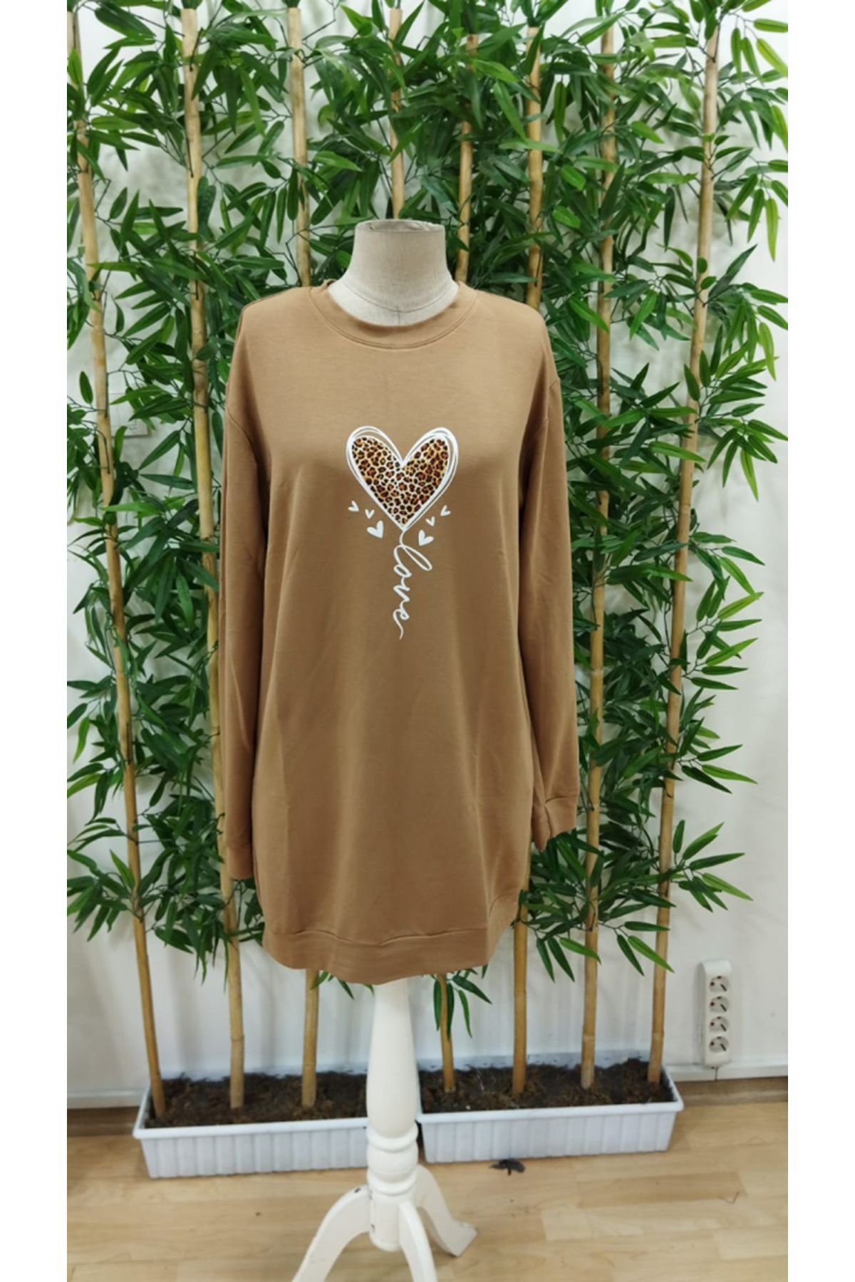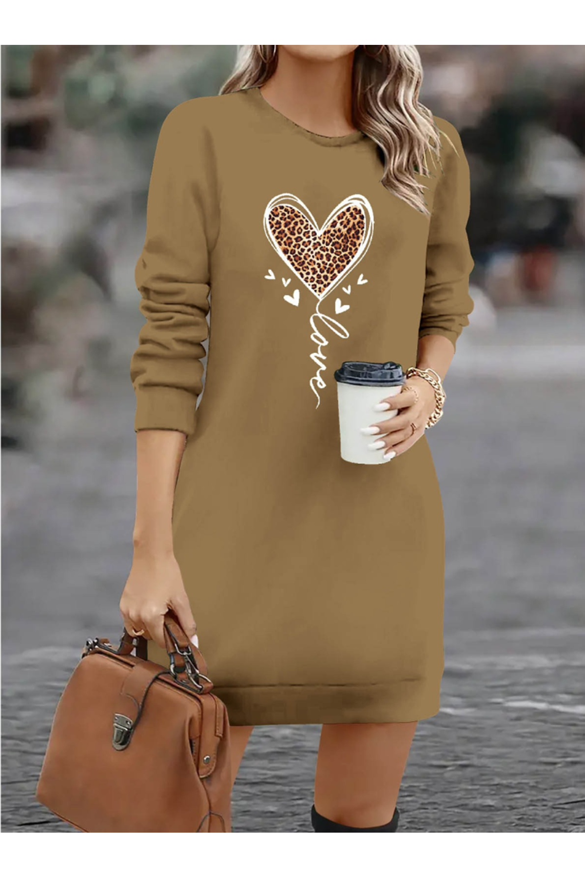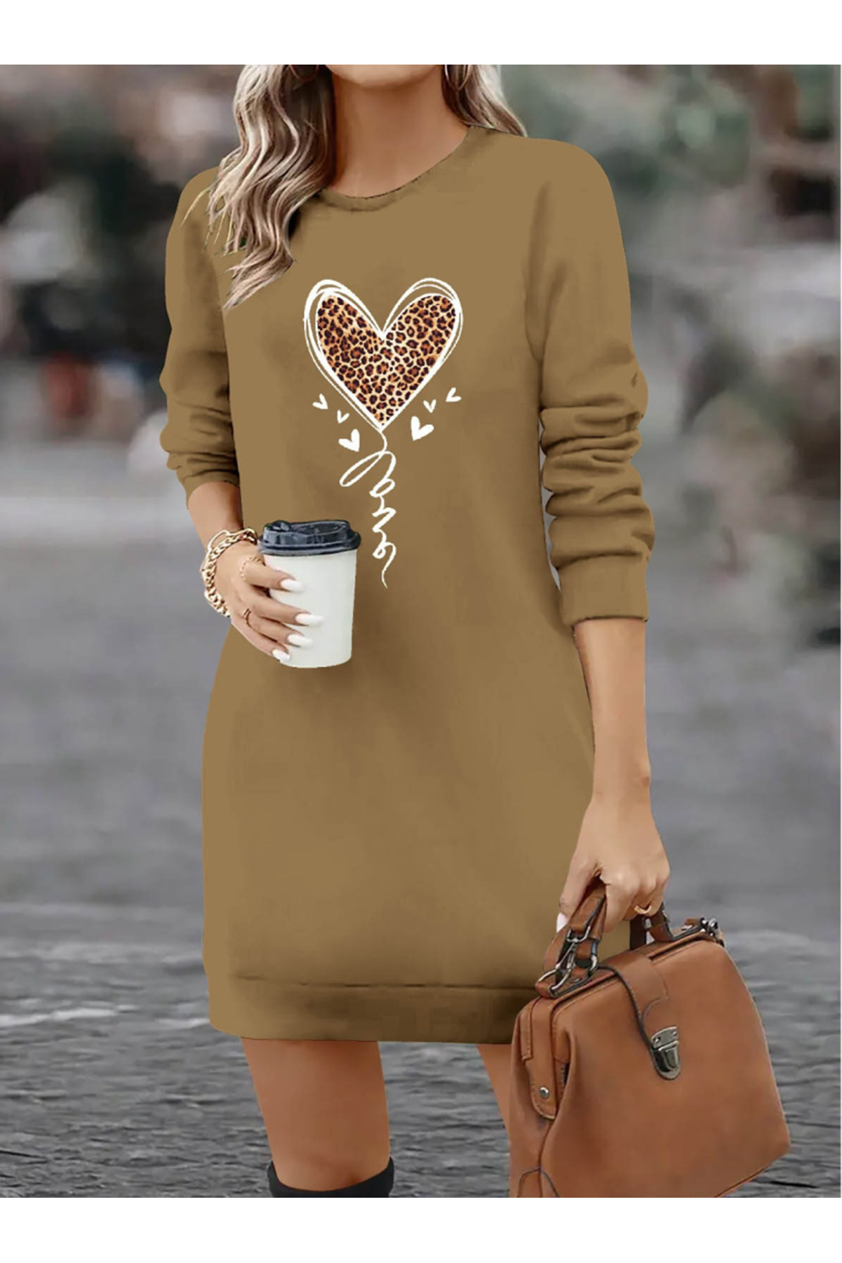 Kadın Uzun Kollu Bisiklet Yaka Kalp Desenli Kısa Viskon Elbise