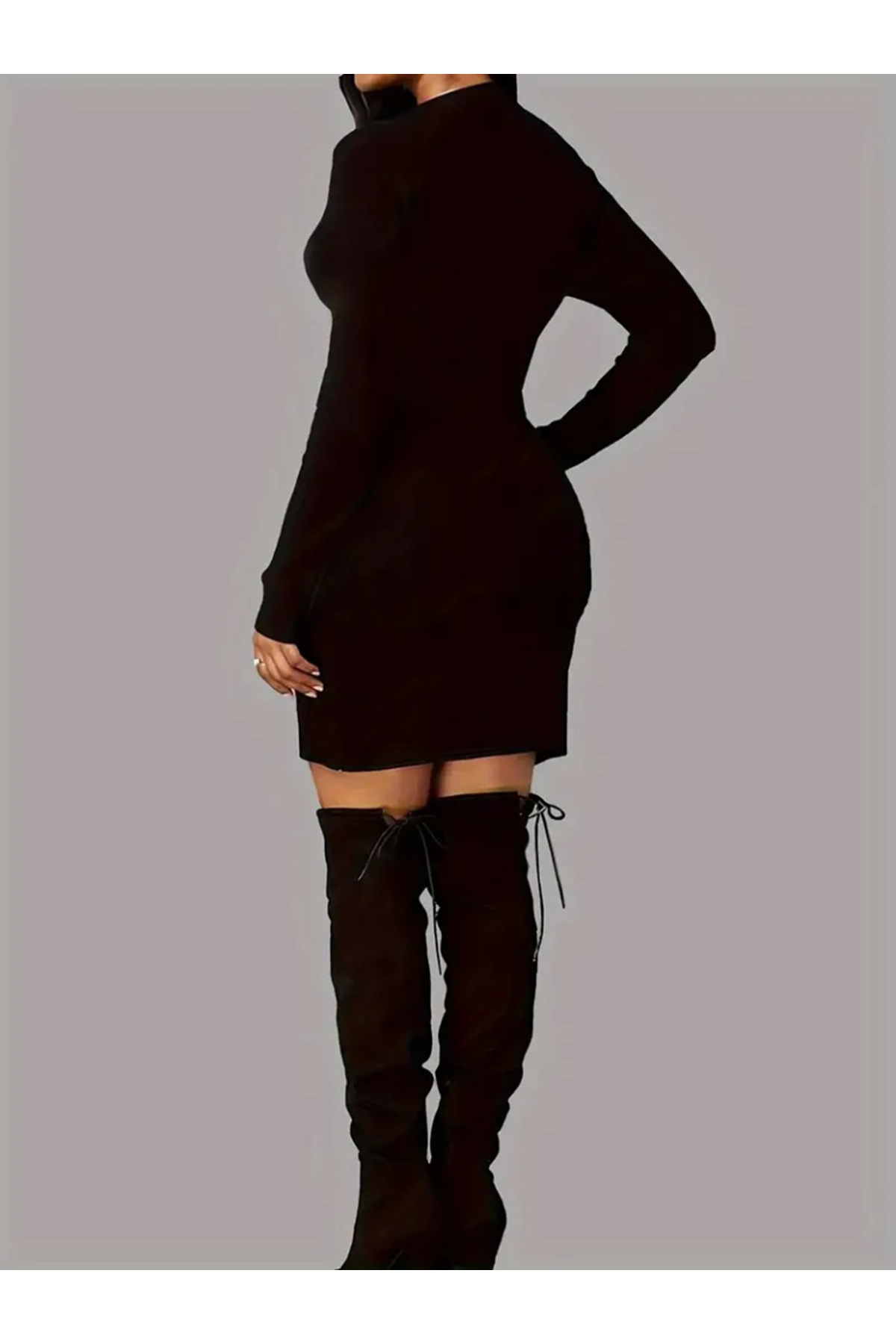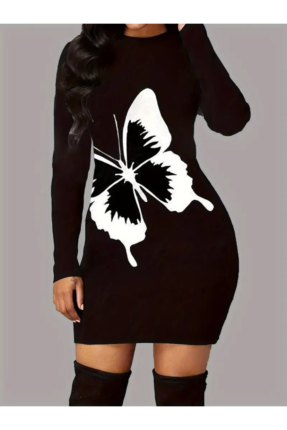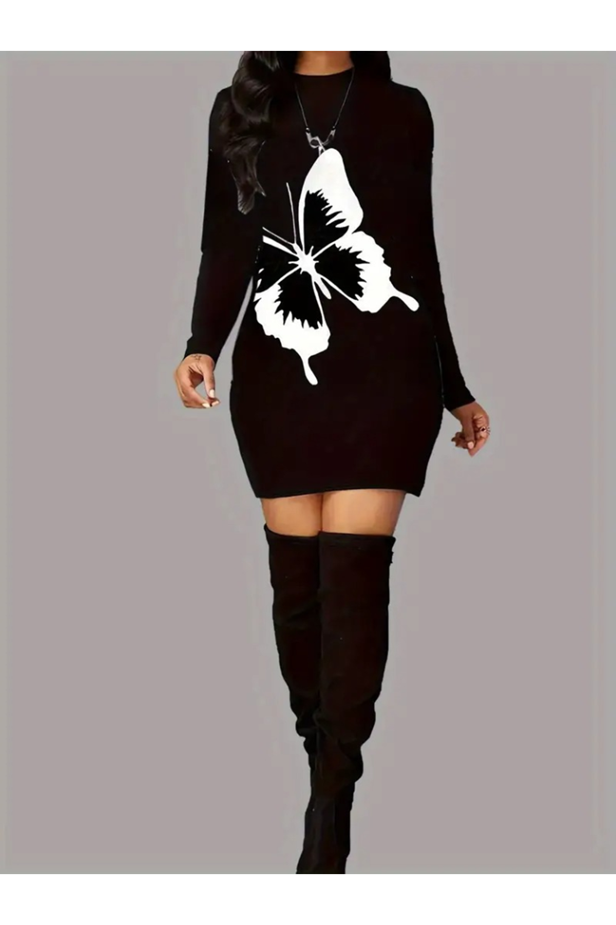 Kadın Uzun Kollu Bisiklet Yaka Kelebek Desenli Kısa Viskon Iki Iplik Elbise