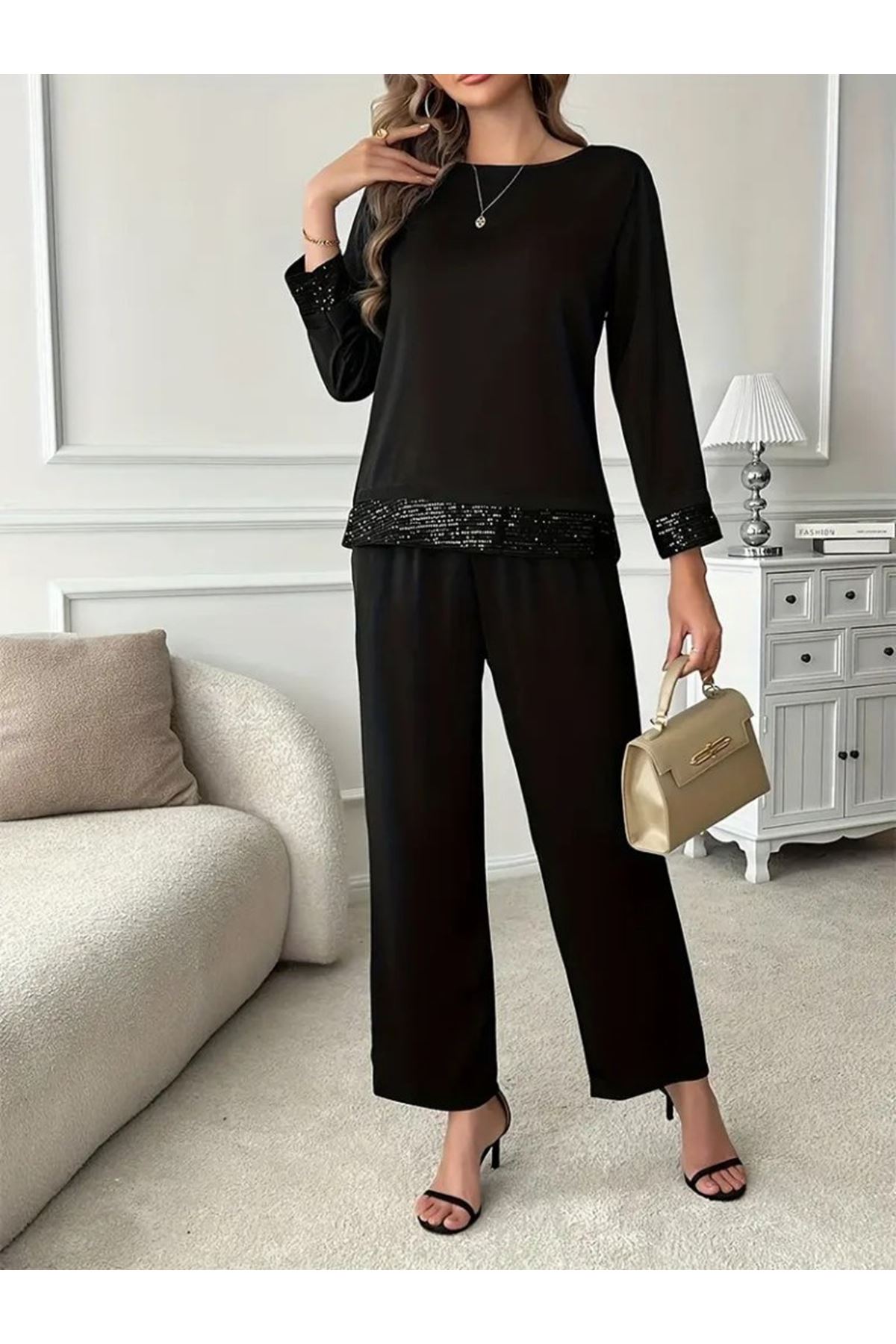 Kadın Uzun Kollu Bisiklet Yaka Pulpayetli Viskon Iki Iplik Bluz Ve Pantolon Ikili Takım