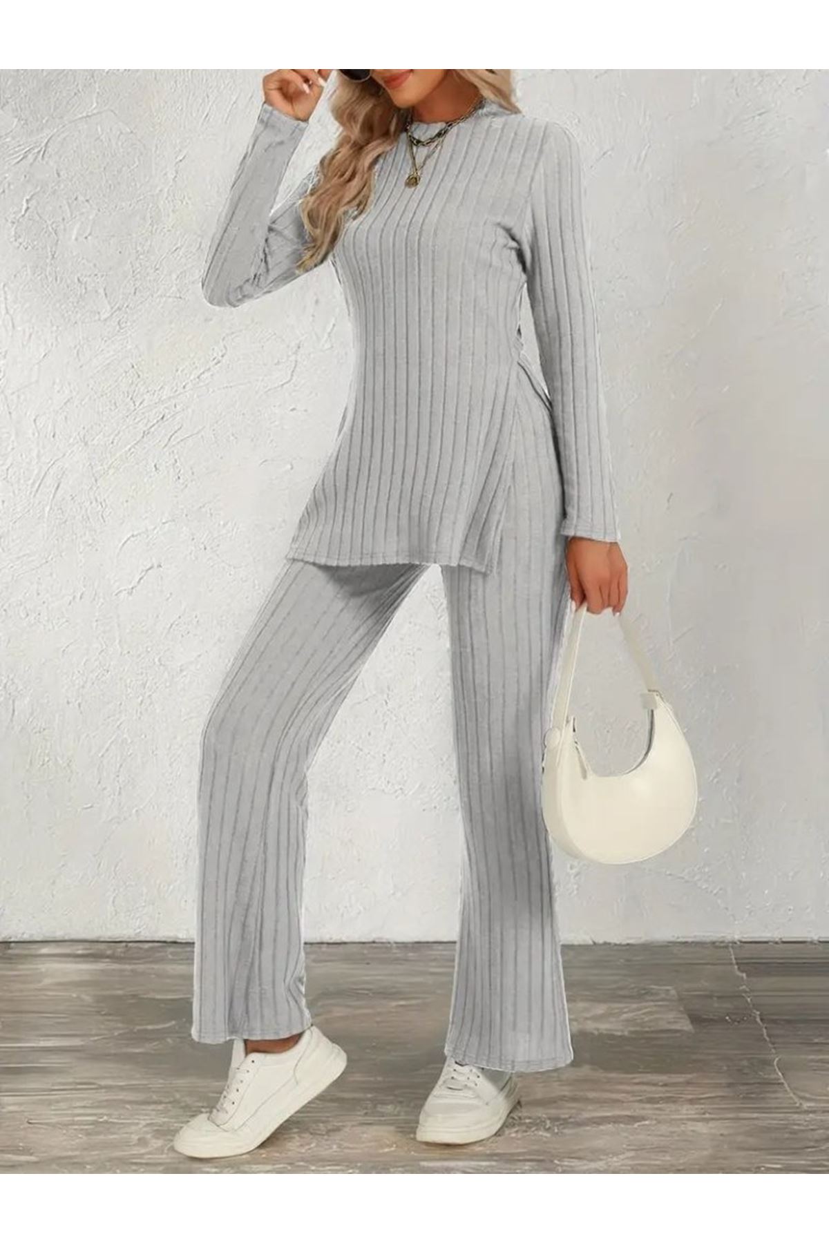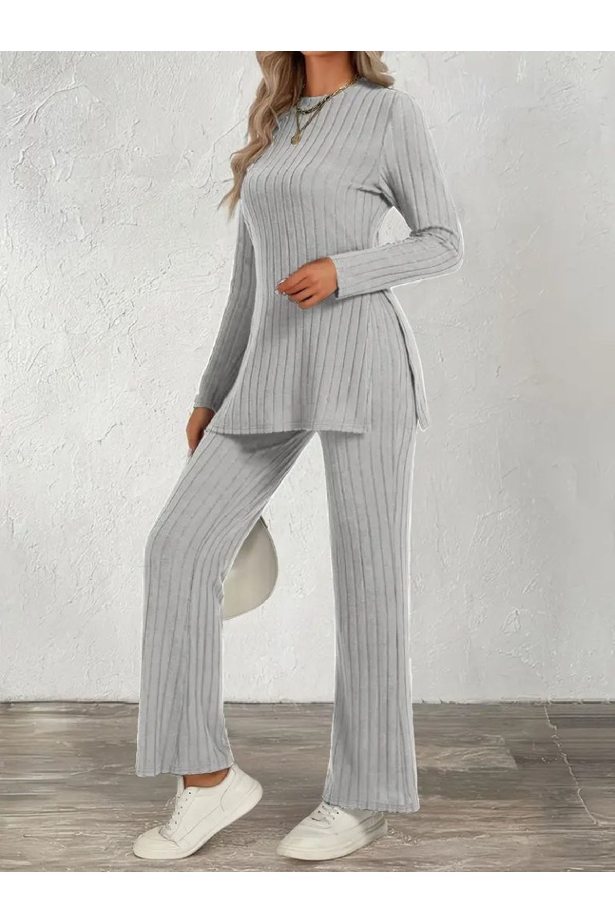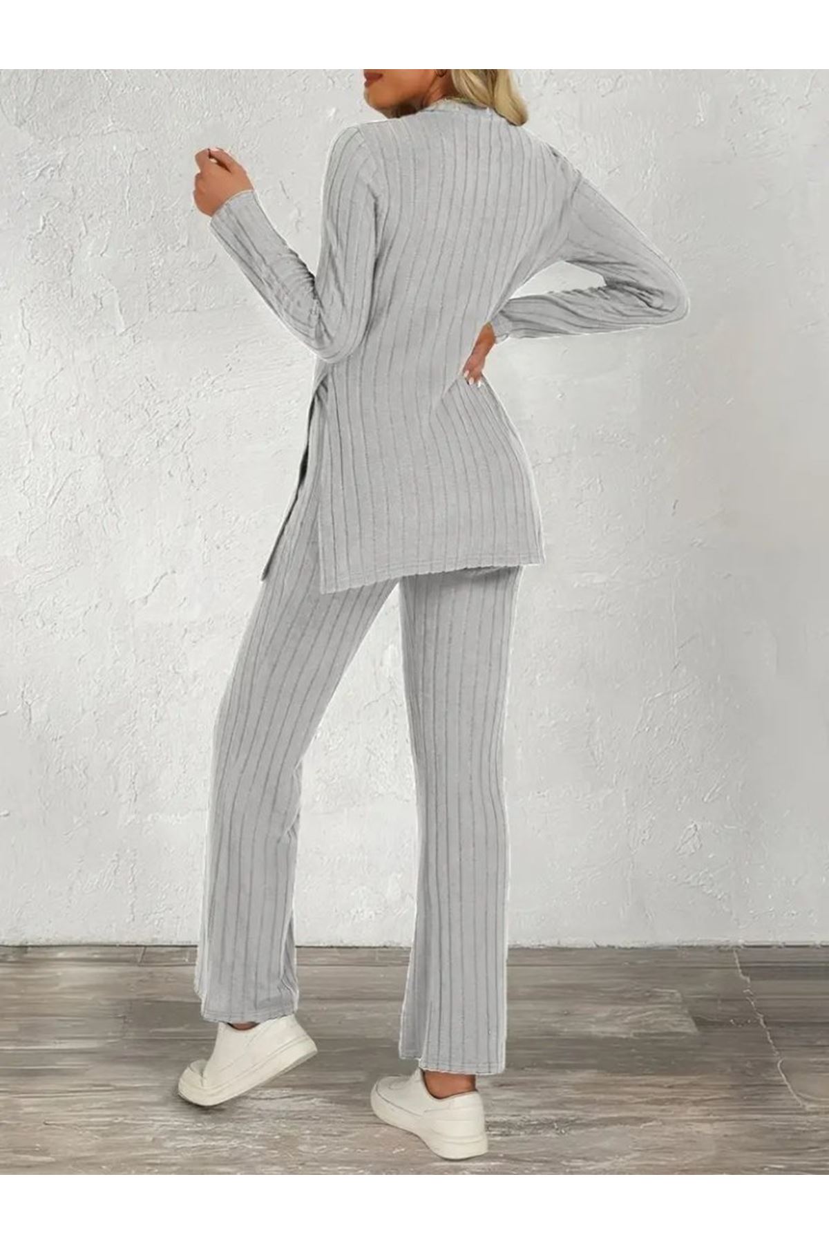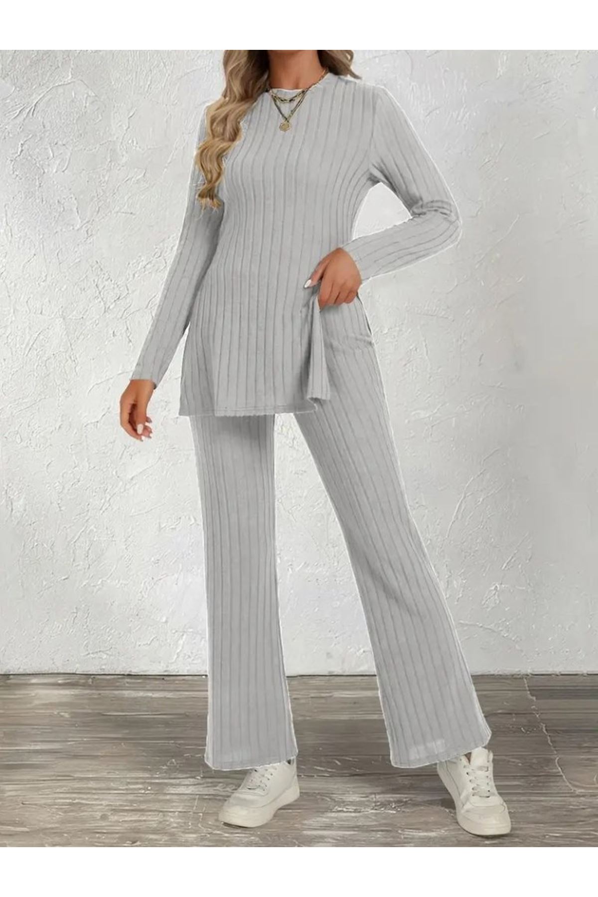 Kadın Uzun Kollu Bisiklet Yaka Yandan Yırtmaçlı şardonlu Kaşkorse Bluz Ve Pantolon Ikili Takım