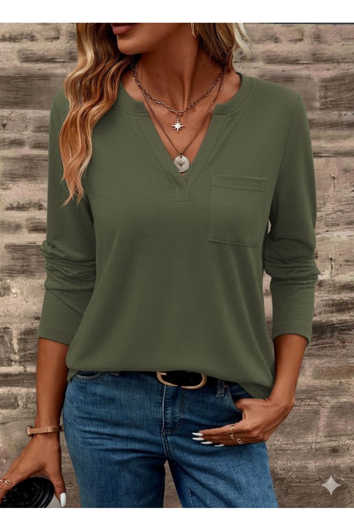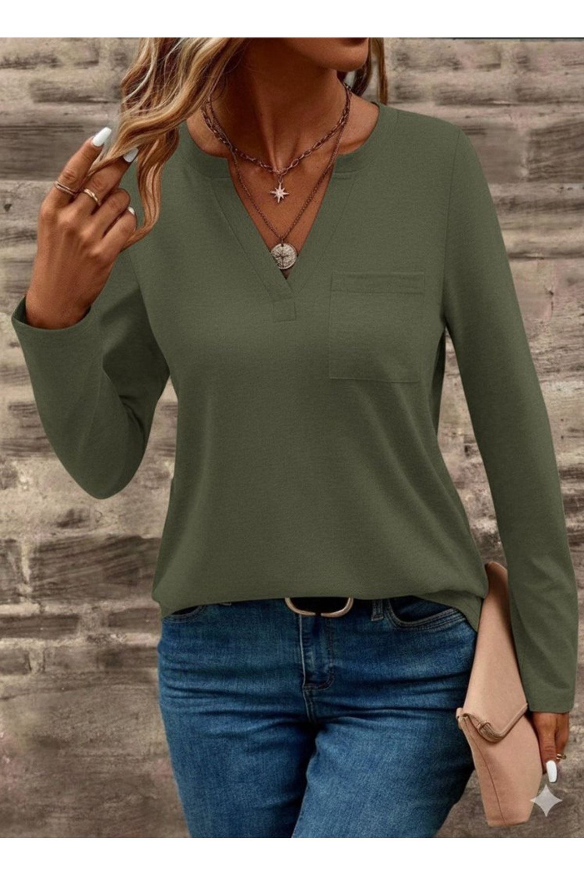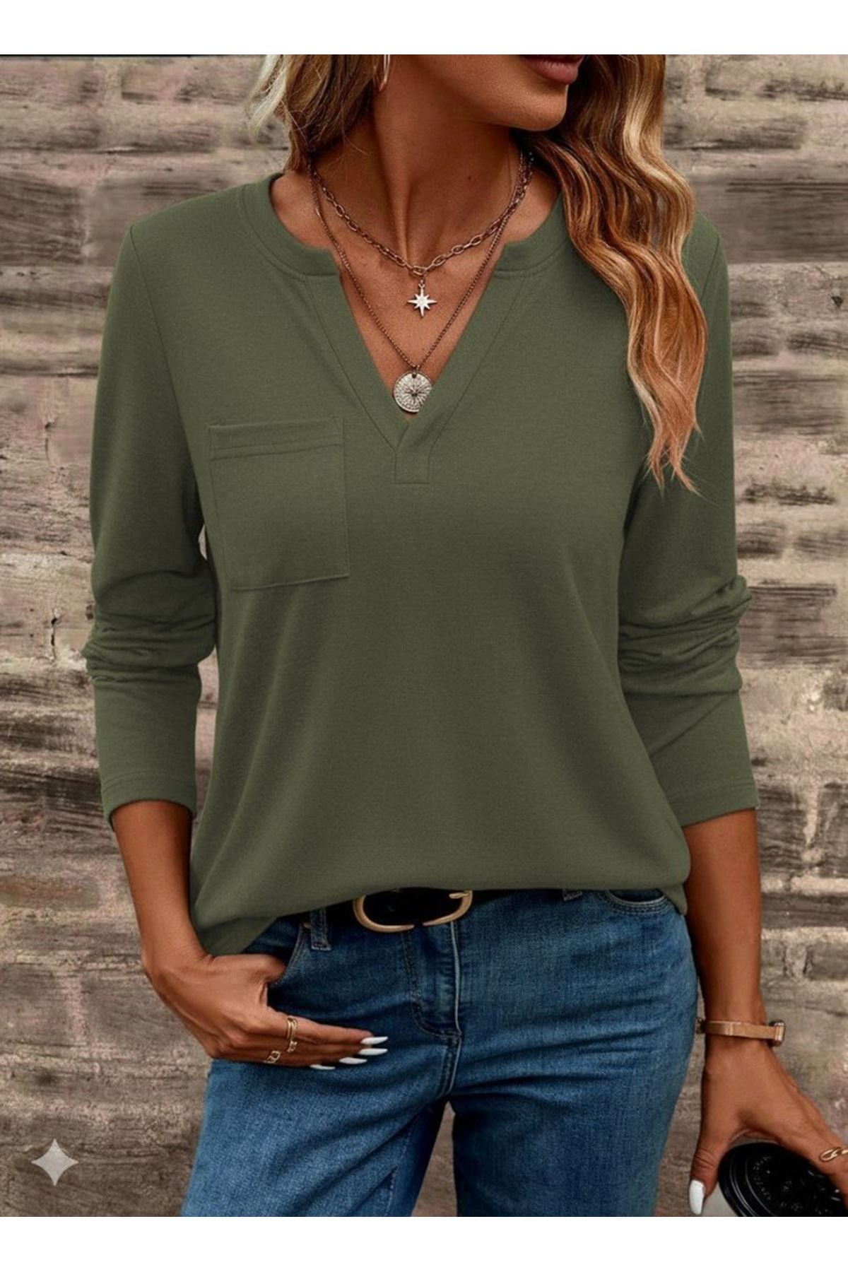 Kadın Uzun Kollu Cepli V Yakalı Viskon Iki Iplik Bluz