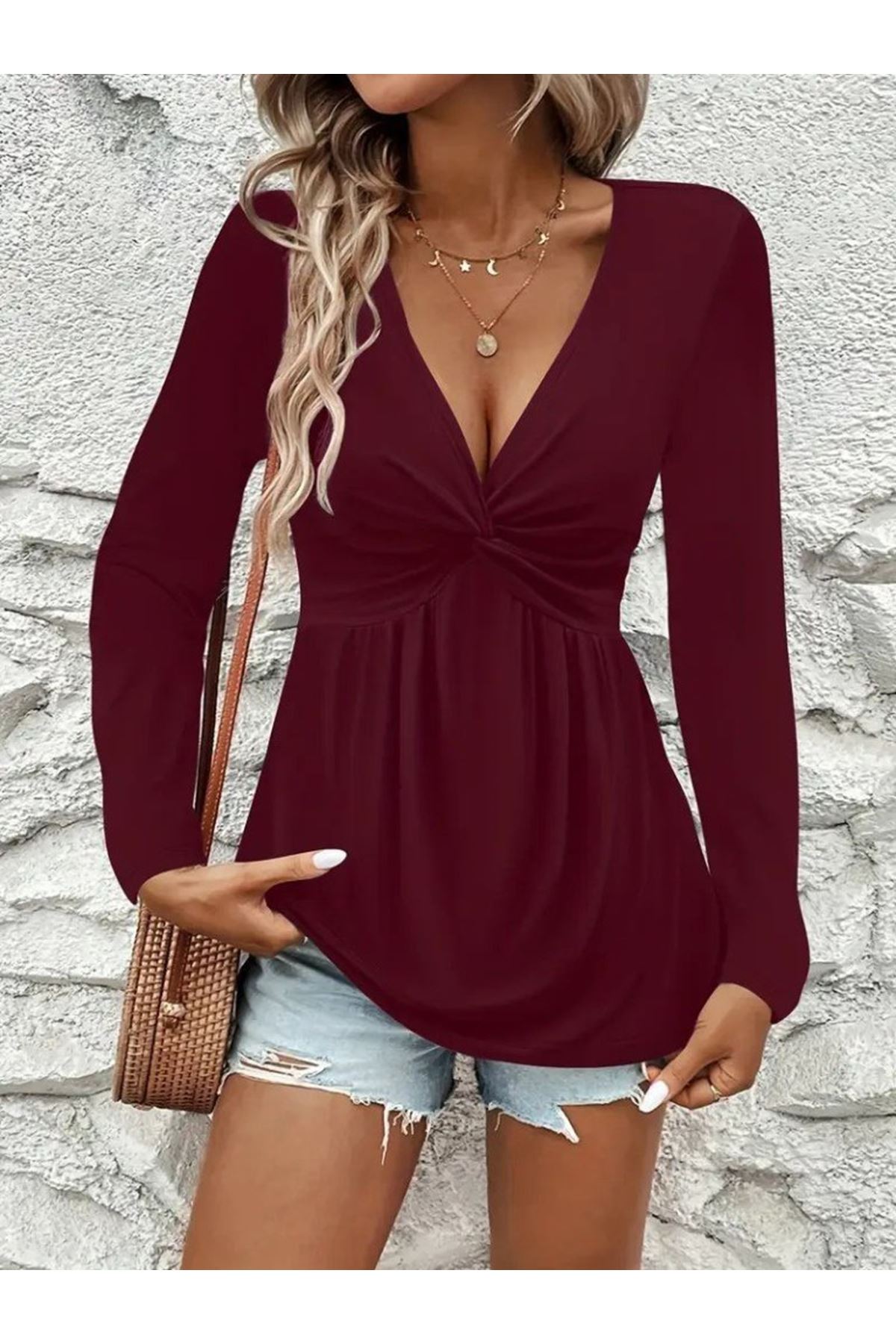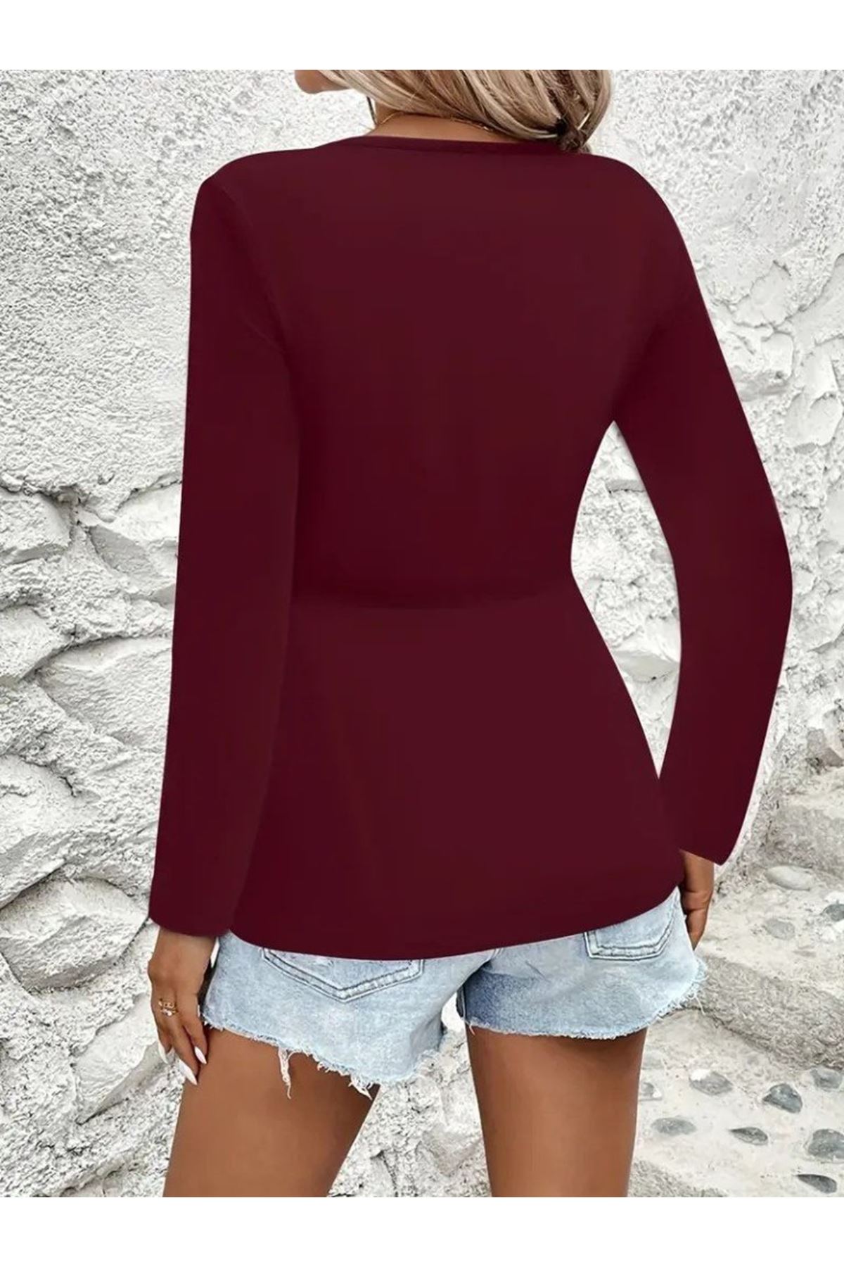 Kadın Uzun Kollu Dekolteli Sarmal Detaylı Viskon Bluz