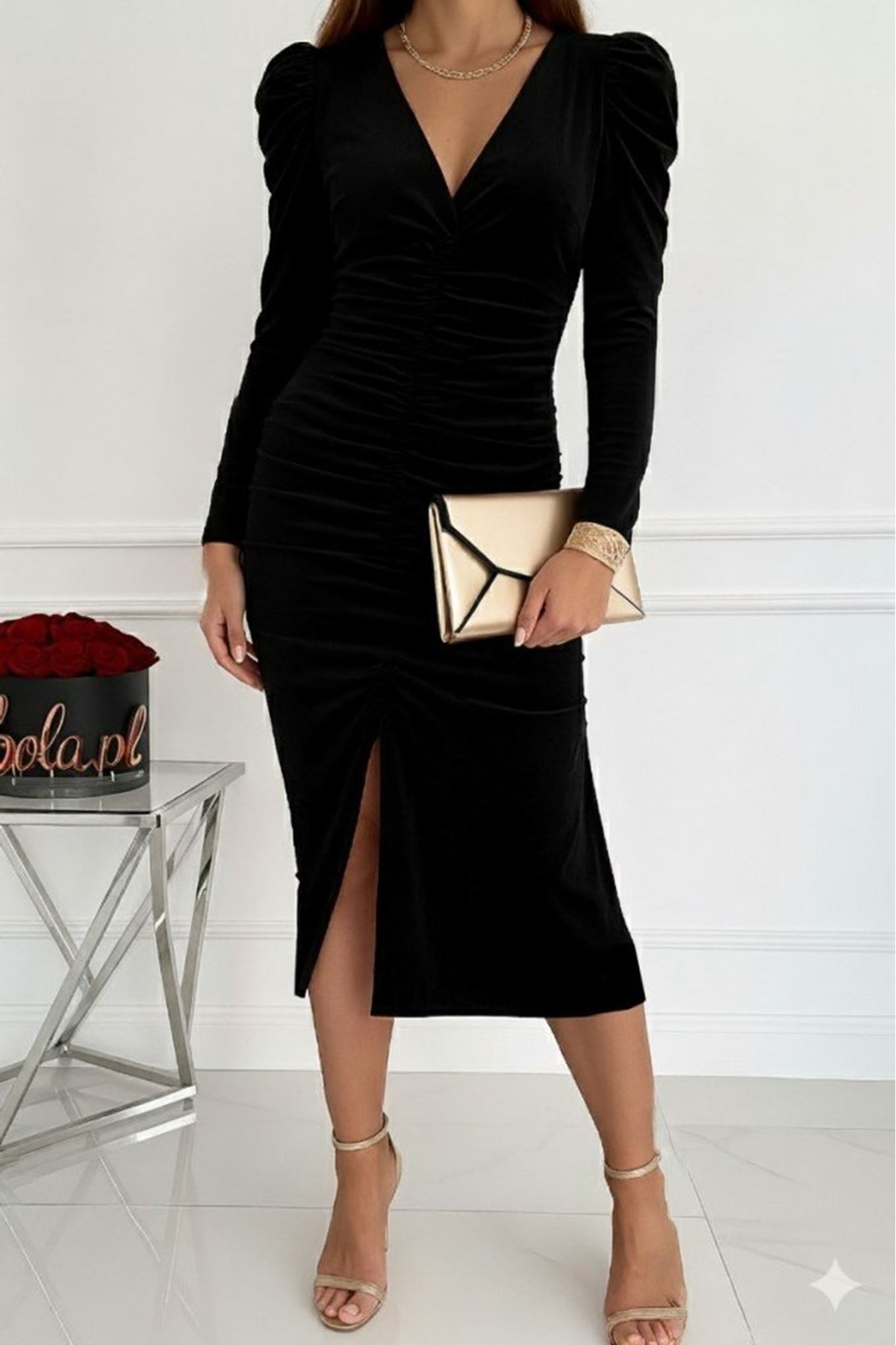 Kadın Uzun Kollu Derin Kruvaze Yakalı önden Büzgülü Yırtmaç Detaylı Kadife Midi Elbise