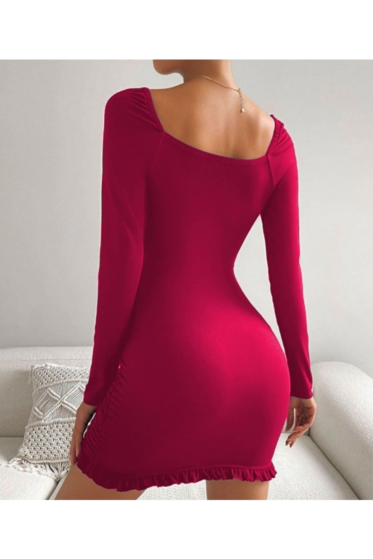 Kadın Uzun Kollu Derin V Yaka Göğüs Altı Dekolte Detay Etek Ucu Fırfırlı Sandy Mini Boy Elbise