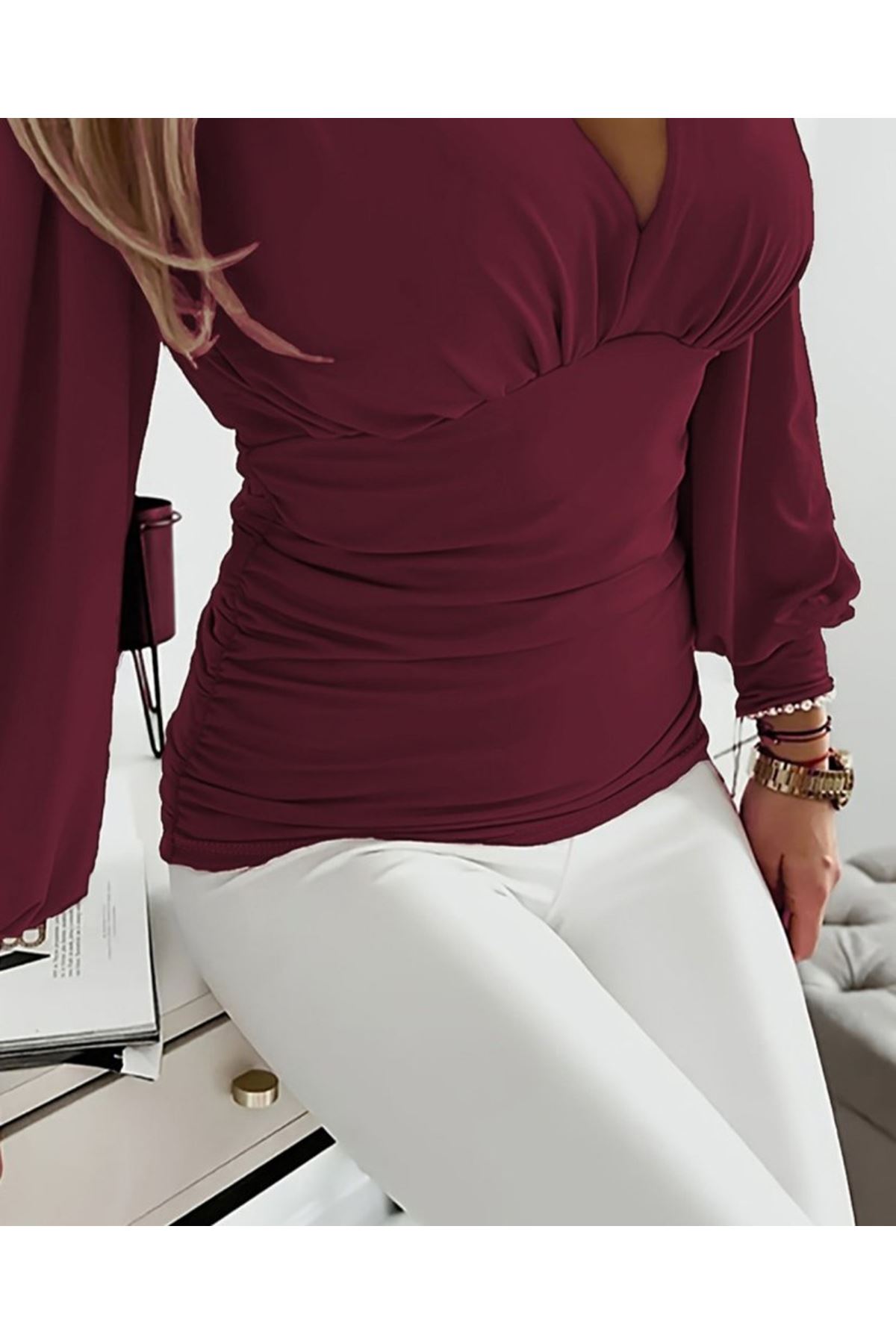 Kadın Uzun Kollu Derin V Yakalı önden Büzgülü Sandy Bluz