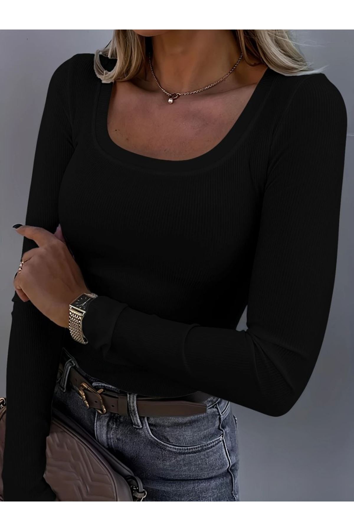 Kadın Uzun Kollu Derin Yuvarlak Yaka Kaşkorse Bluz