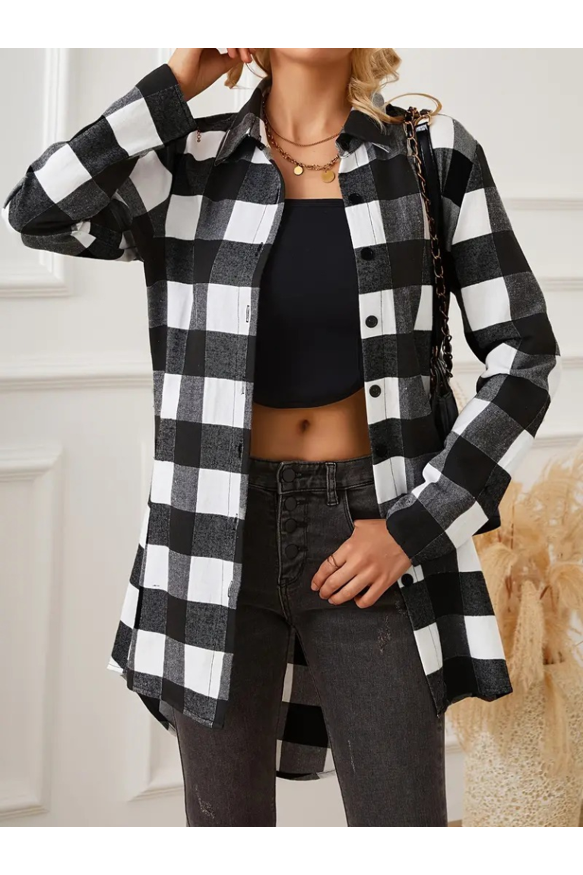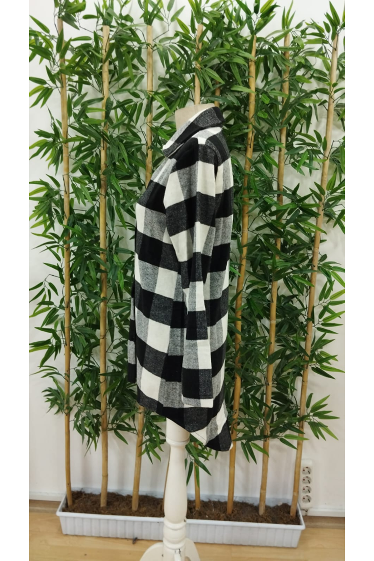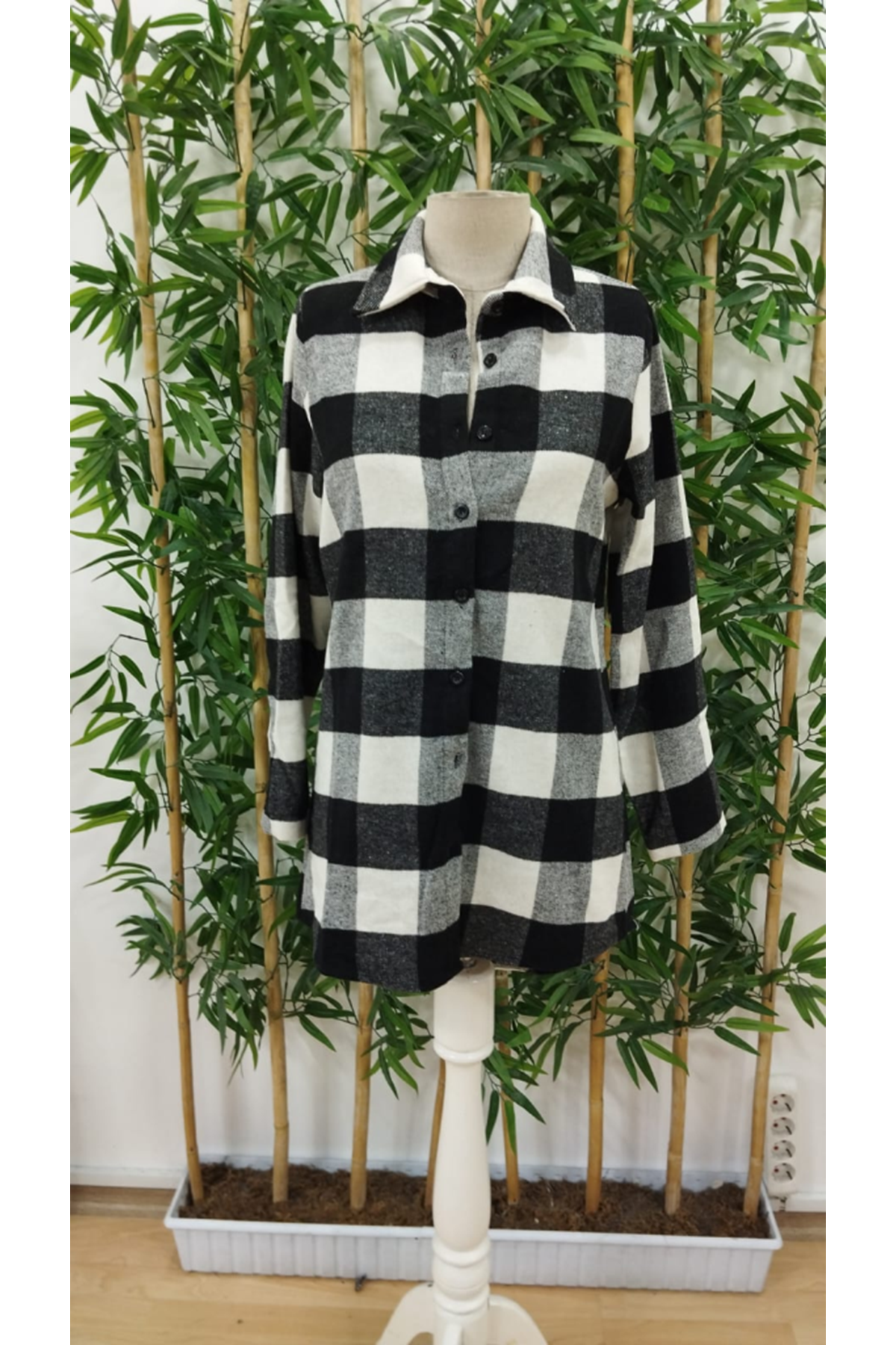 Kadın Uzun Kollu Ekoseli önden Düğmeli Dokuma Uzun Gömlek
